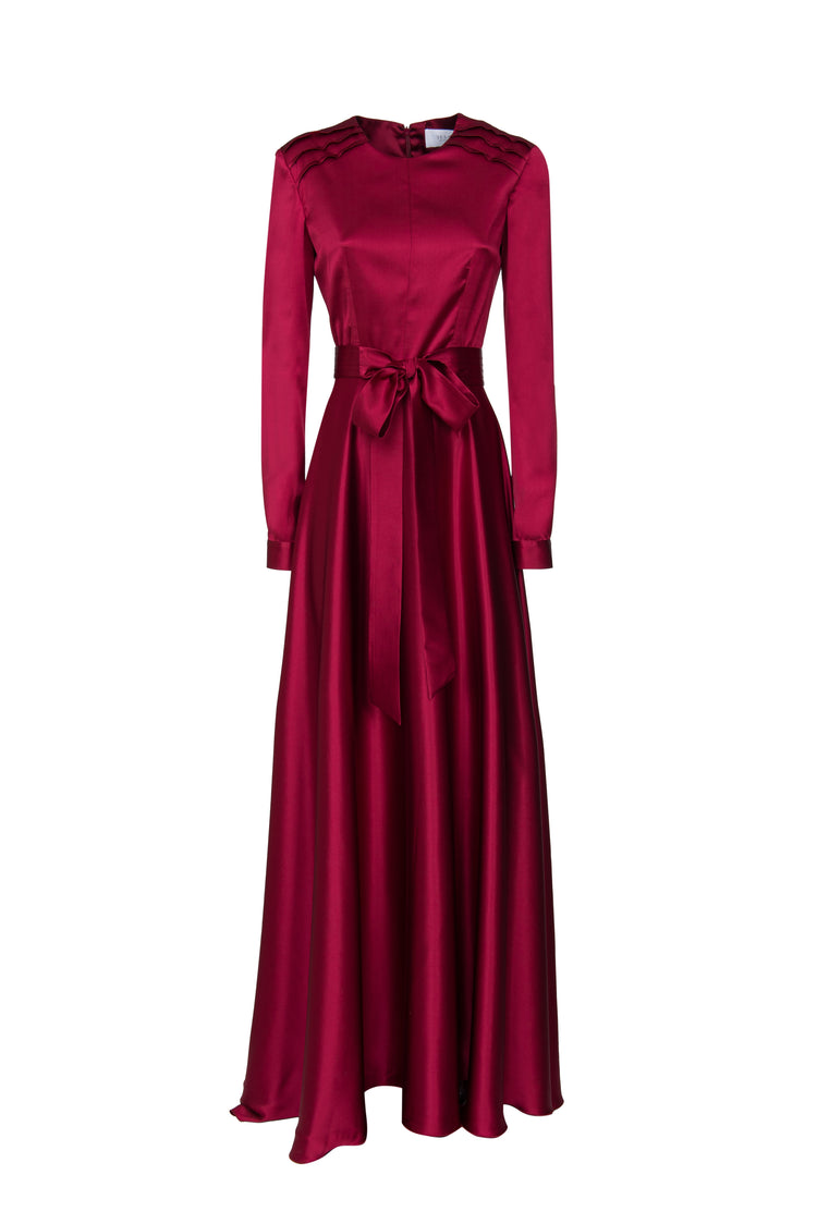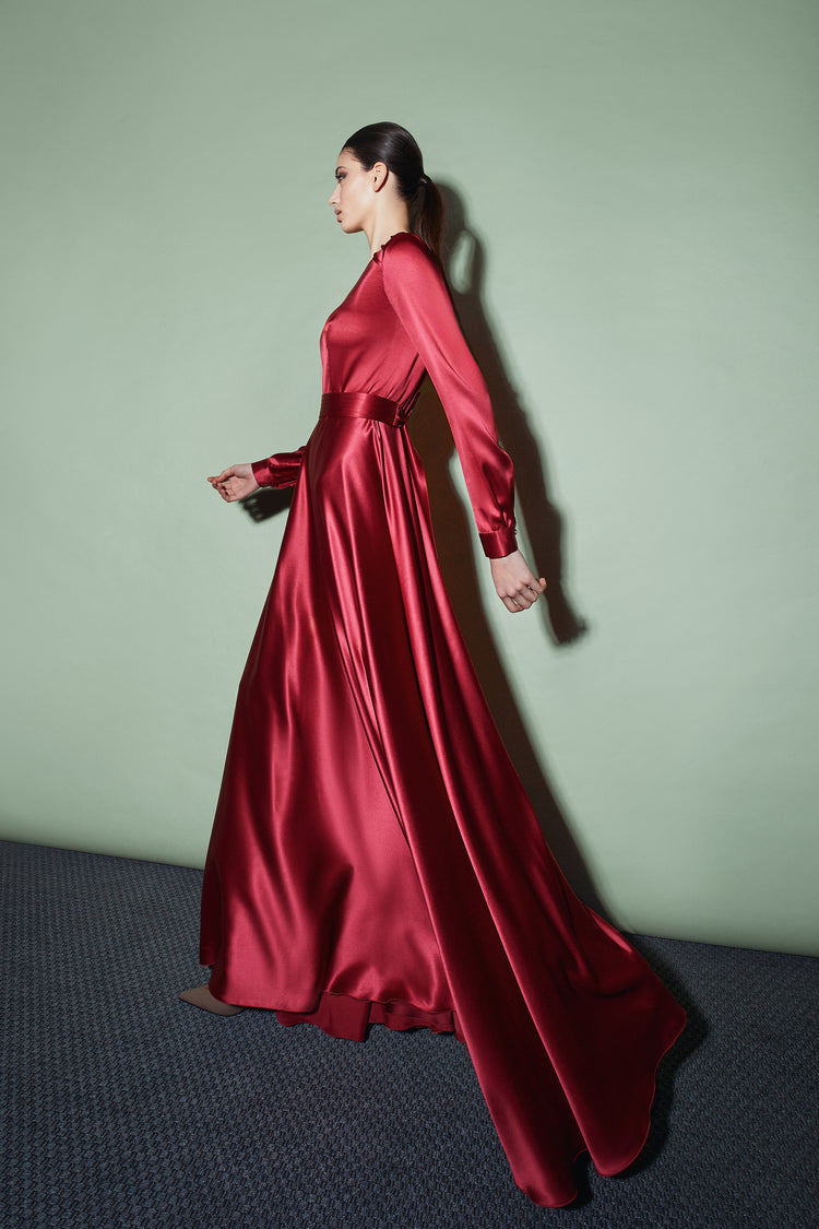 Descrizione:Abito in seta satin , taglio in vita , pieghe sul profilo spalle , cintura in vita, chiusura centro dietro.