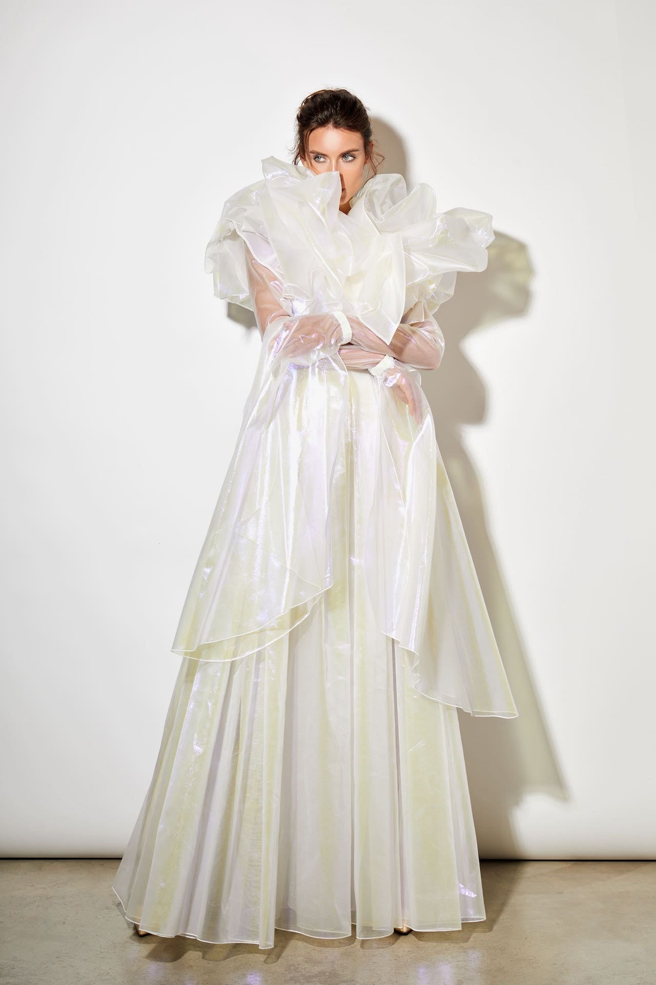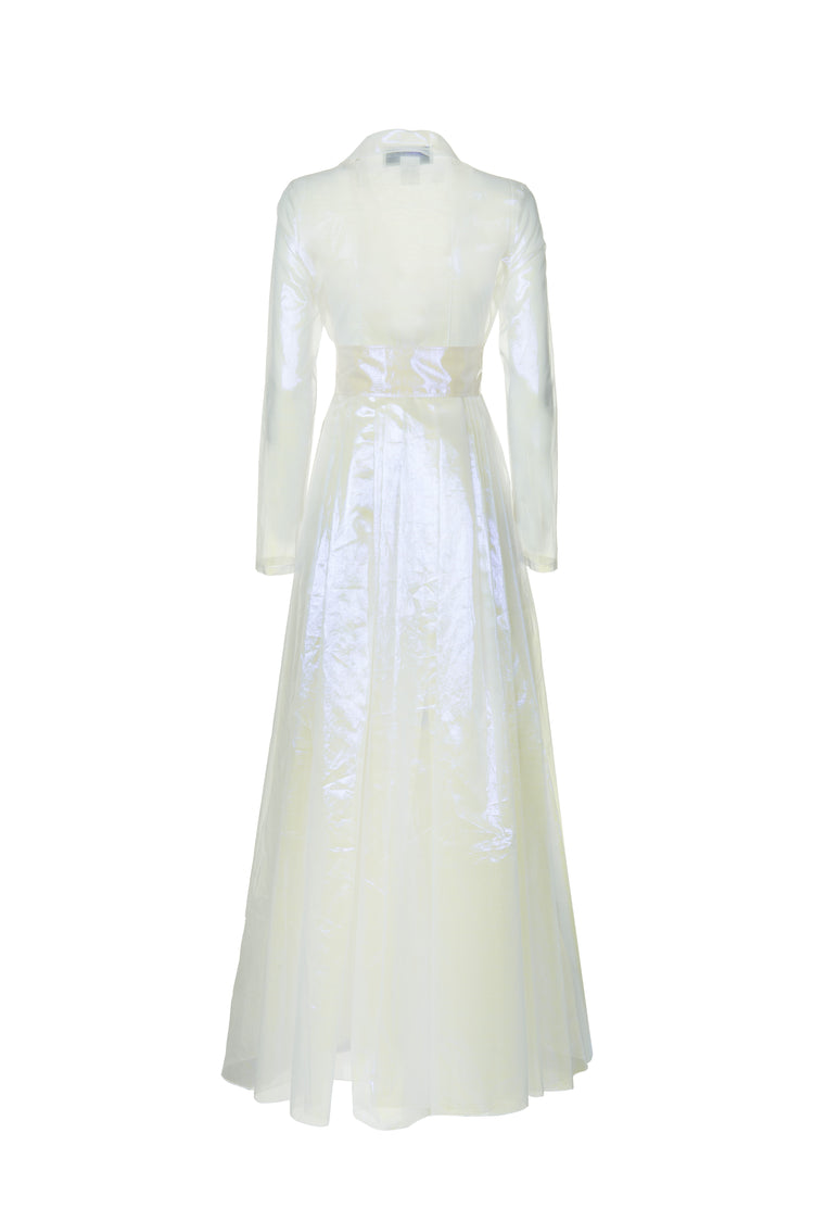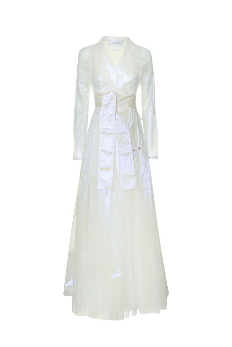Abito lungo incrociato in vita in organza cangiante, corpetto con collo a lancia asimmetrico, gonna ampia montata con pieghe piatte sovrapposte.