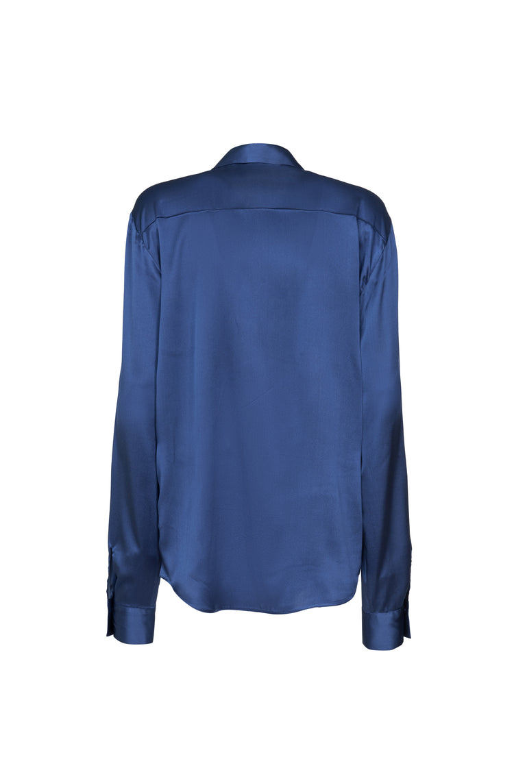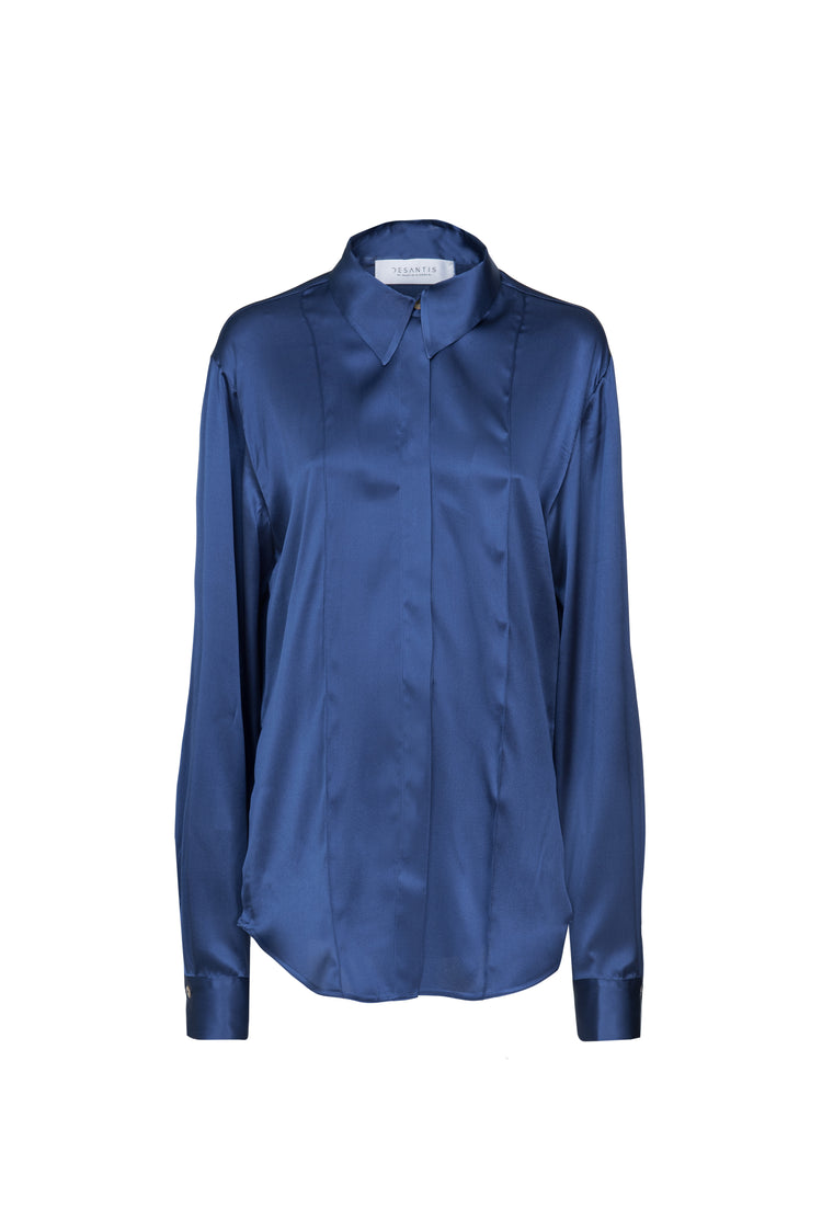 Camicia in pregiato raso di seta stretch, caratterizzata da una linea diritta e pulita che valorizza la figura senza costringerla. Il tessuto, morbido e leggermente elasticizzato, offre un comfort impeccabile e un’elegante lucentezza.