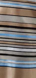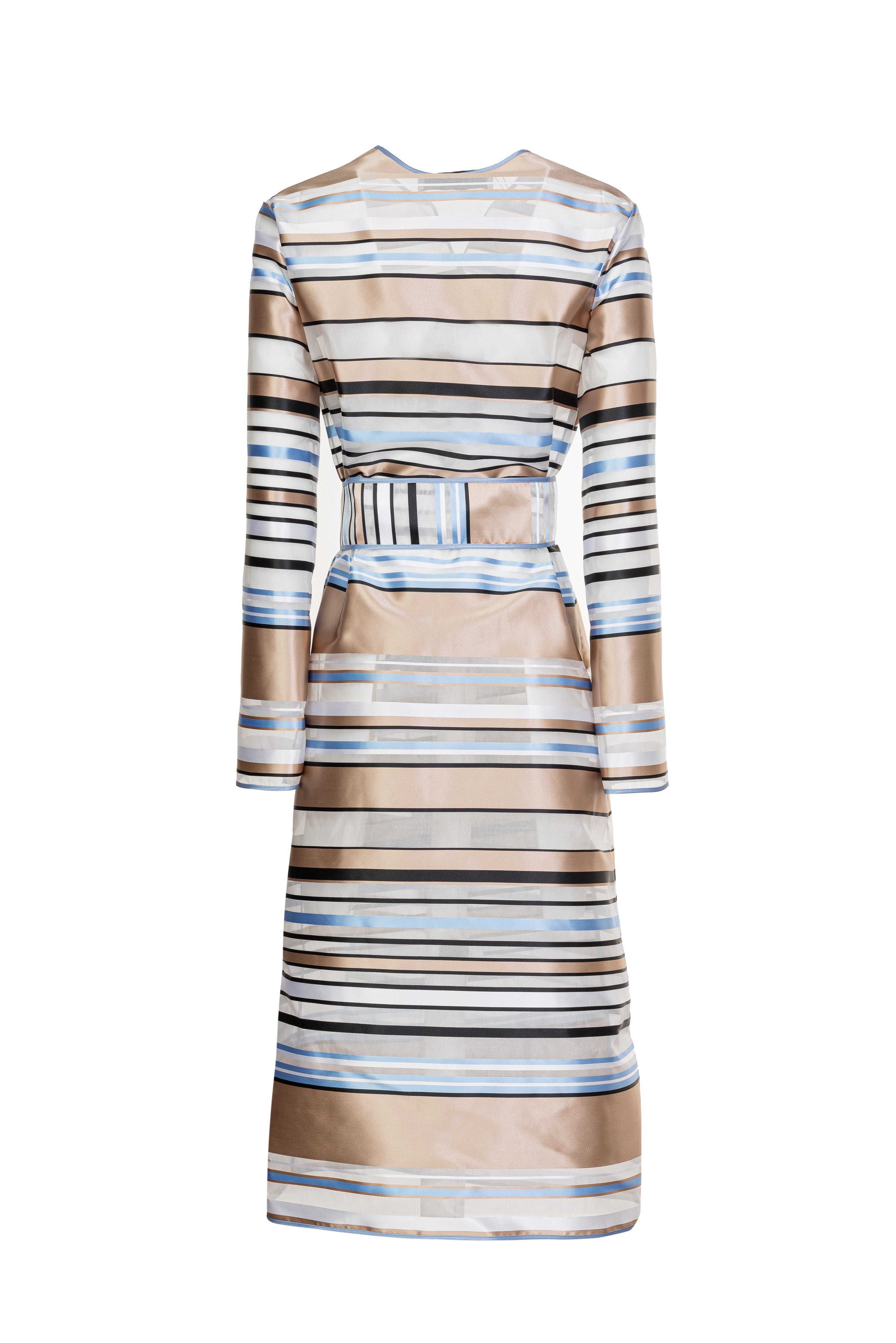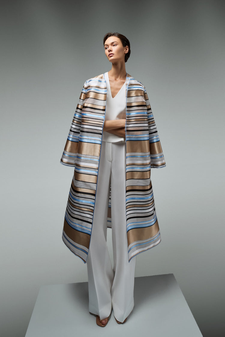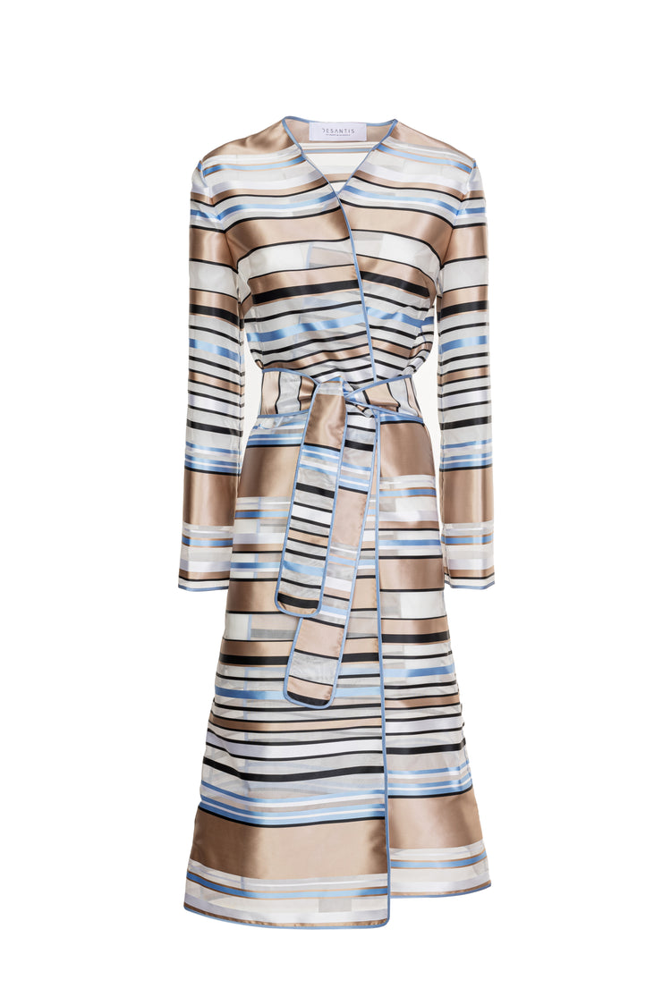 Spolverino dal tessuto strutturato a righe, oro, azzurro, nero, bianco e trasparente. Questo abbigliamento unico combina colori che creano un effetto visivo affascinante. La struttura del tessuto aggiunge un tocco di raffinatezza al design. Perfetto per chi ama abbinamenti distintivi.