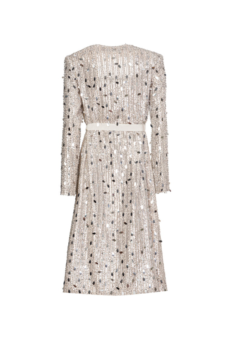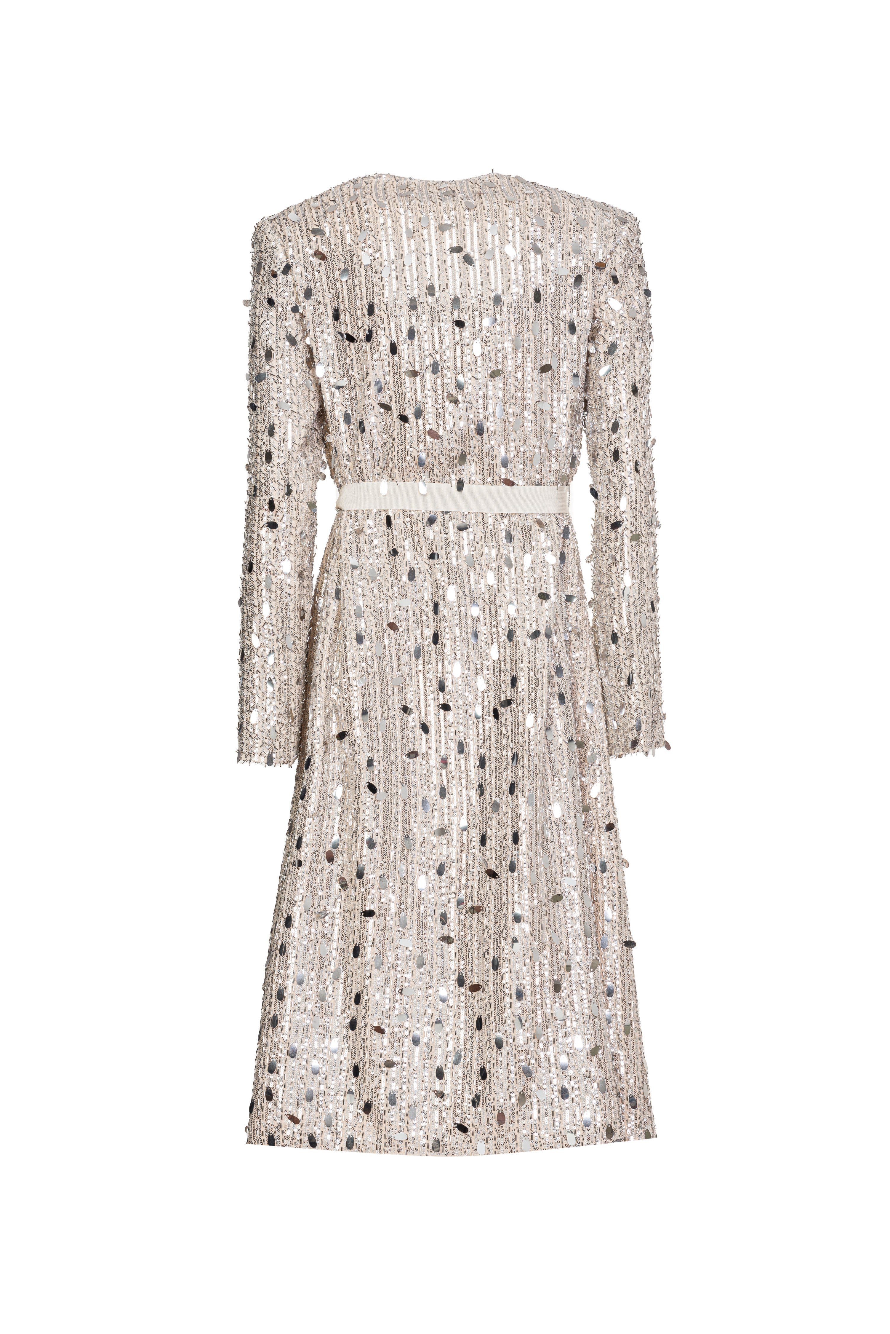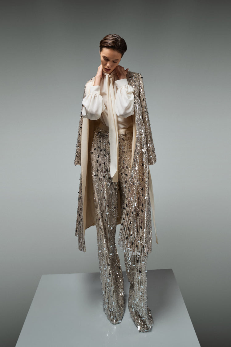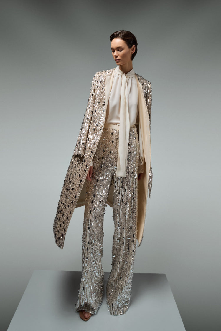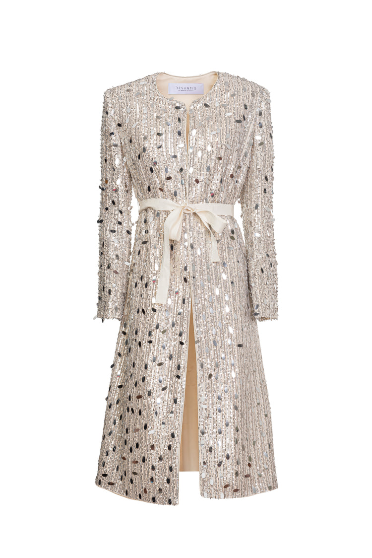Spolverino elegante, con una linea dritta e maniche lunghe. I dettagli sono arricchiti da paillettes argento che donano un tocco di brillantezza. Perfetto per occasioni speciali, questo spolverino si distingue per la sua semplicità e raffinatezza. La cintura rimovibile offre flessibilità nel look.