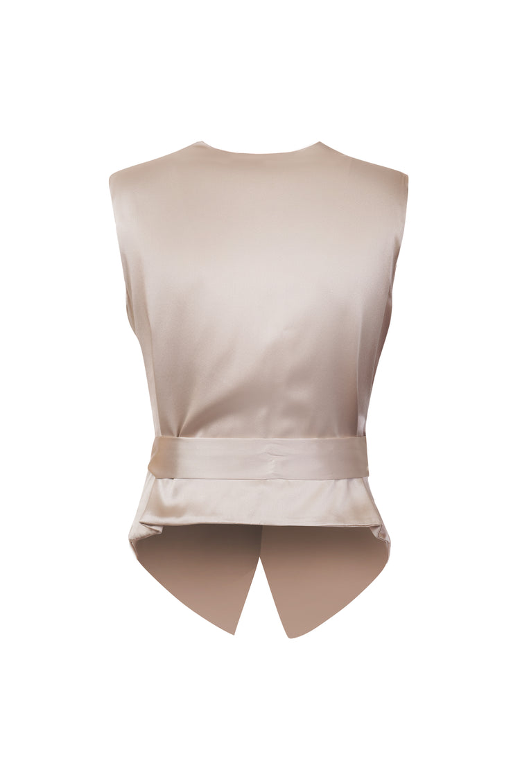 Beige Silk-Detail Vest is a refined women’s piece designed for the SS26 season. This vest combines structure with a fluid, elegant finish.