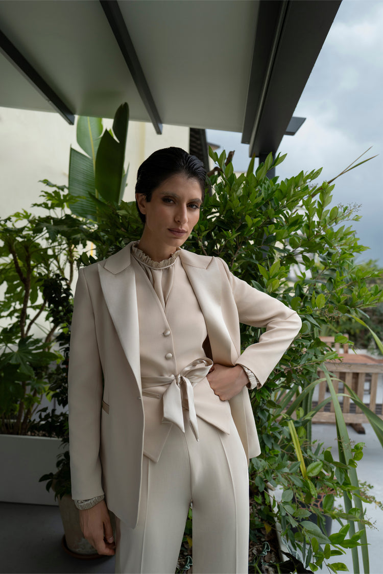 Crafted in a woven blend of 73% acetate and 27% viscose, enhanced by refined details in 100% silk, offering a balance of softness, structure, and subtle luminosity, presented in a soft beige tone - a timeless neutral with an elegant and understated character.