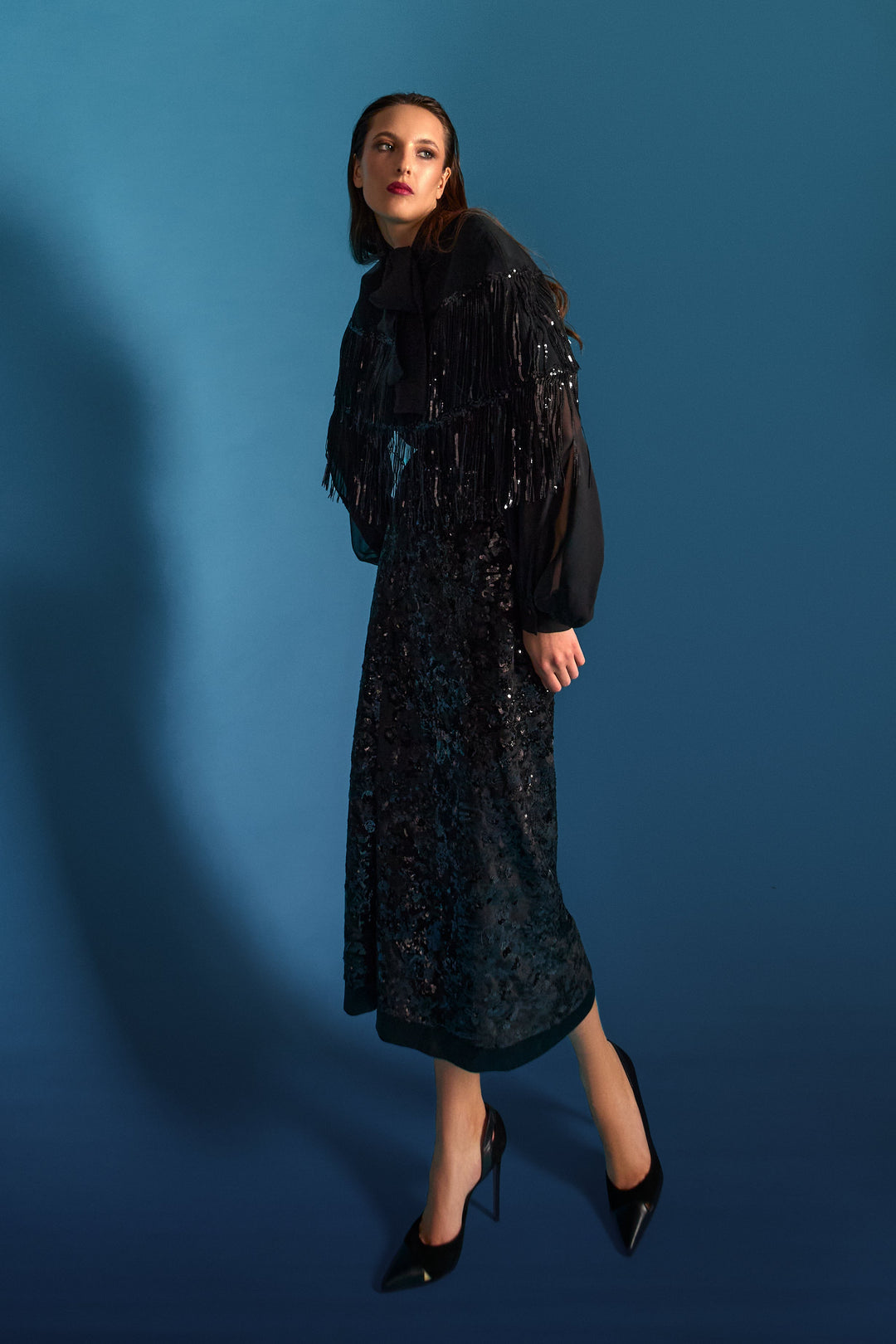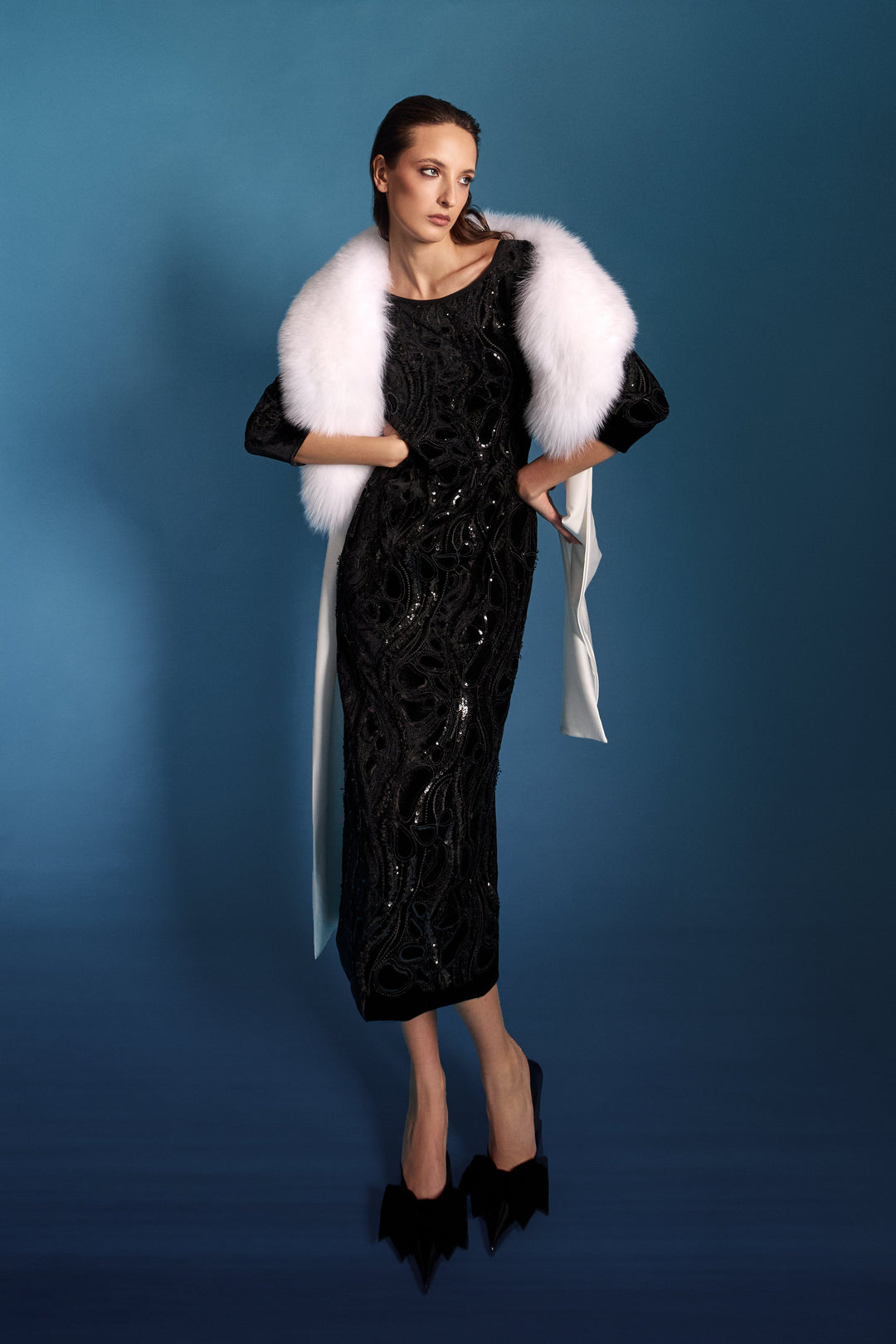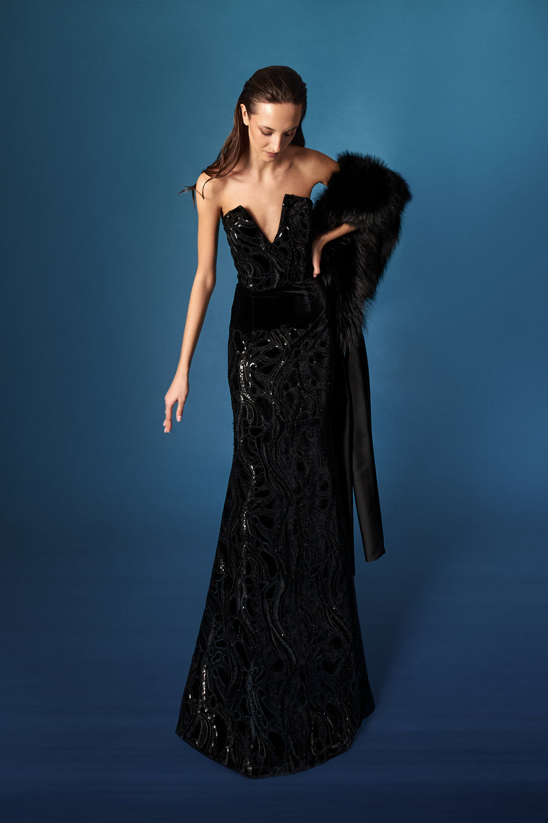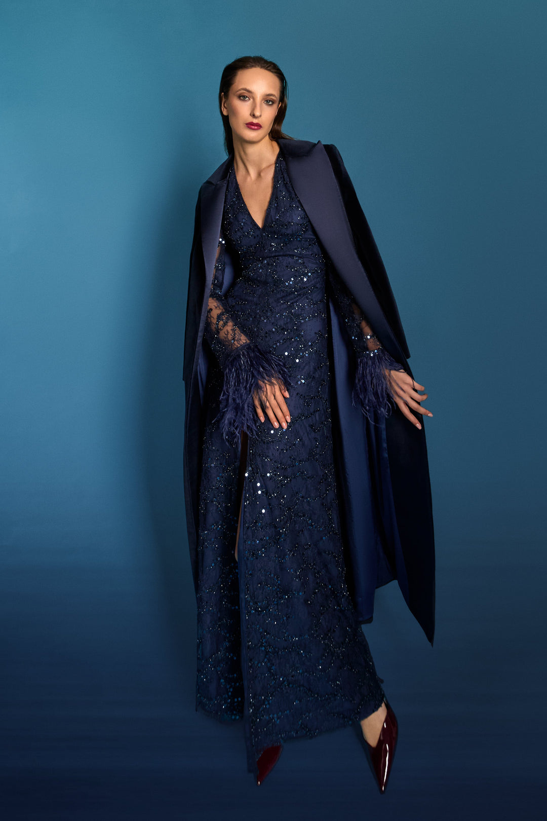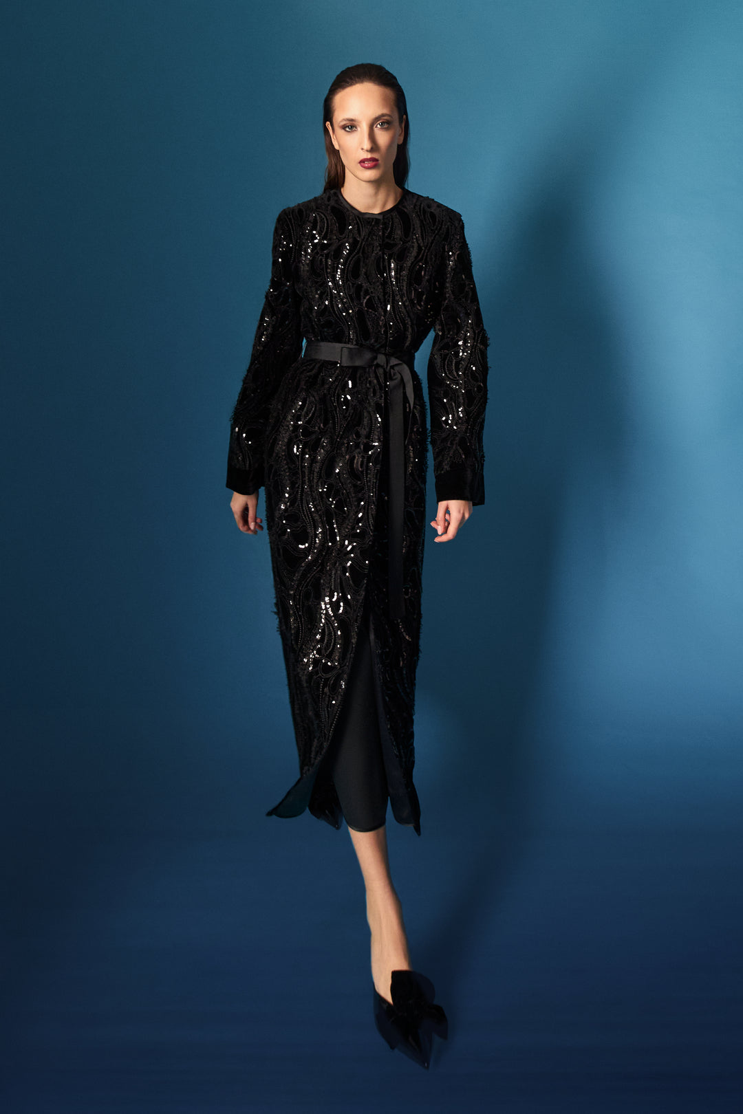 Abito verticale blu oltremare/incrostazioni micro paillettes/cappotto in velluto