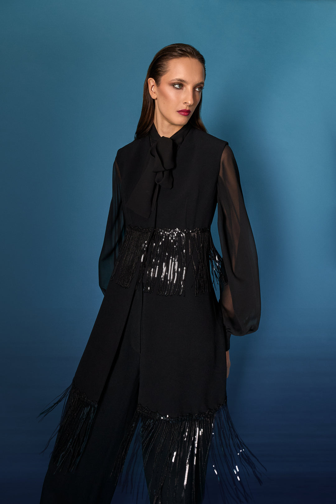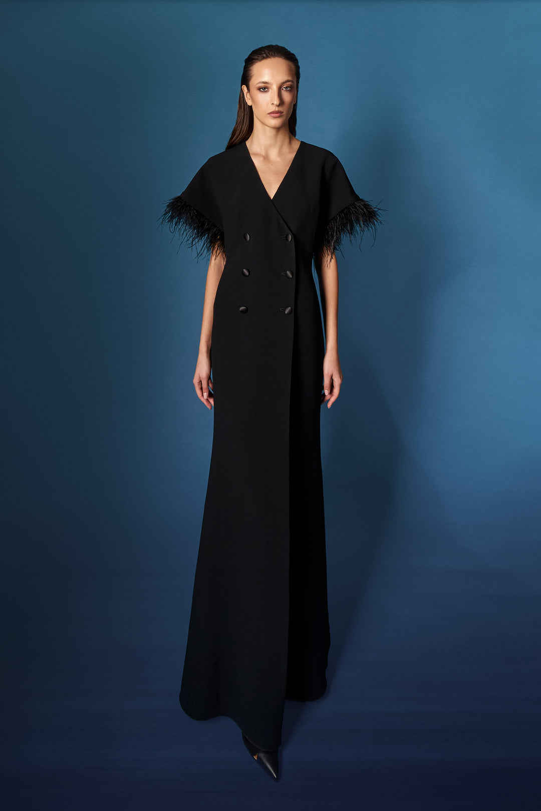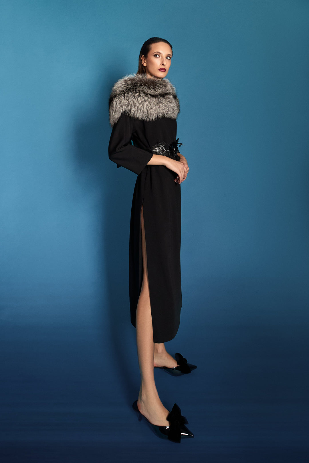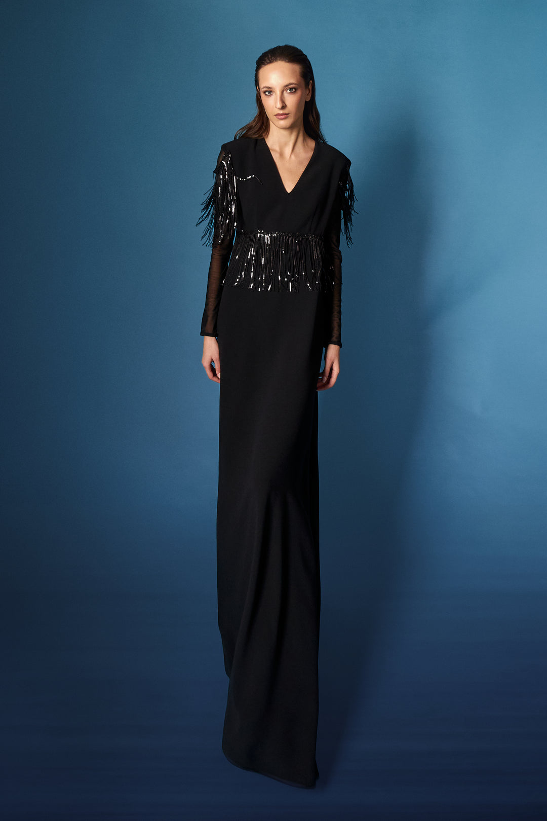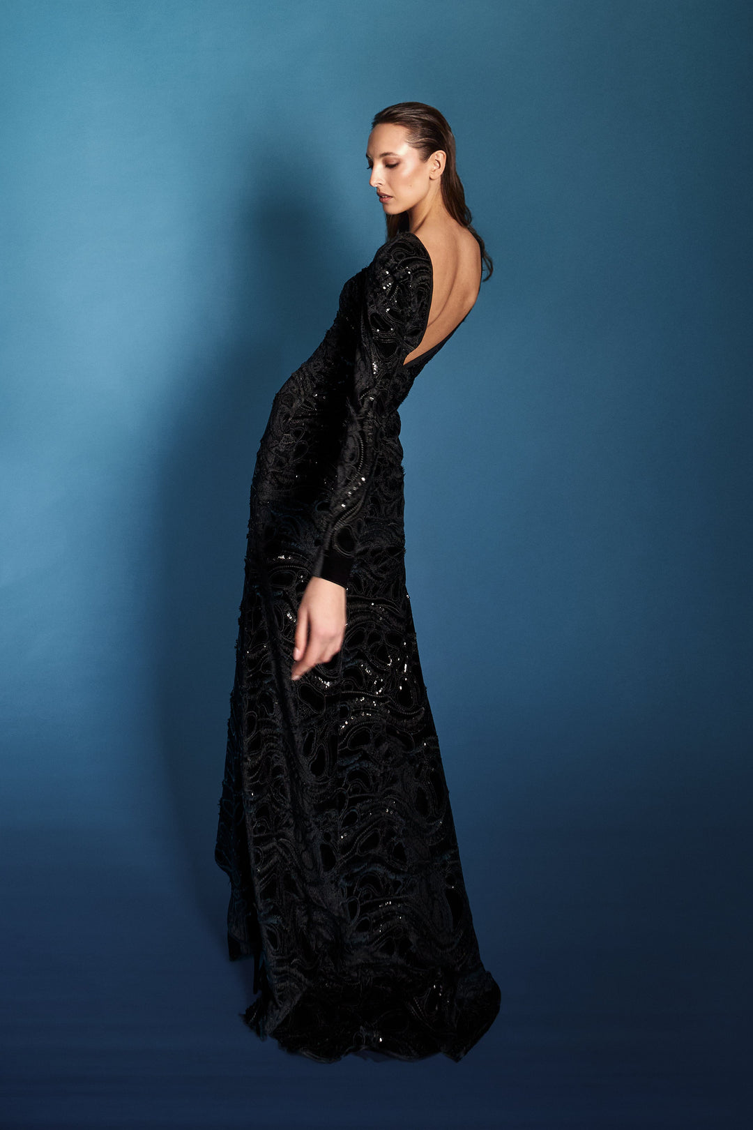 Abito verticale blu oltremare/incrostazioni micro paillettes/cappotto in velluto