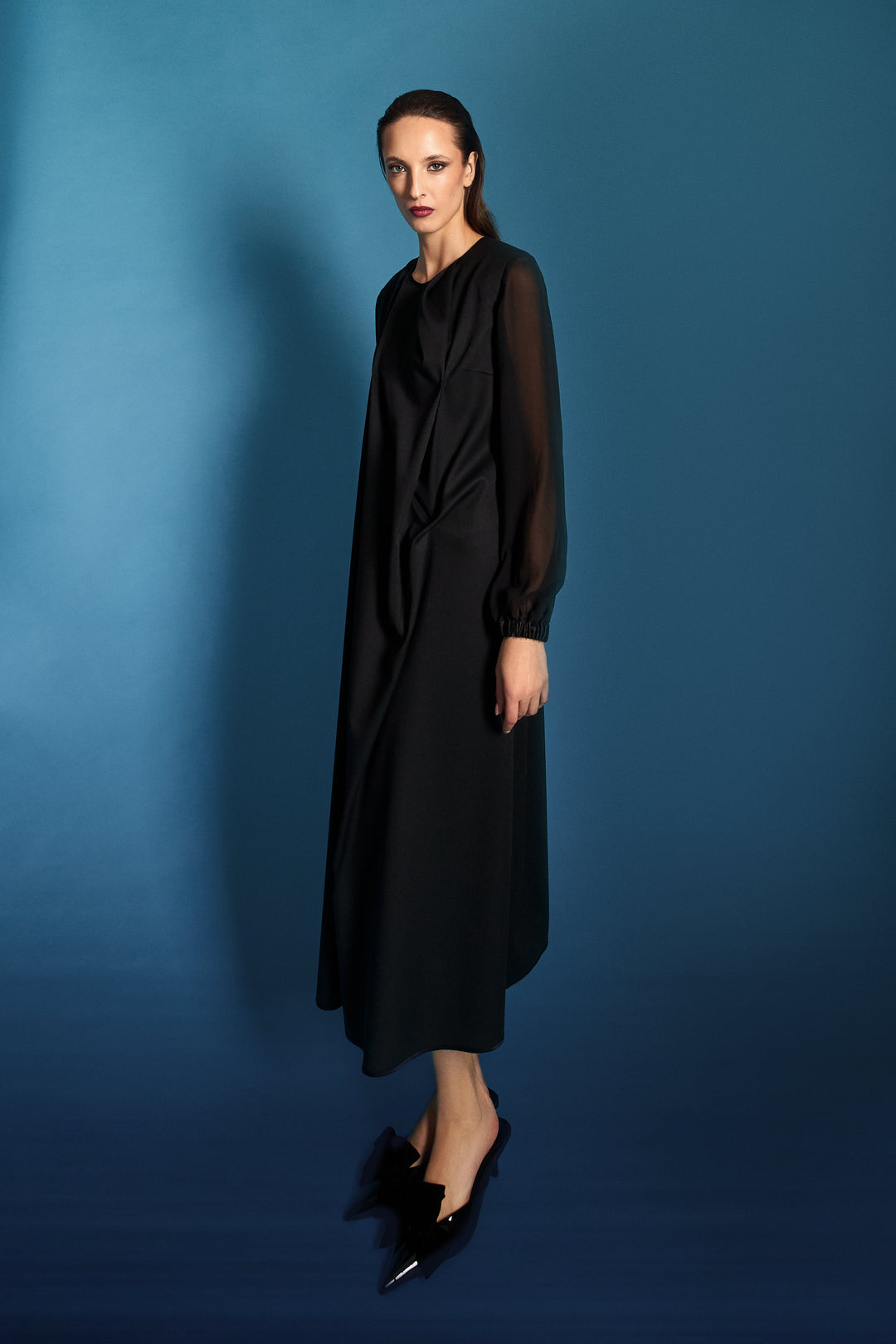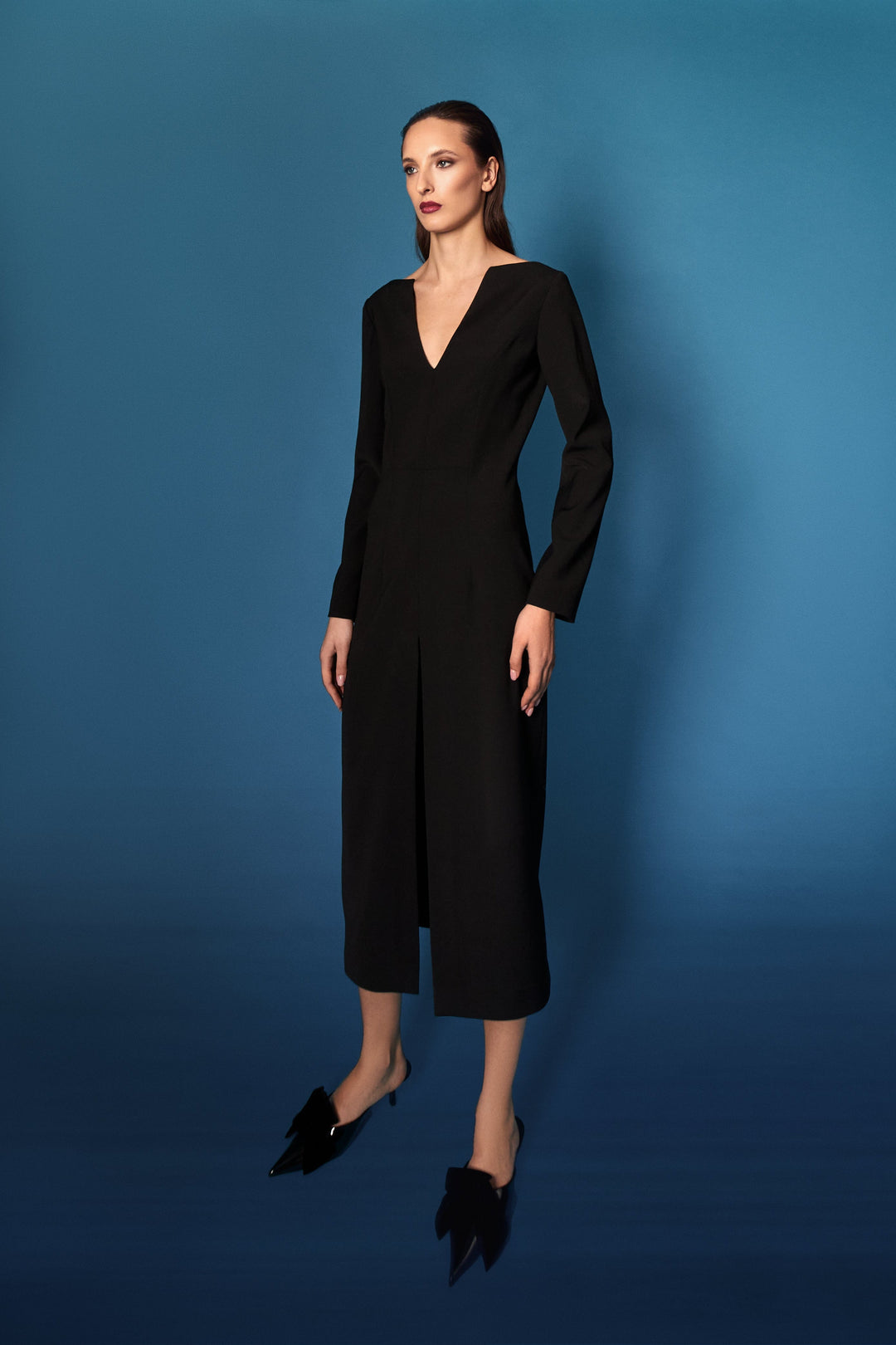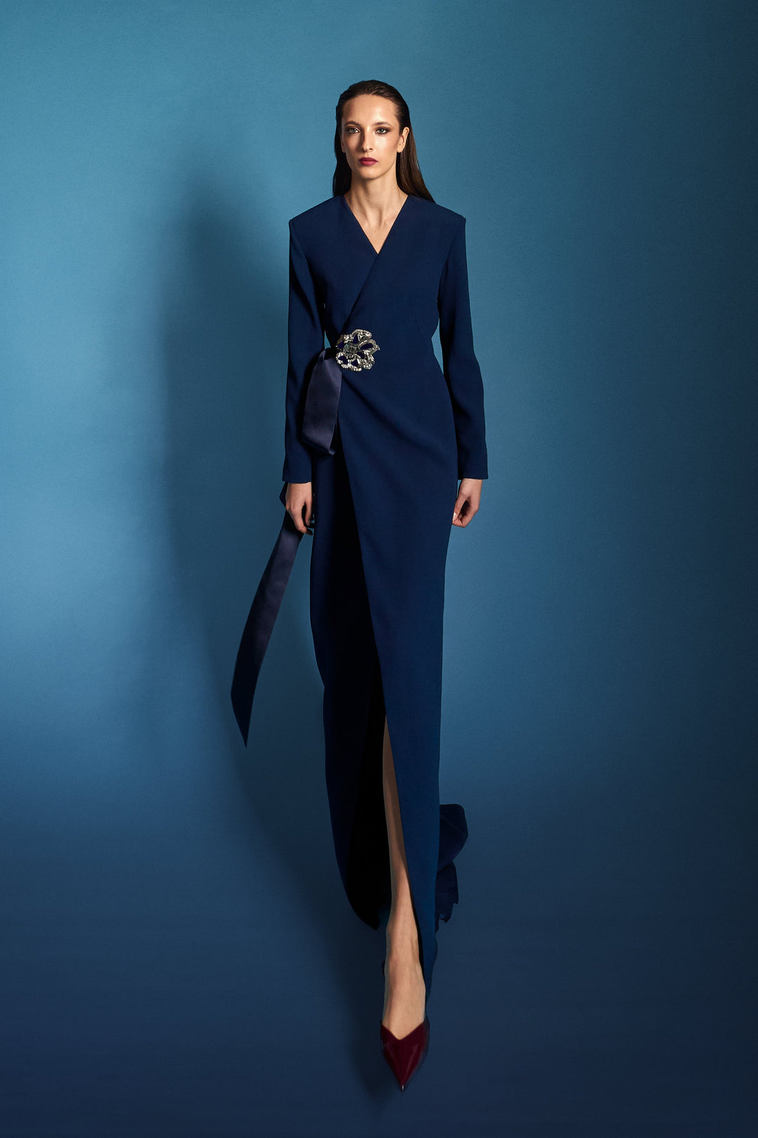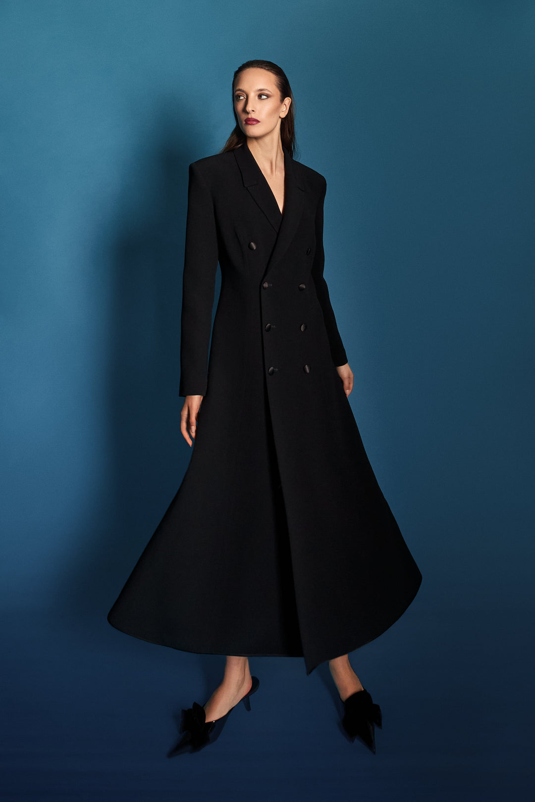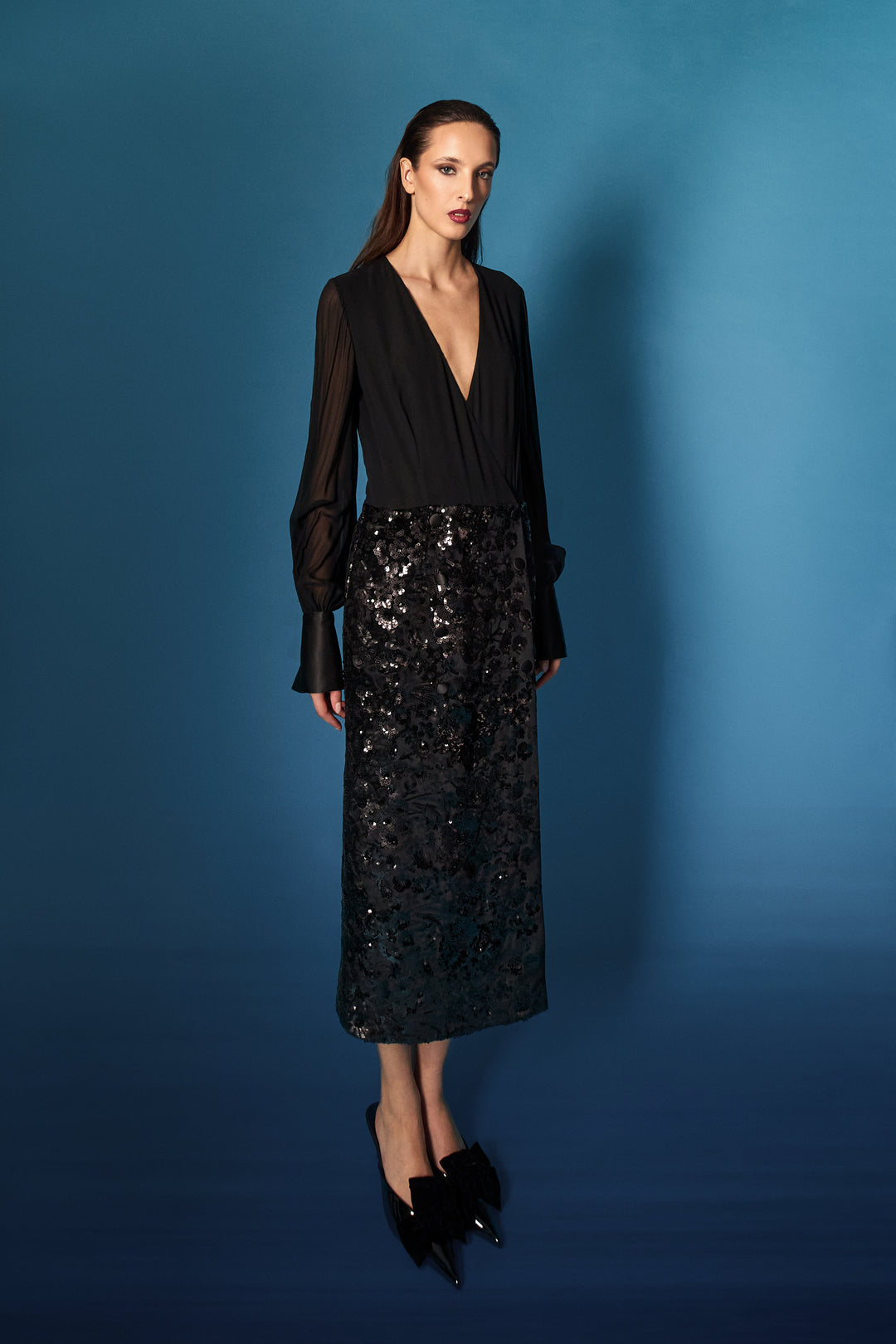 Abito verticale blu oltremare/incrostazioni micro paillettes/cappotto in velluto
