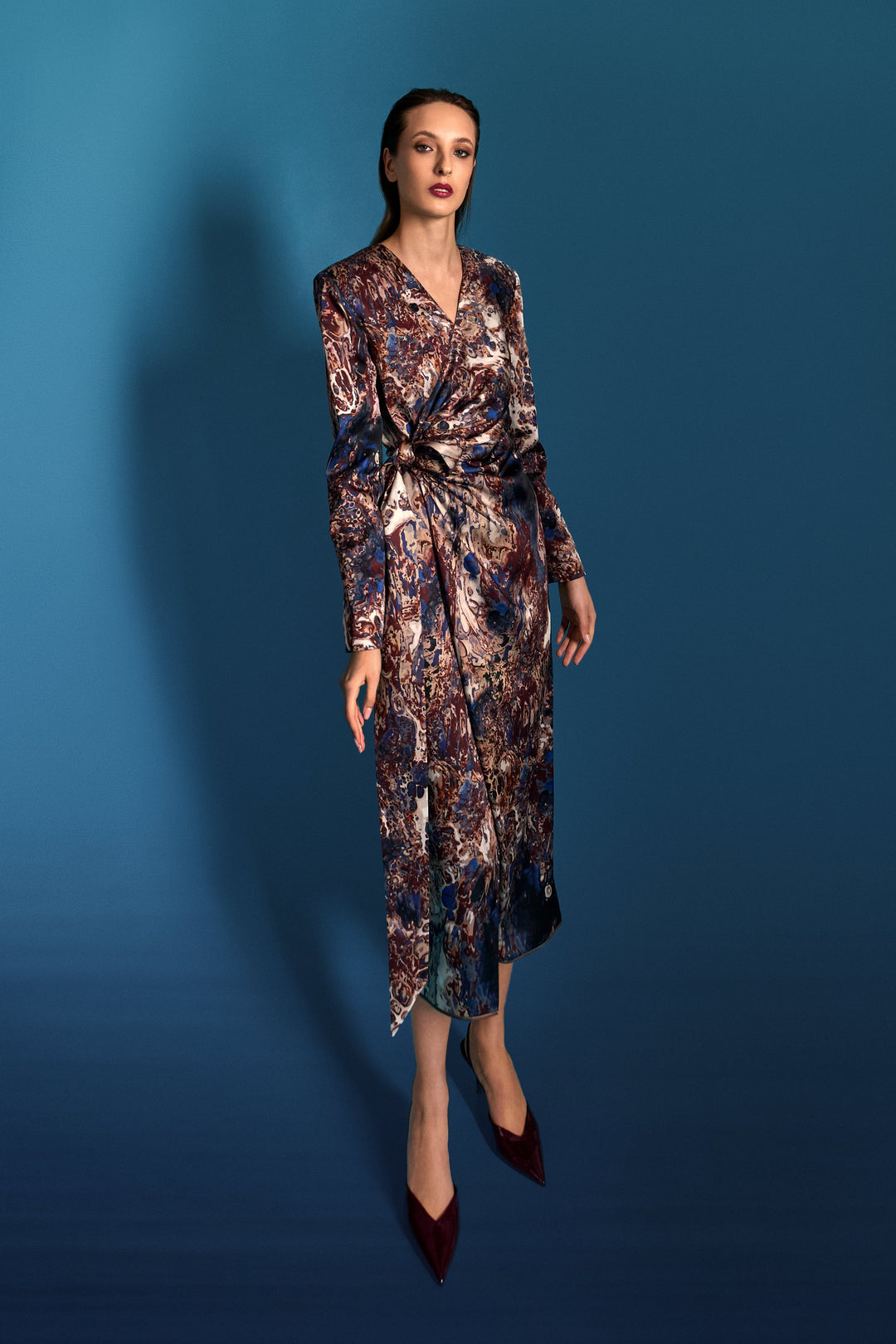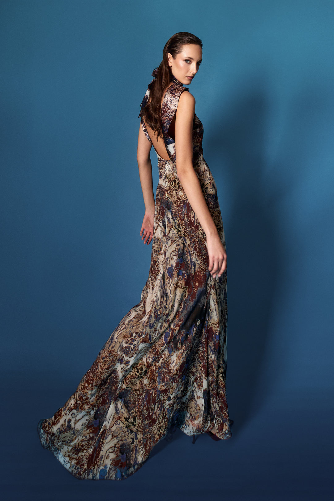Gli scolli vertiginosi, su décolleté e schiena, vengono temperati dallo charme della viscosa betulla in macule terra-mare.