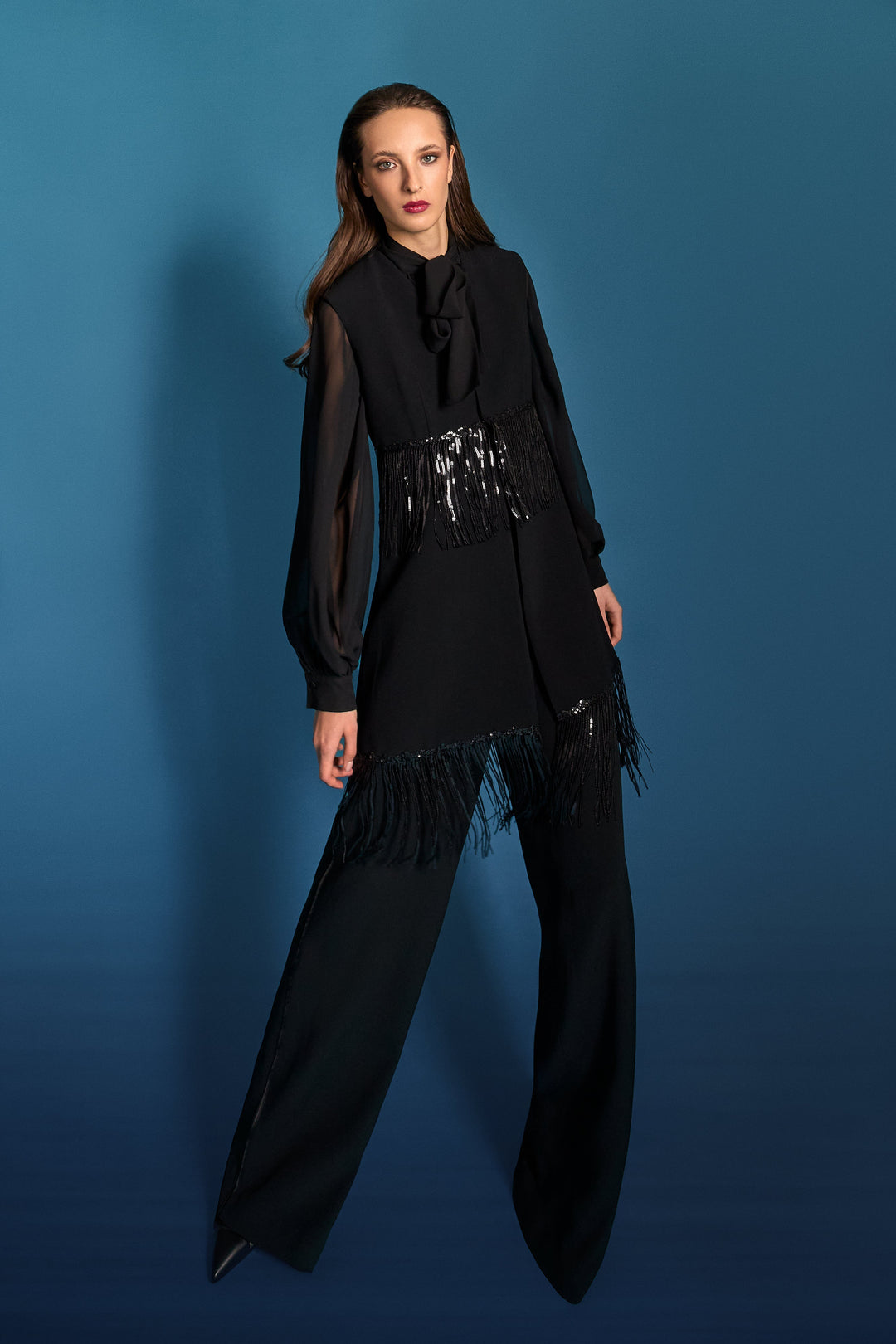 Pizzo, ricami tubolari, sequin, frange, piume, si posizionano in aree primarie, facendo uscire l’occhio dalla comfort zone estetica e traghettandolo verso numerosi, possibili codici di eleganza vorticosa.
