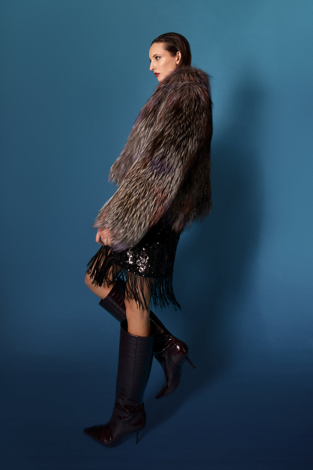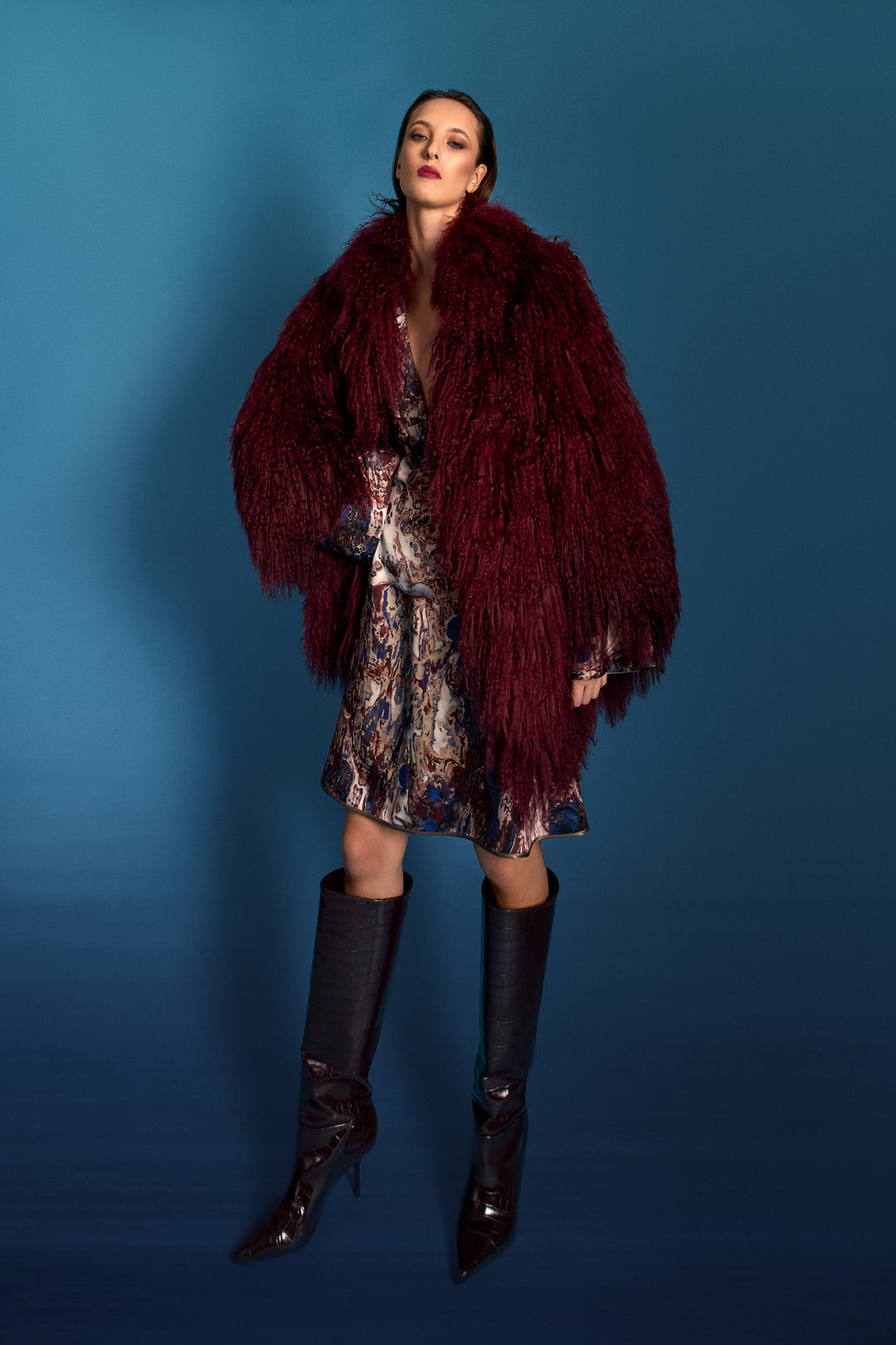 Robe manteau in geogette doppiopetto/pelliccia curly tibetana/stivale burgundy.