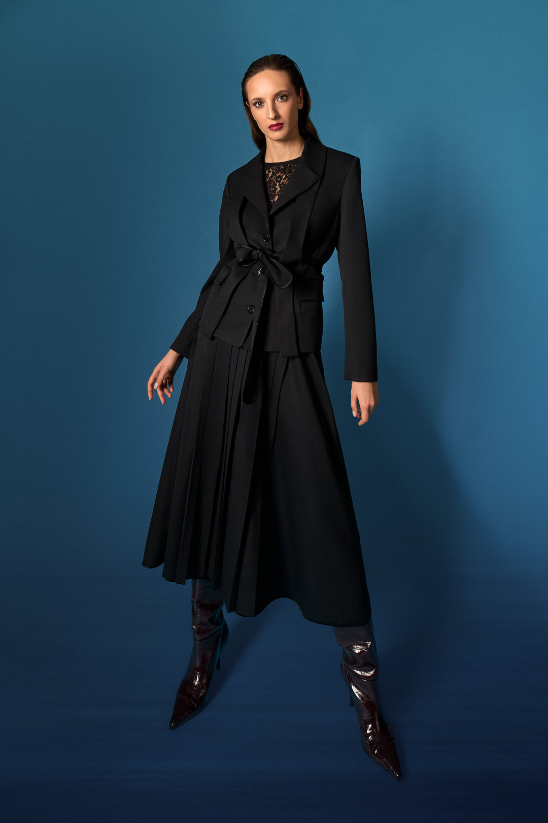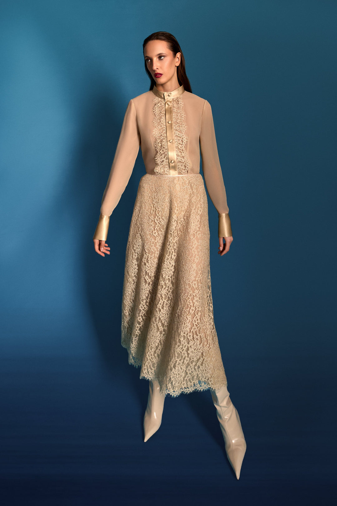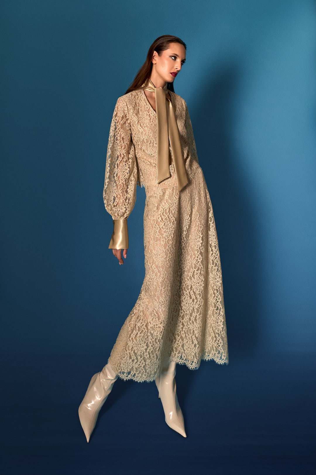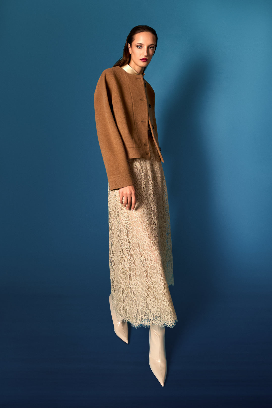 Camicetta raso-seta-chantilly/gonna in pizzo di lana/caban di lana cammello a spalle scese in pieno mood Eighty