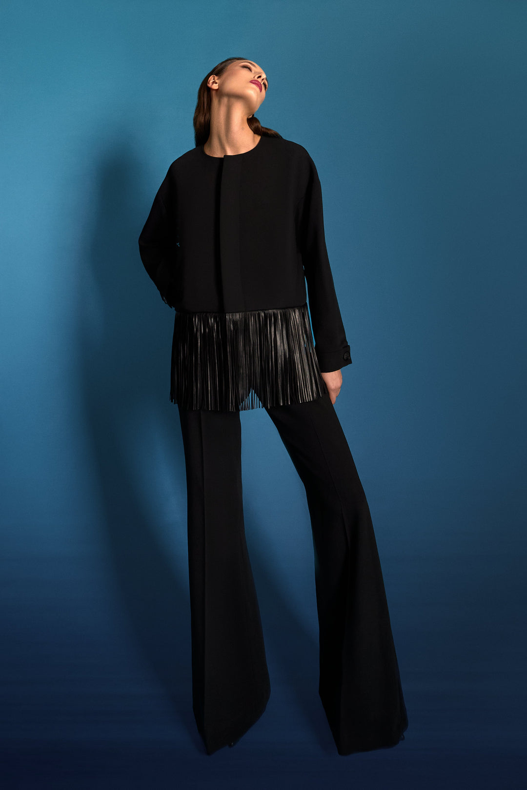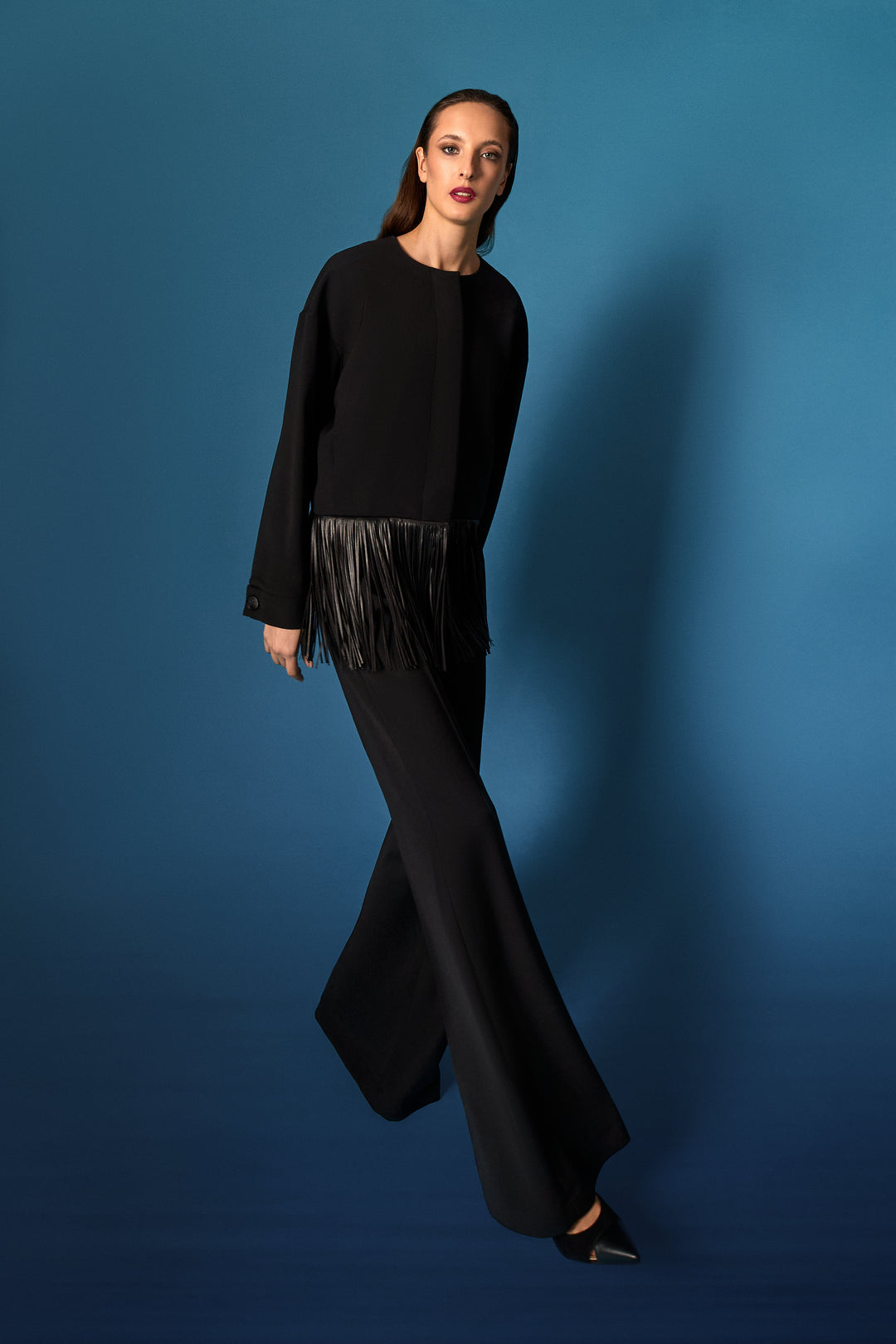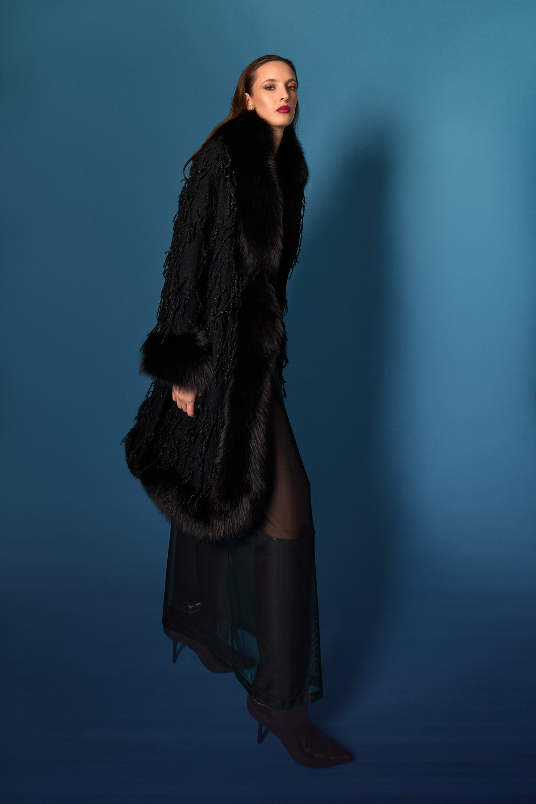 la cappa nera, con micro-frange flottanti di pelle biscotto