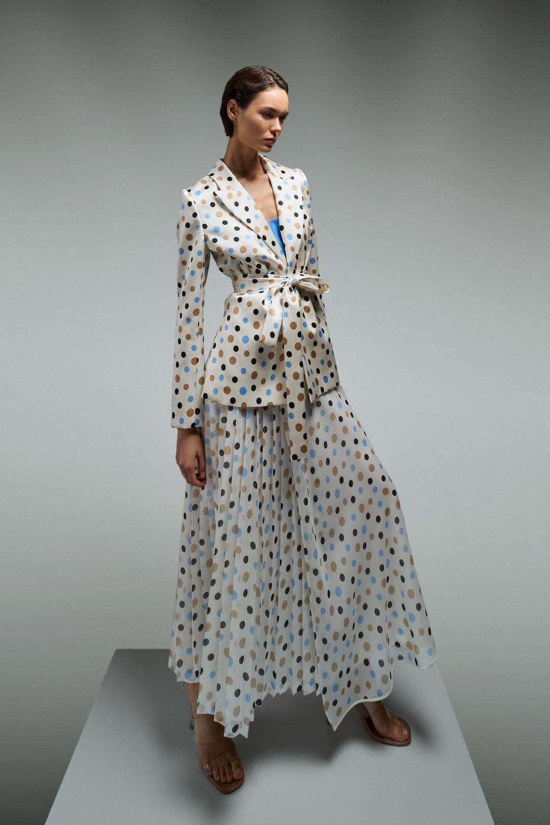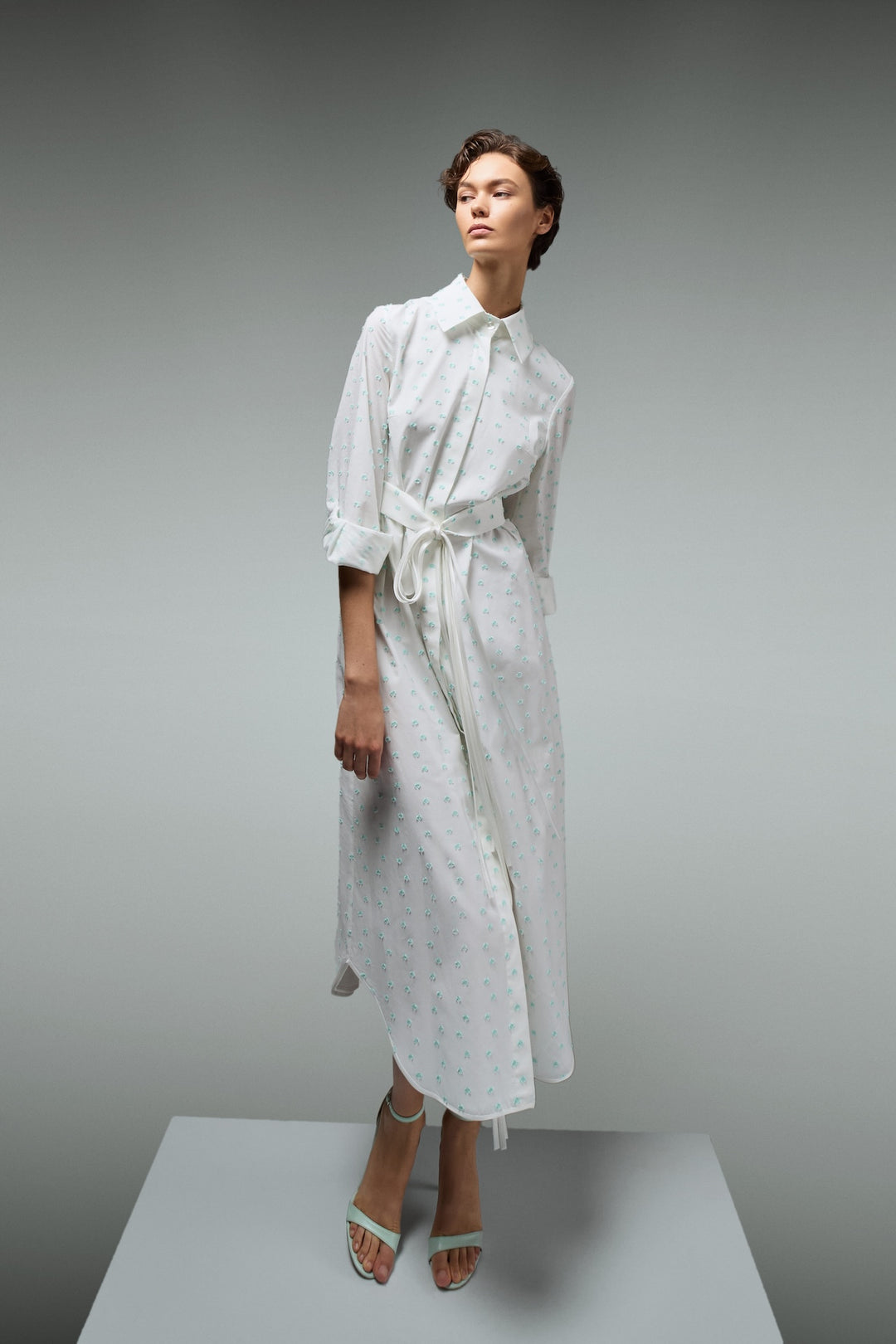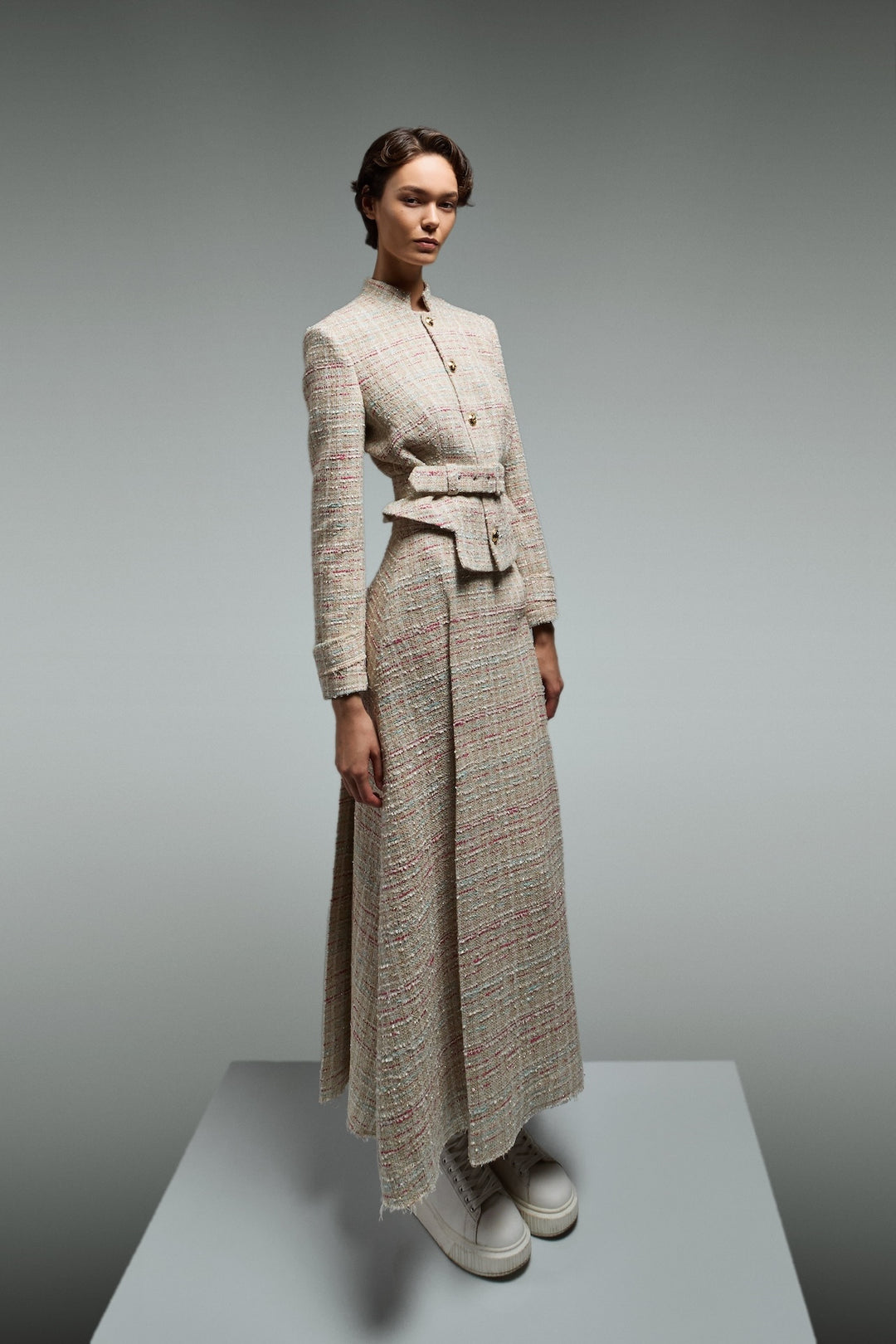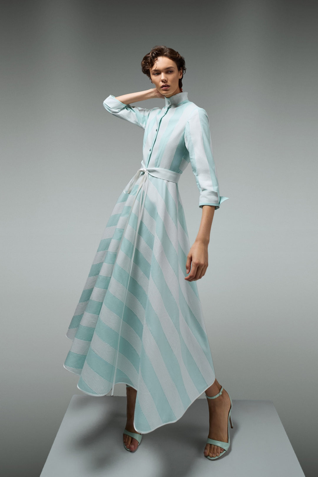 Il tulle diventa un esperanto, flessibile, duttile, capace di trasformarsi in fodera doppiata per dare struttura ai meravigliosi abiti scampanati o agli spolverini cardigan, con cintura di canneté e profili a punto bambola.