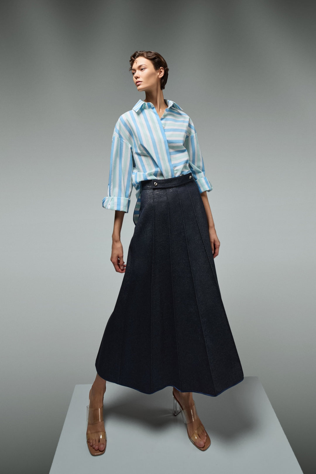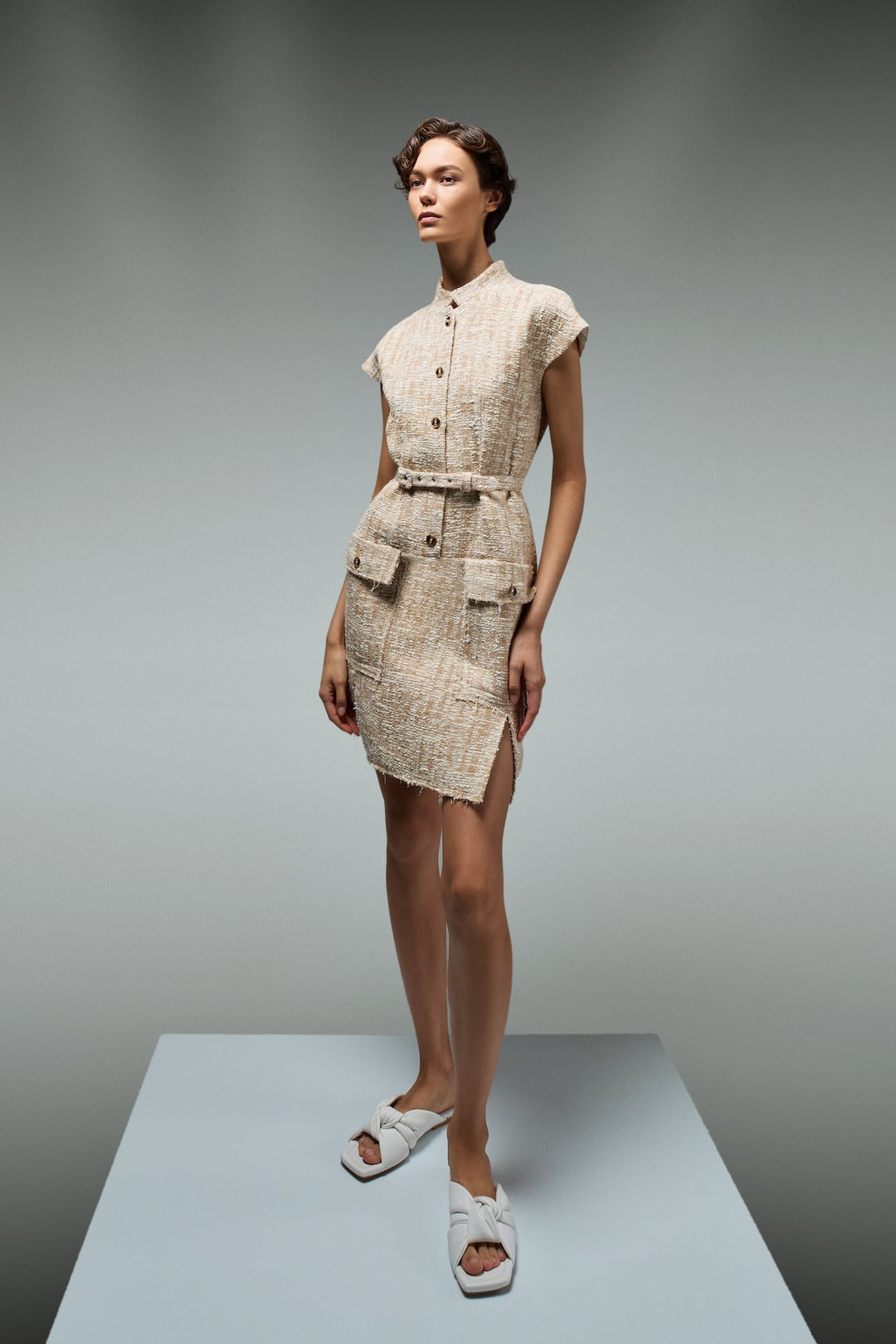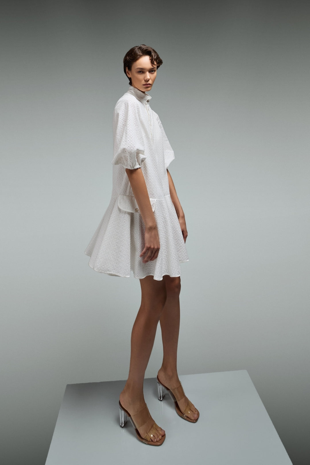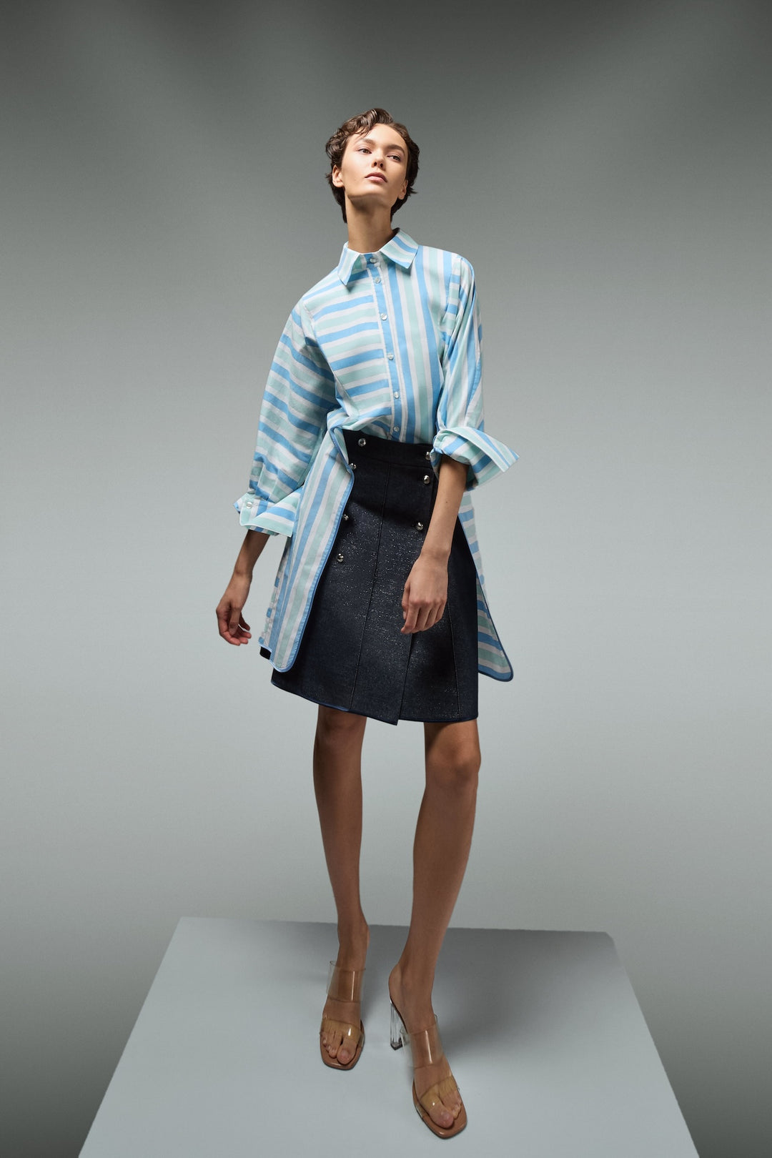 Il tulle diventa un esperanto, flessibile, duttile, capace di trasformarsi in fodera doppiata per dare struttura ai meravigliosi abiti scampanati o agli spolverini cardigan, con cintura di canneté e profili a punto bambola.