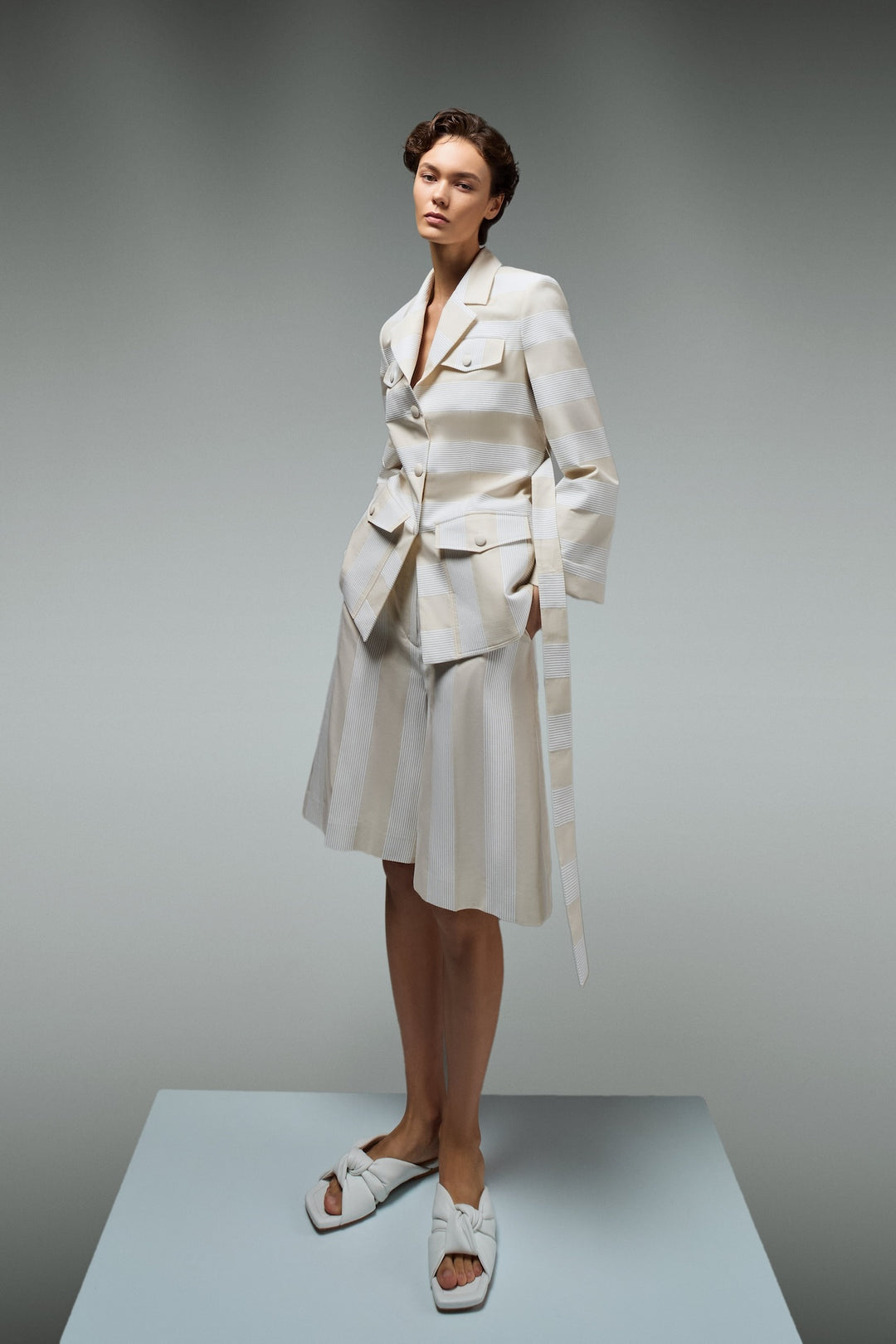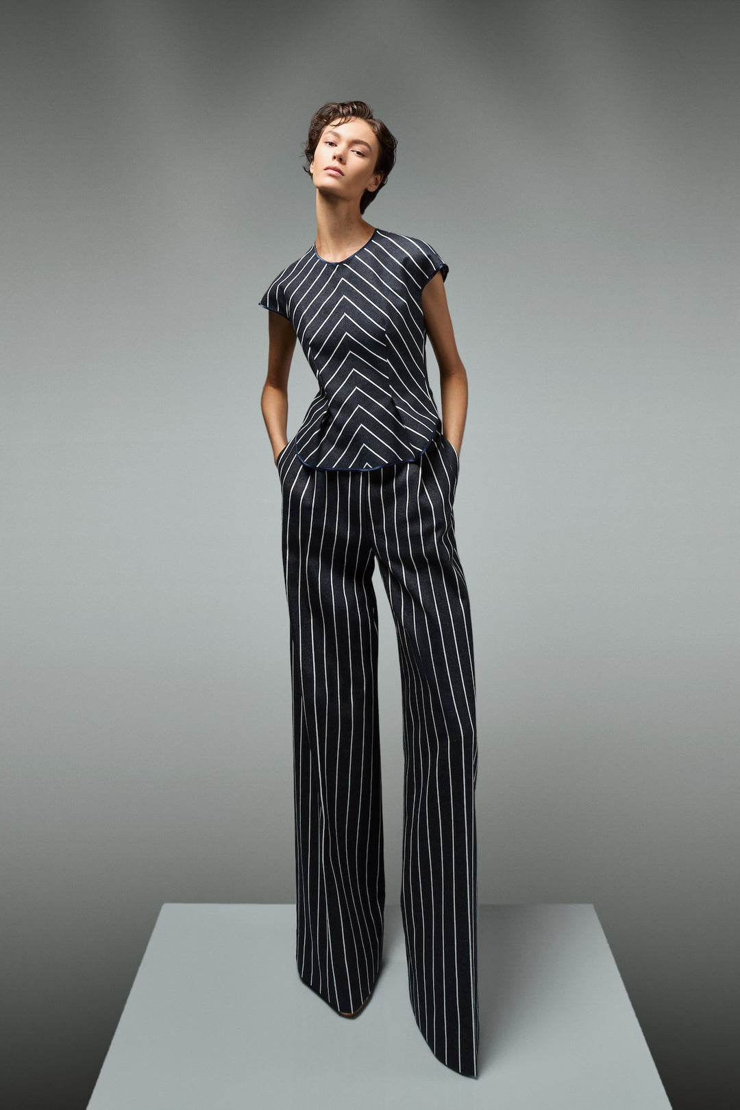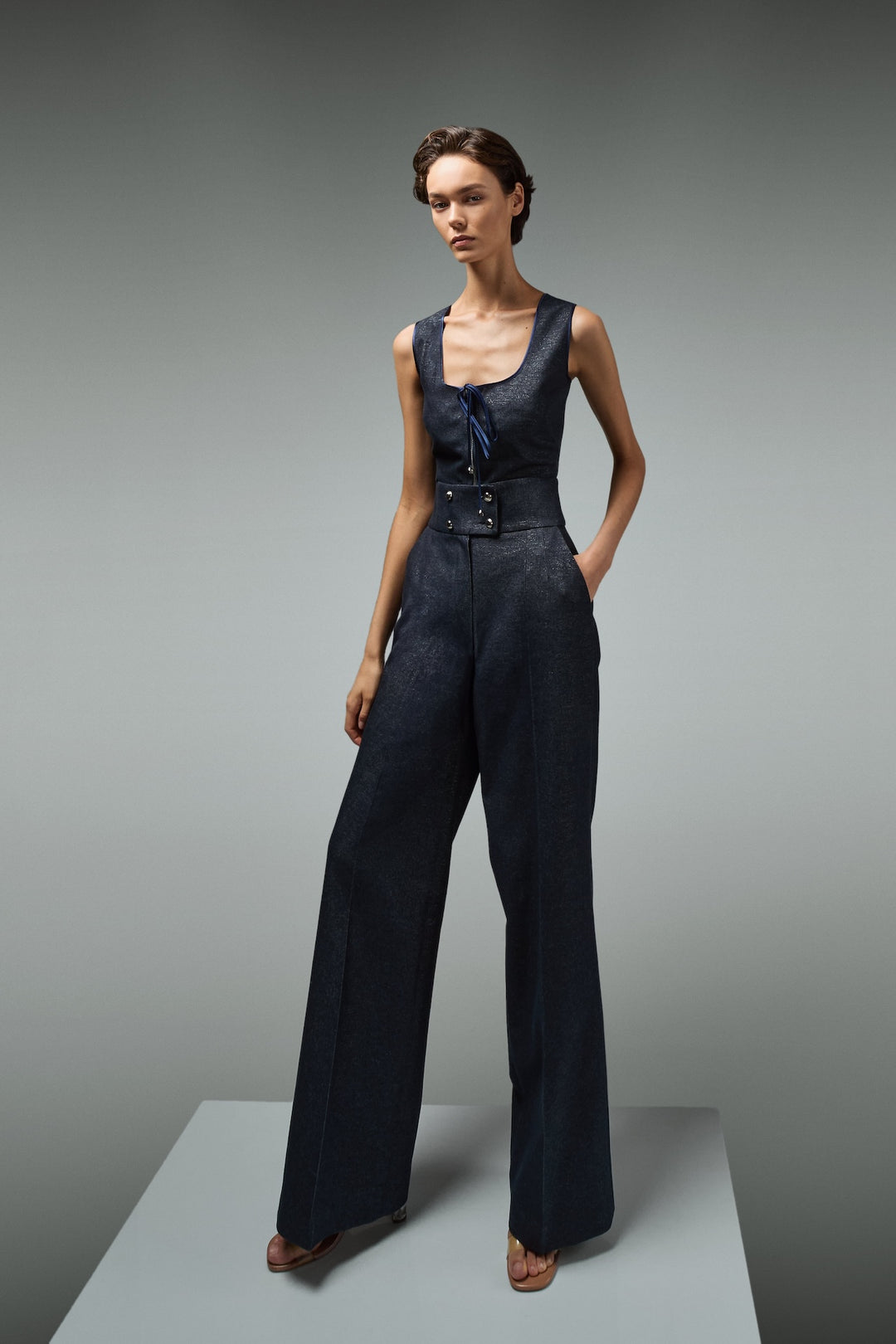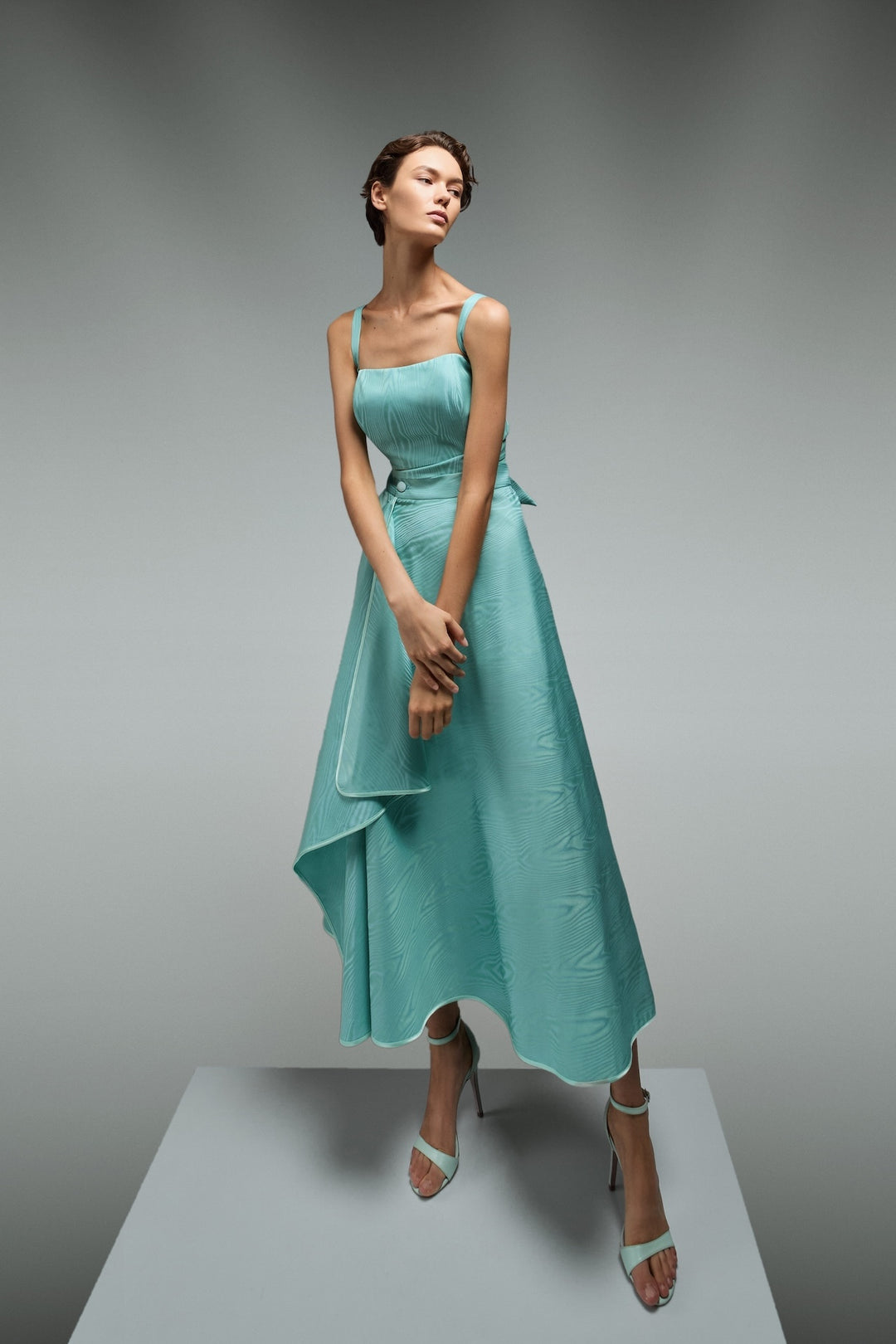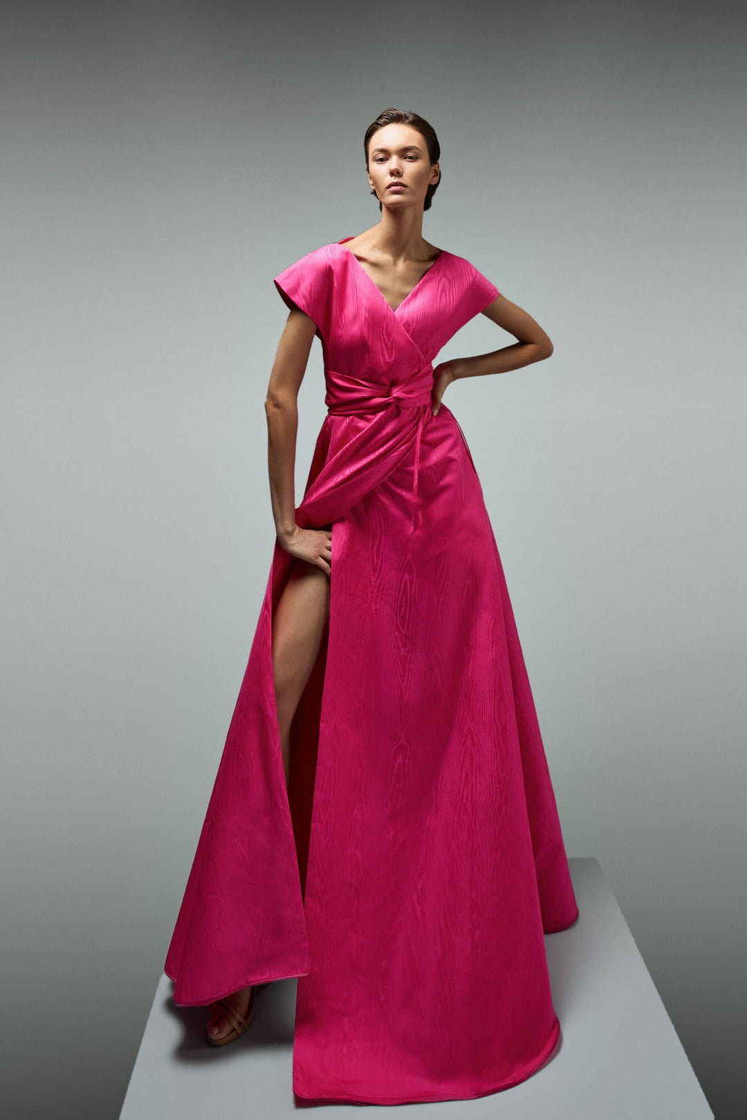 Sulla duchesse jacquard dove il ciclamino si mixa al verde linfa, nei bustier accompagnati a pantaloni palazzo o negli abiti con il giromanica architettura e ambie bande al punto vita.