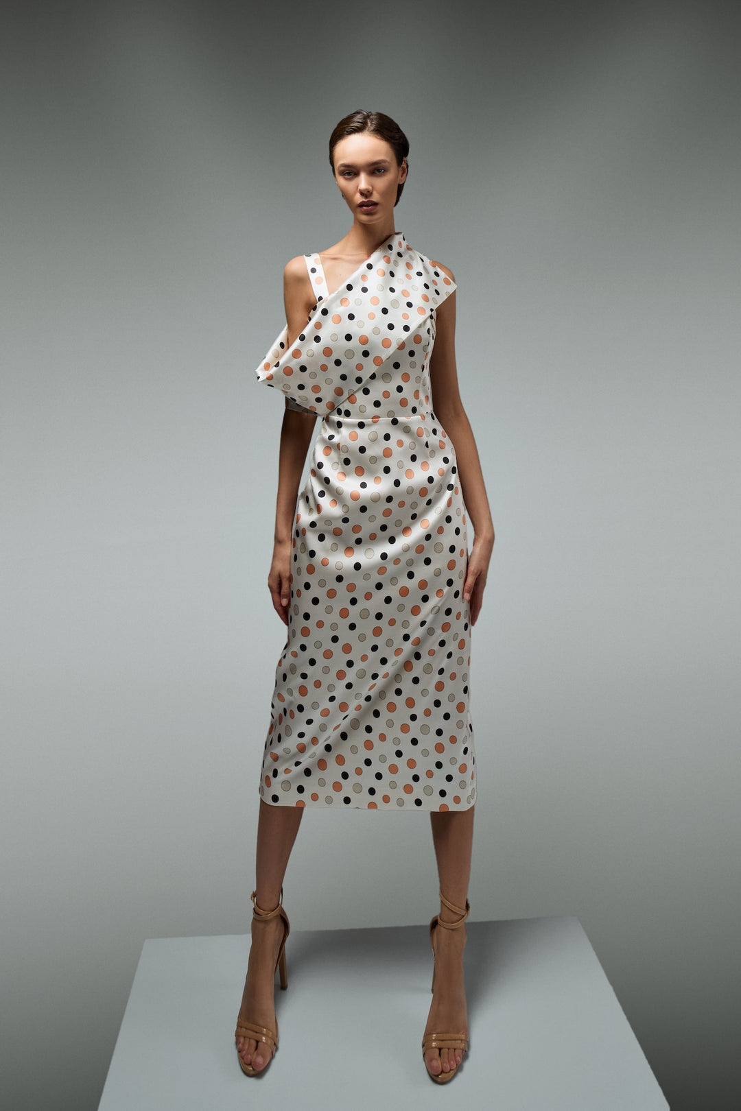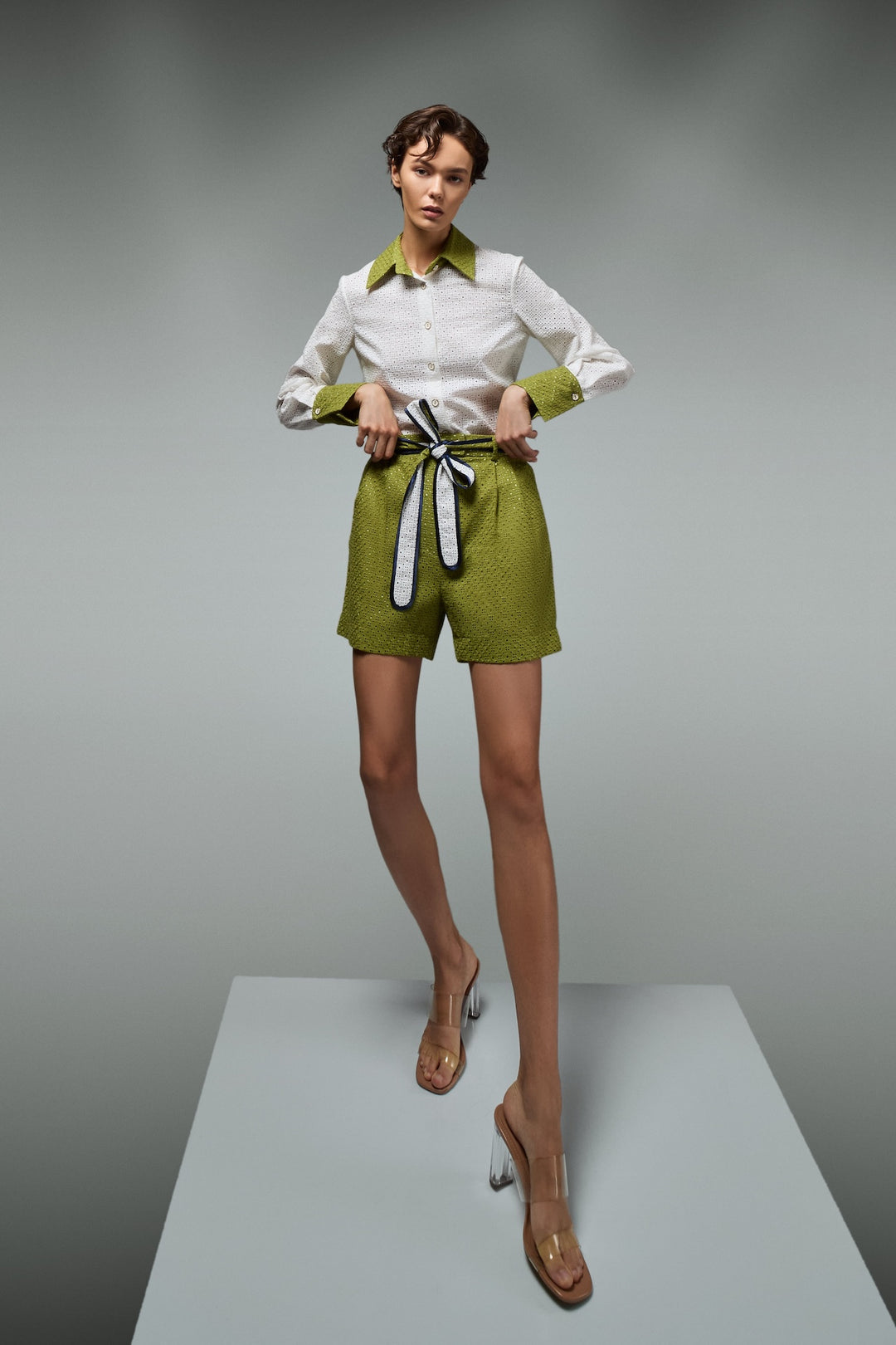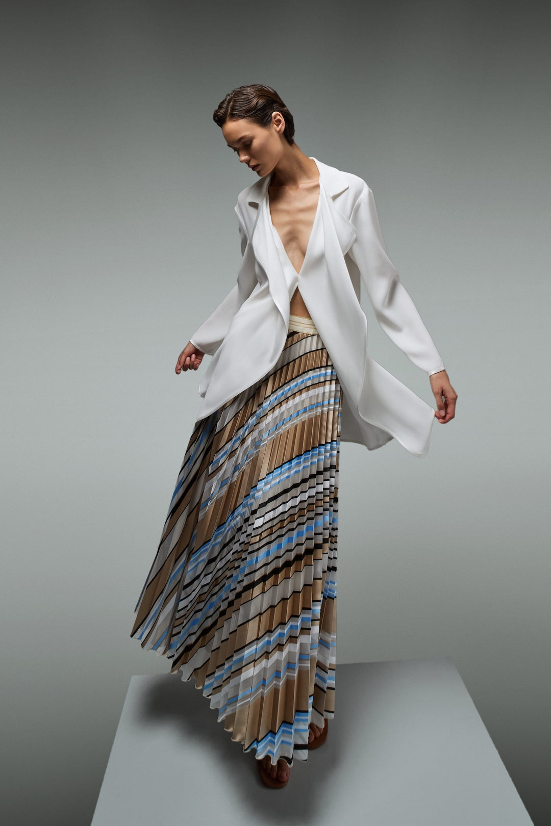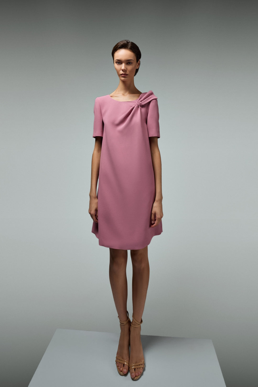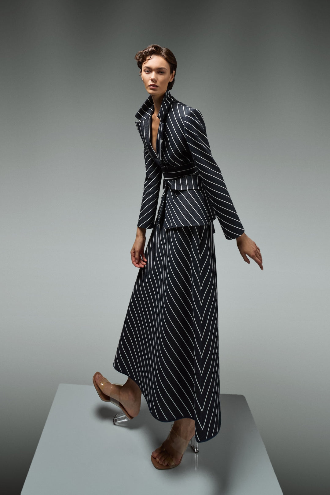 Sulla duchesse jacquard dove il ciclamino si mixa al verde linfa, nei bustier accompagnati a pantaloni palazzo o negli abiti con il giromanica architettura e ambie bande al punto vita.