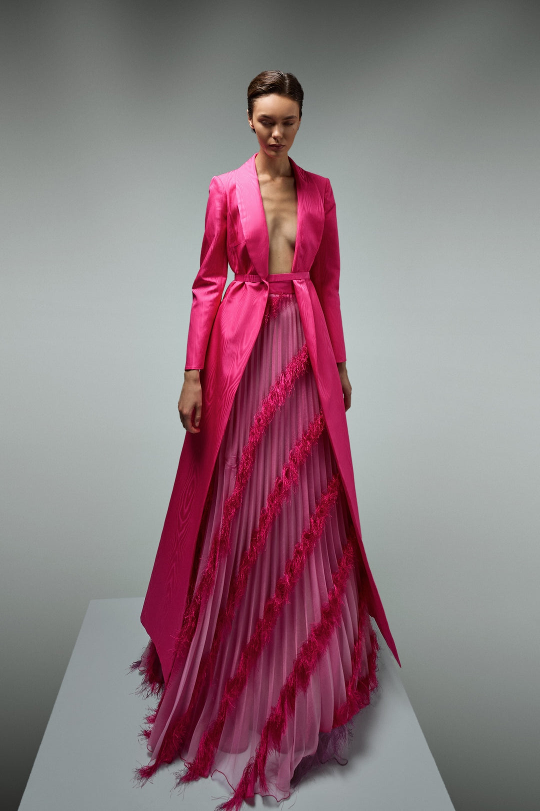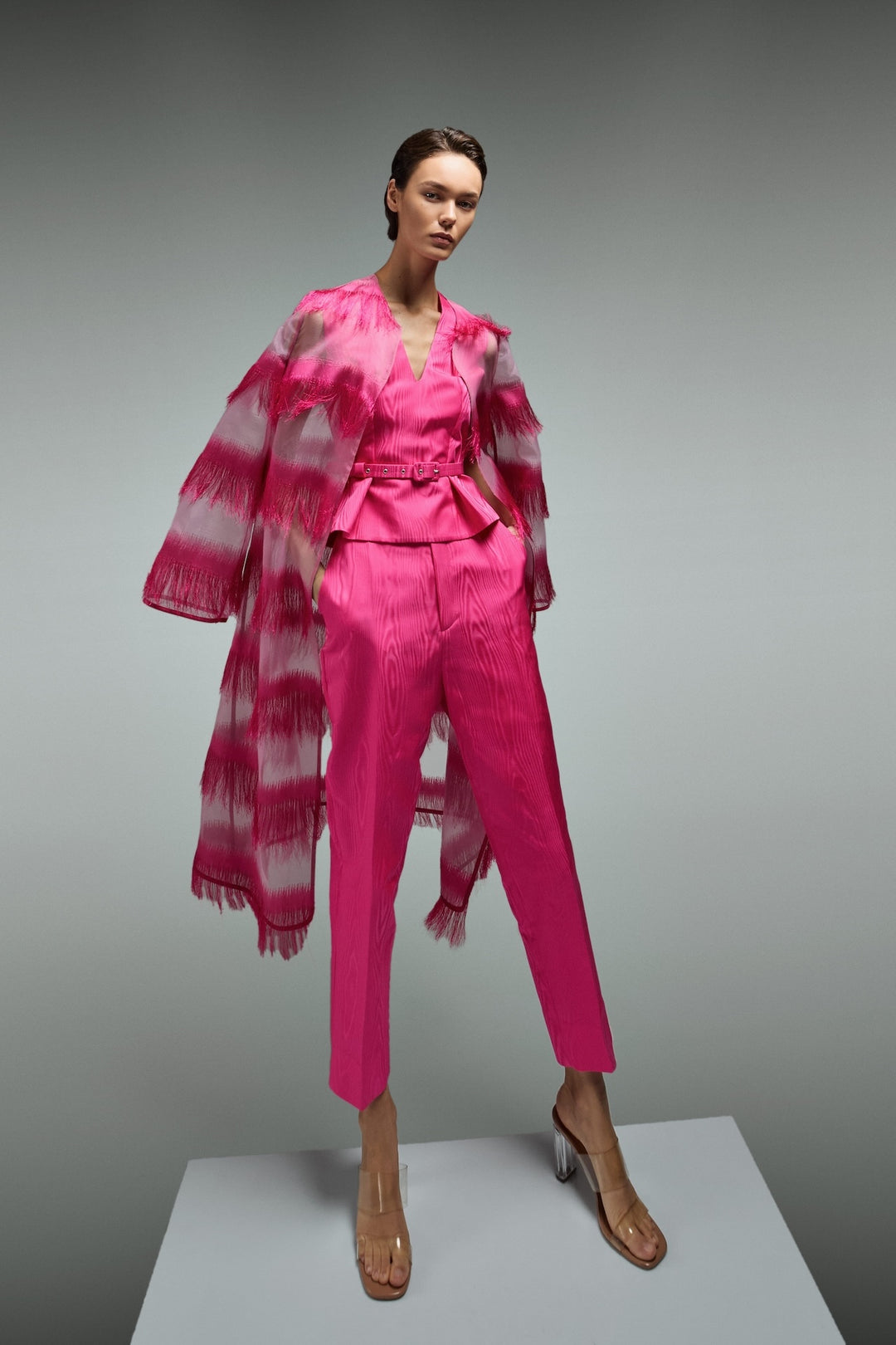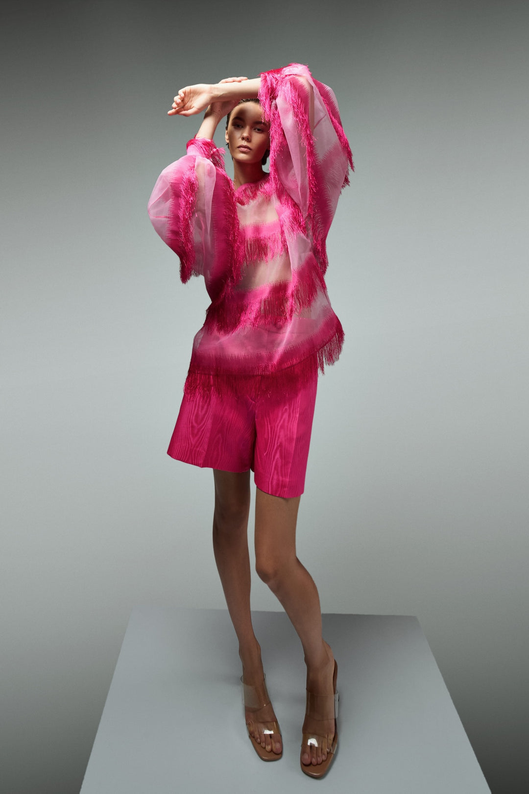 Sulla struttura del moiré, sulle organze sfrangiate che creano abiti dalla linea dritta con fronde di fucsia vibrante che fluttua nella trasparenza.
