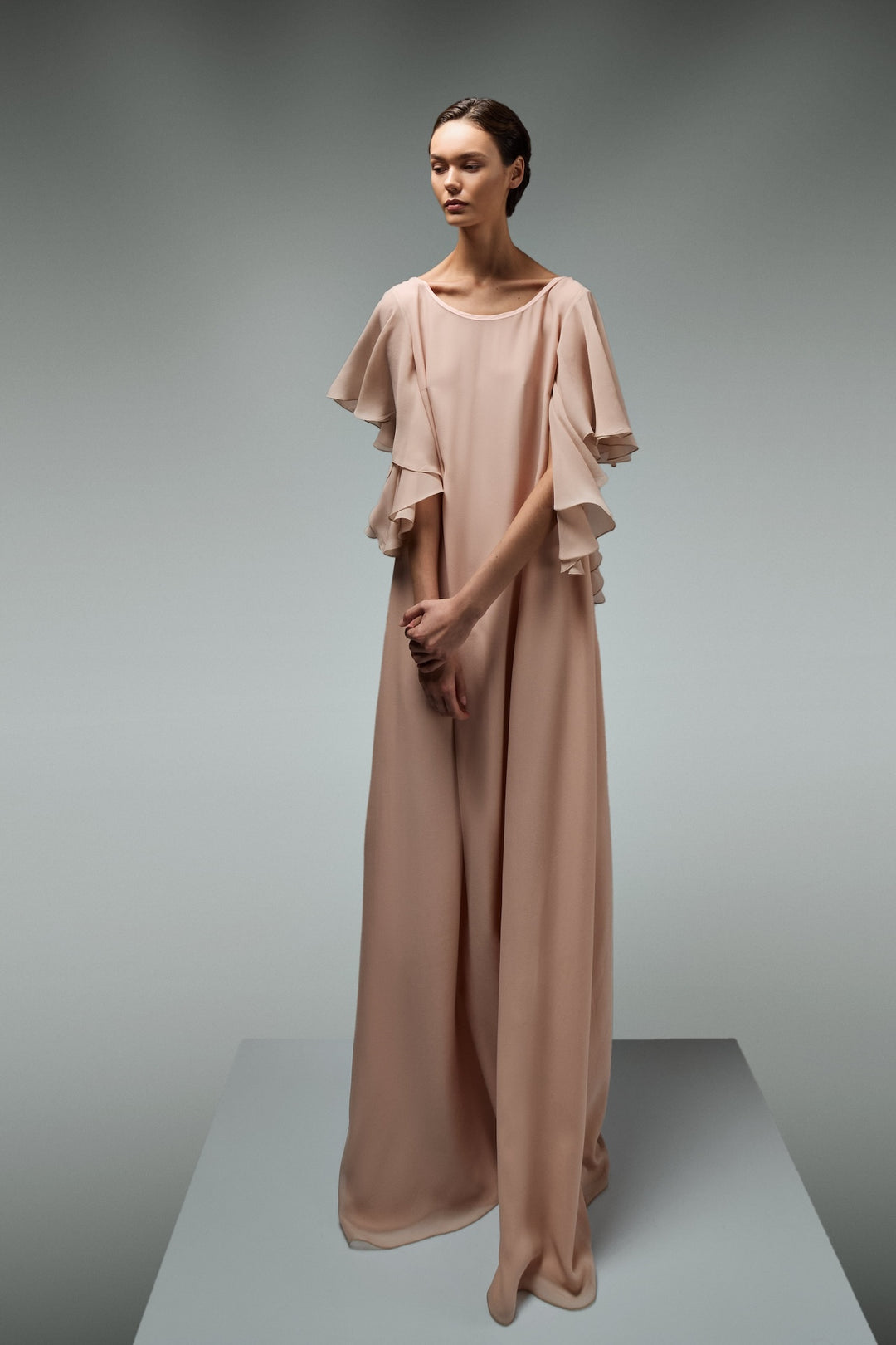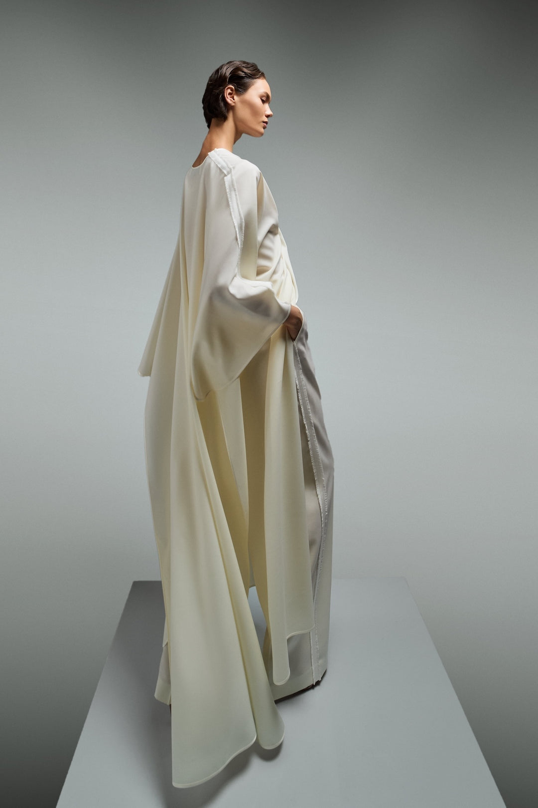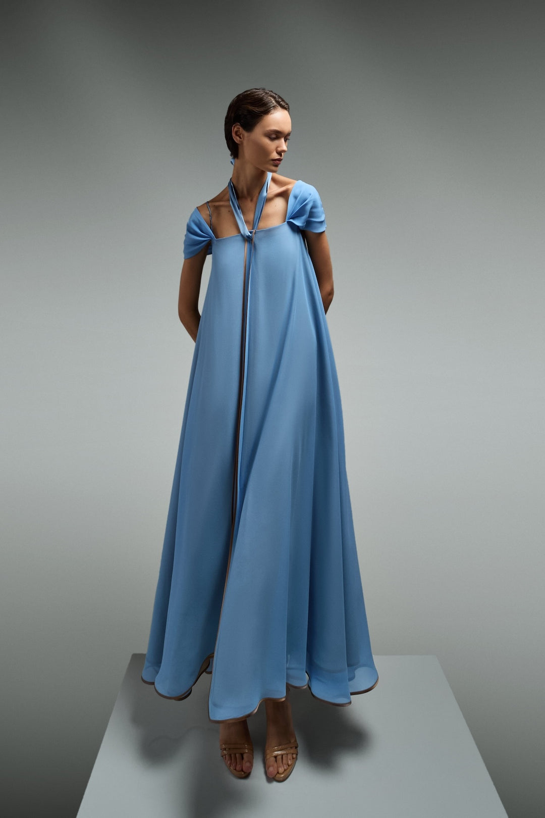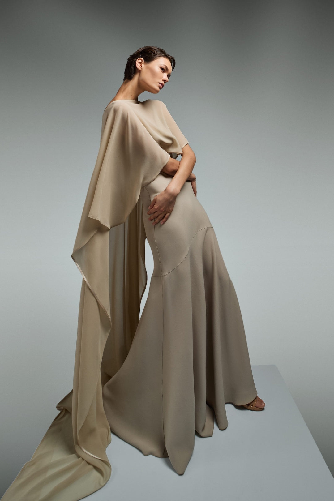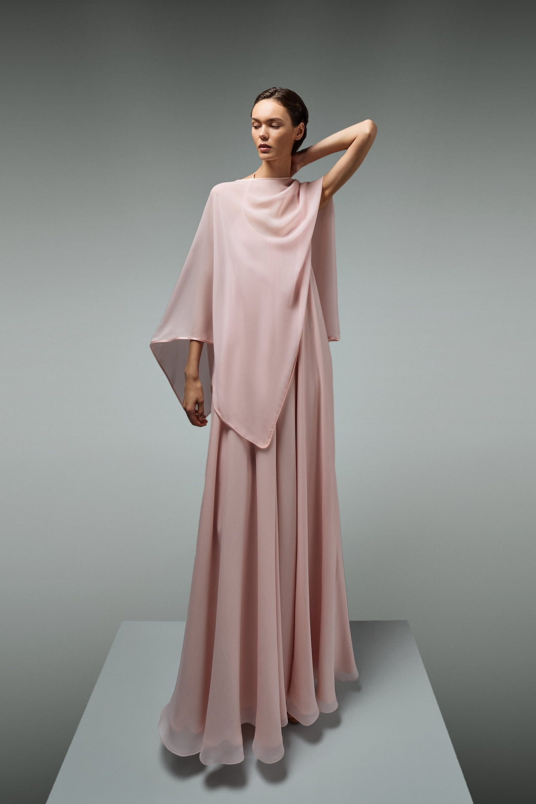 Le cappe di georgette nude sono un capolavoro di architettura del tessuto, che si ricompone sul corpo, guidato dai piping di raso ai bordi.