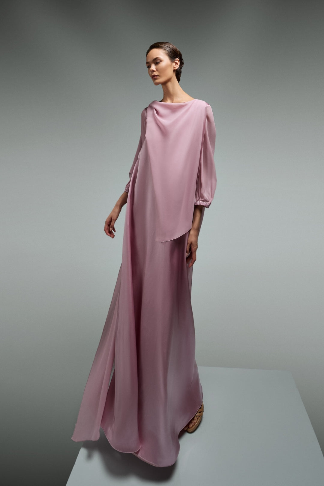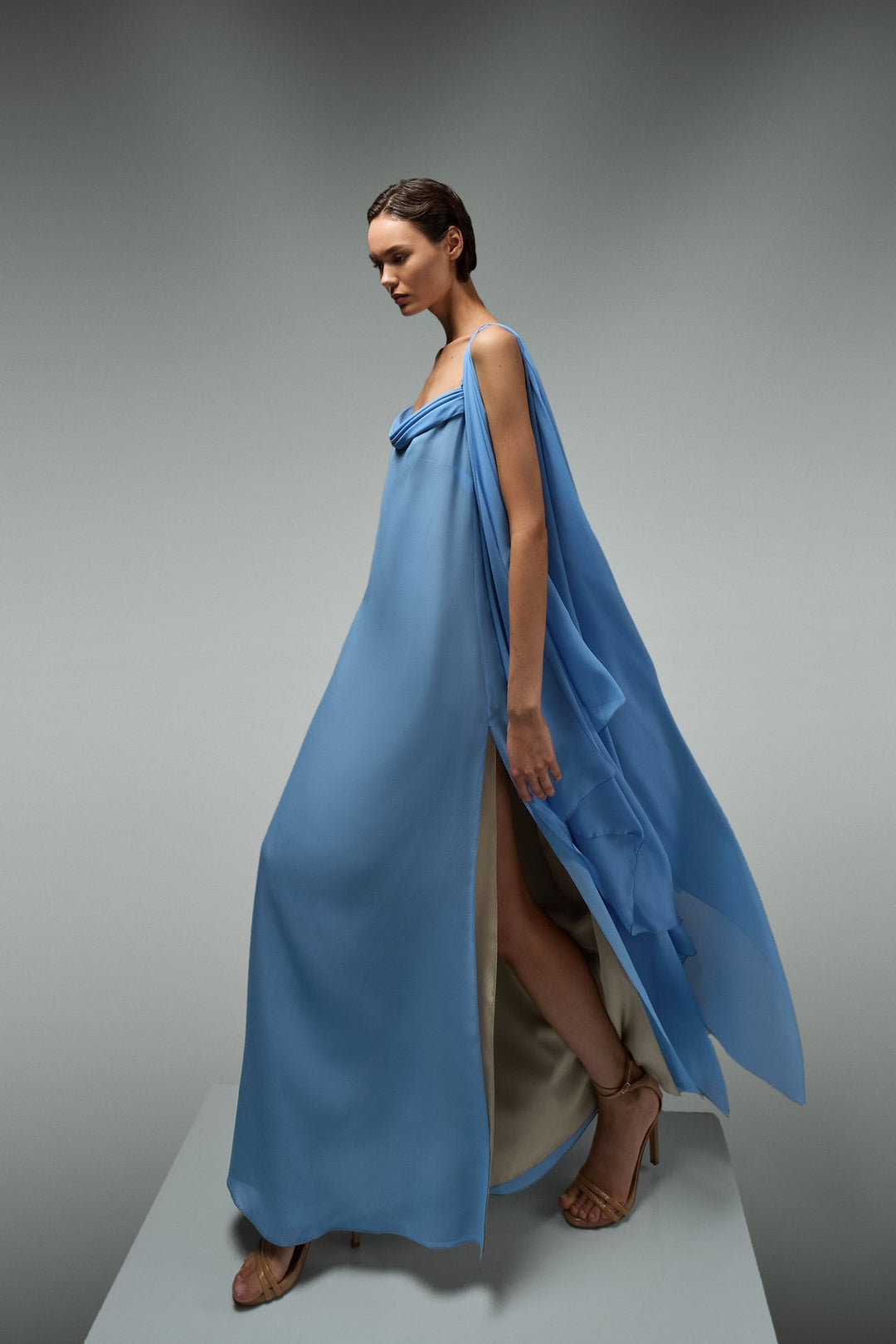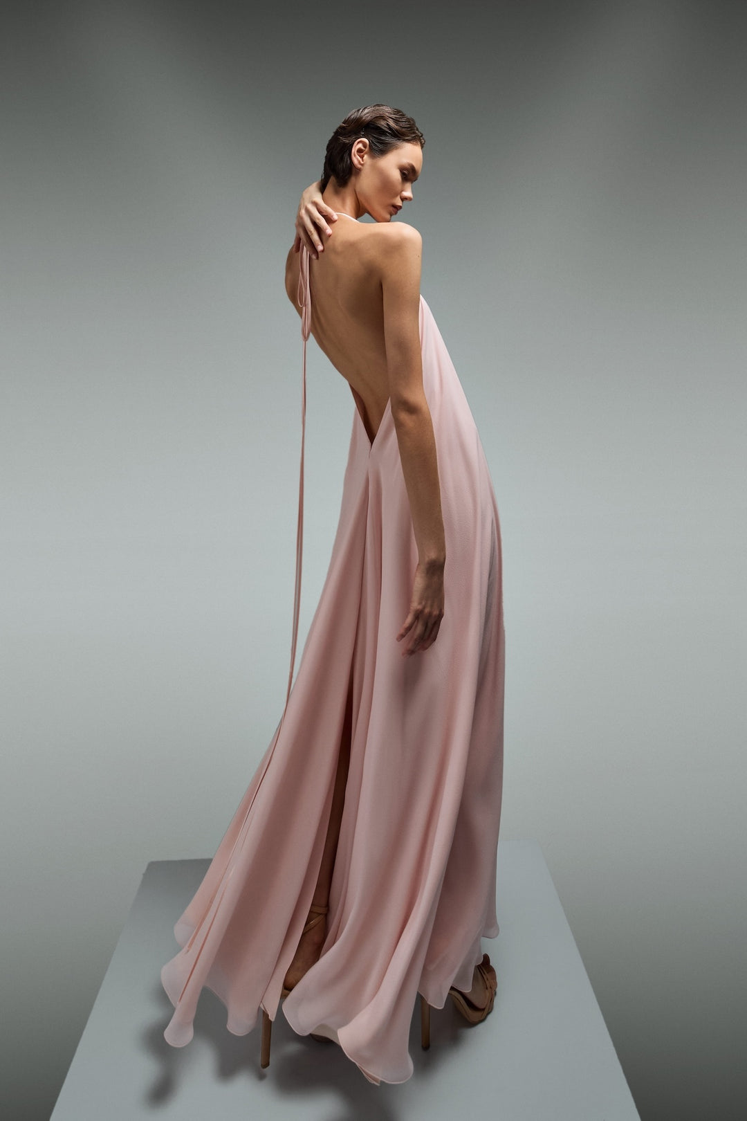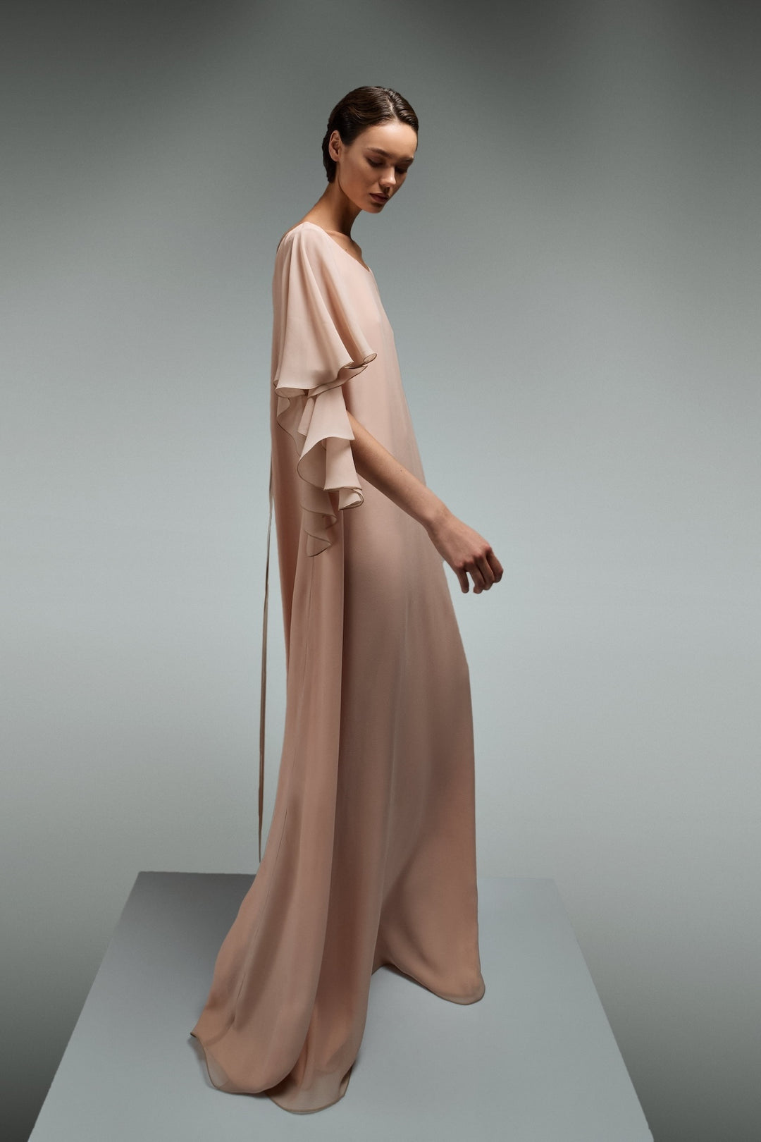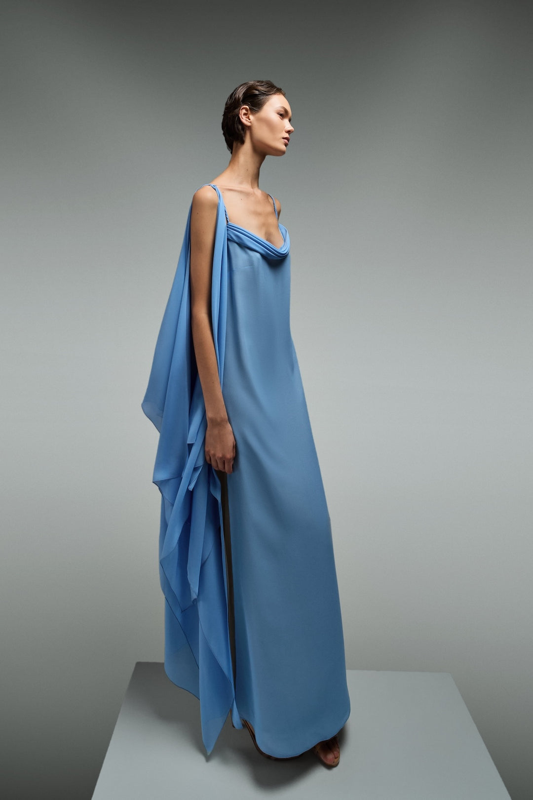 Le cappe di georgette nude sono un capolavoro di architettura del tessuto, che si ricompone sul corpo, guidato dai piping di raso ai bordi.