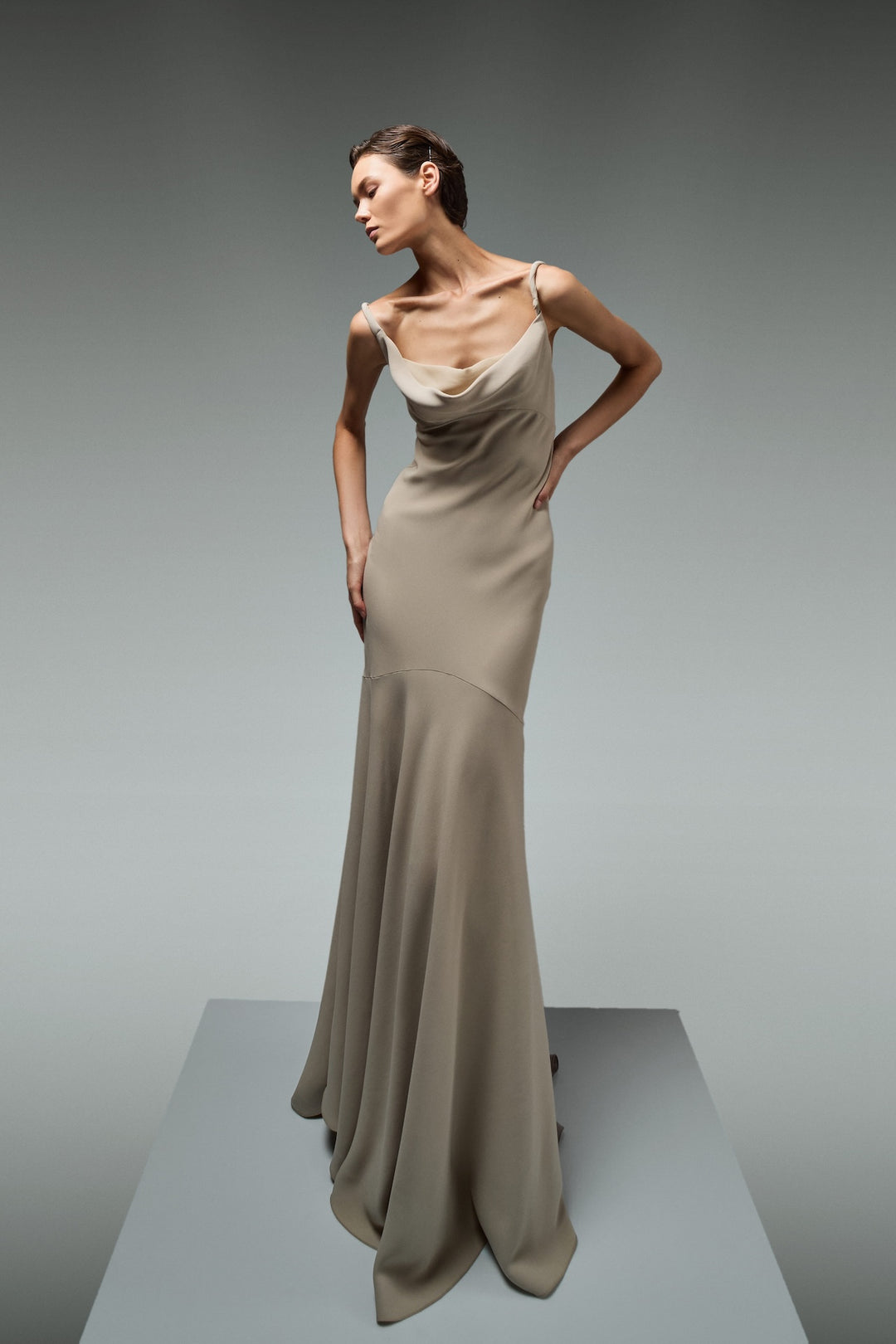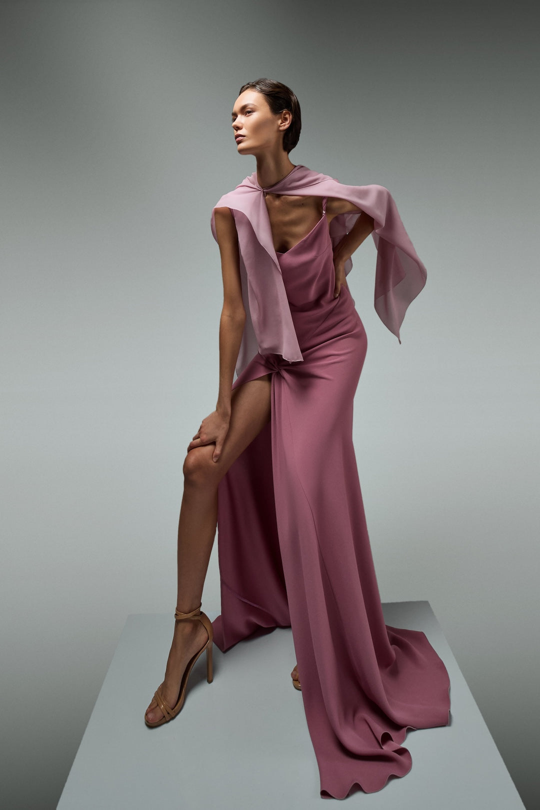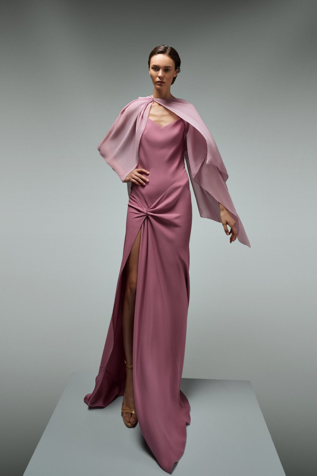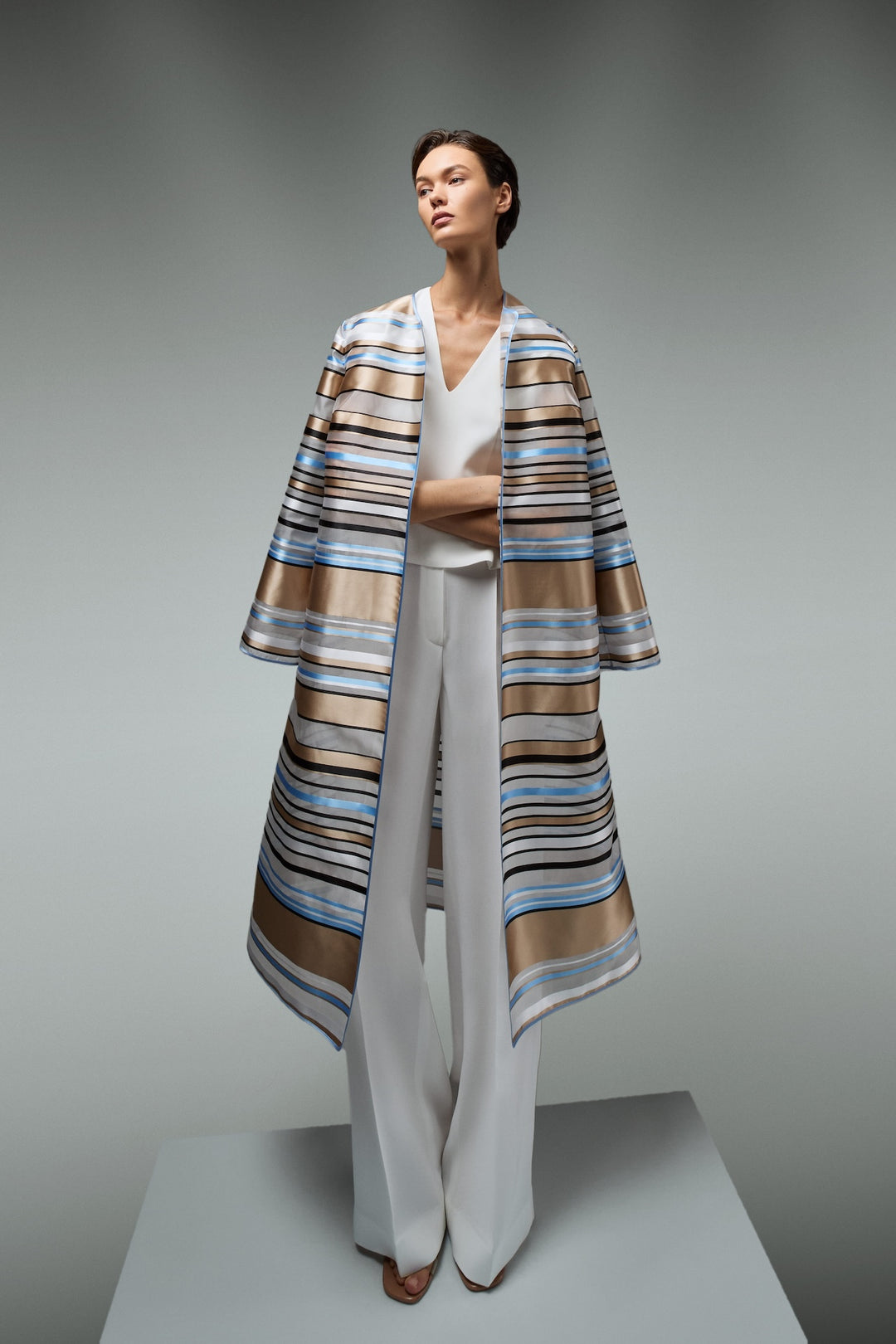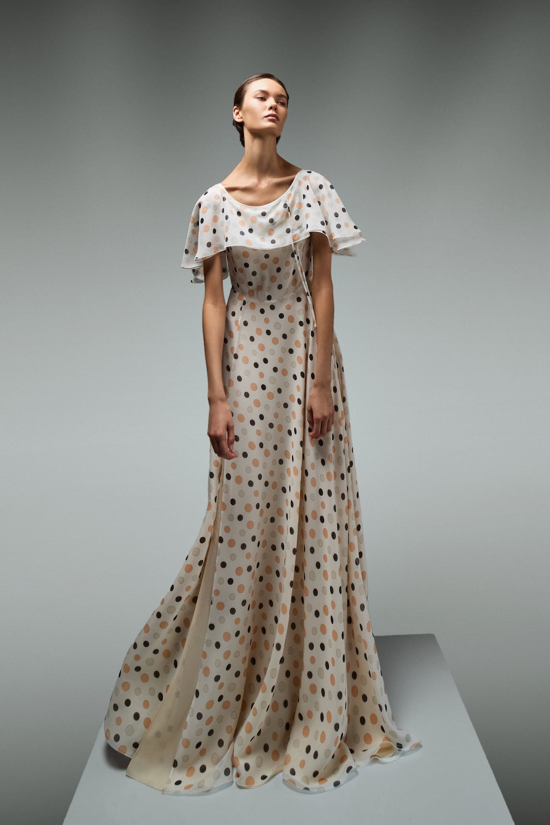 Le cappe di georgette nude sono un capolavoro di architettura del tessuto, che si ricompone sul corpo, guidato dai piping di raso ai bordi.