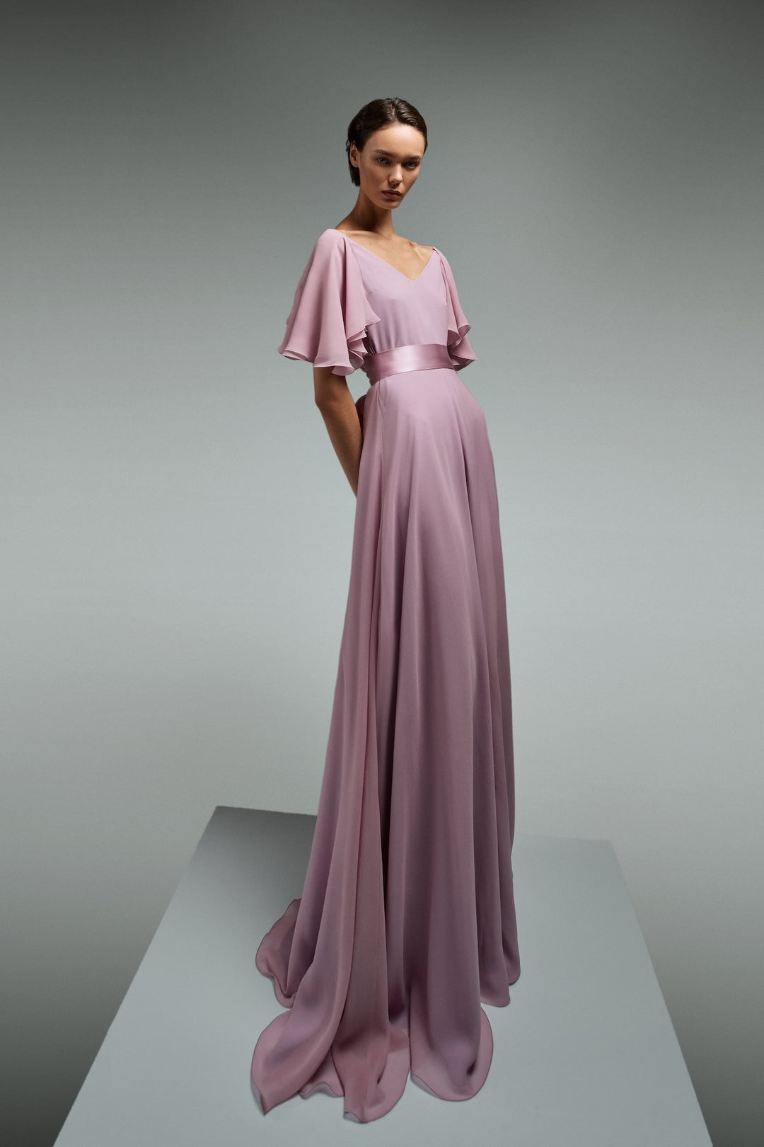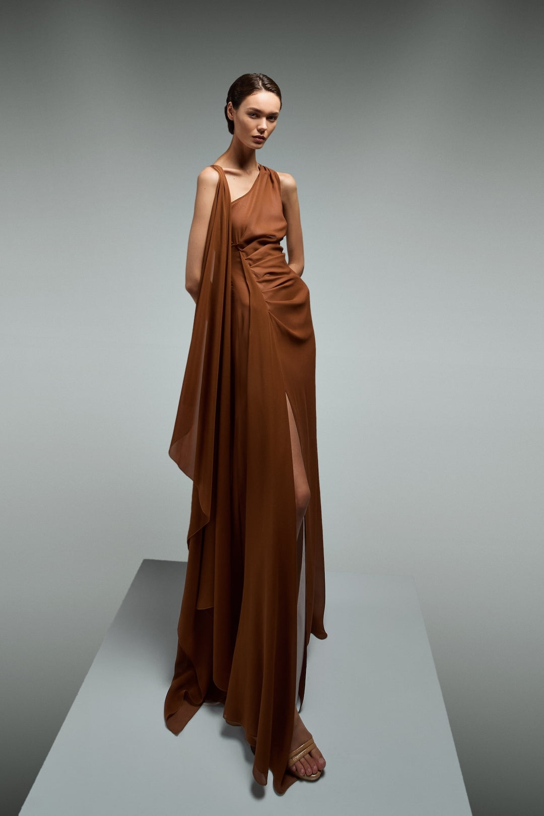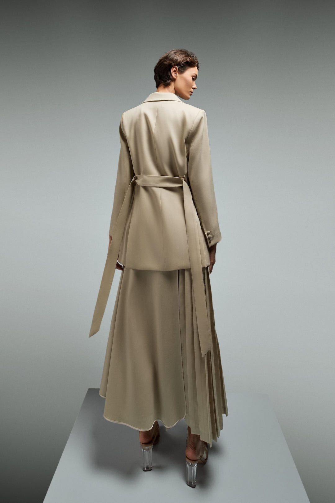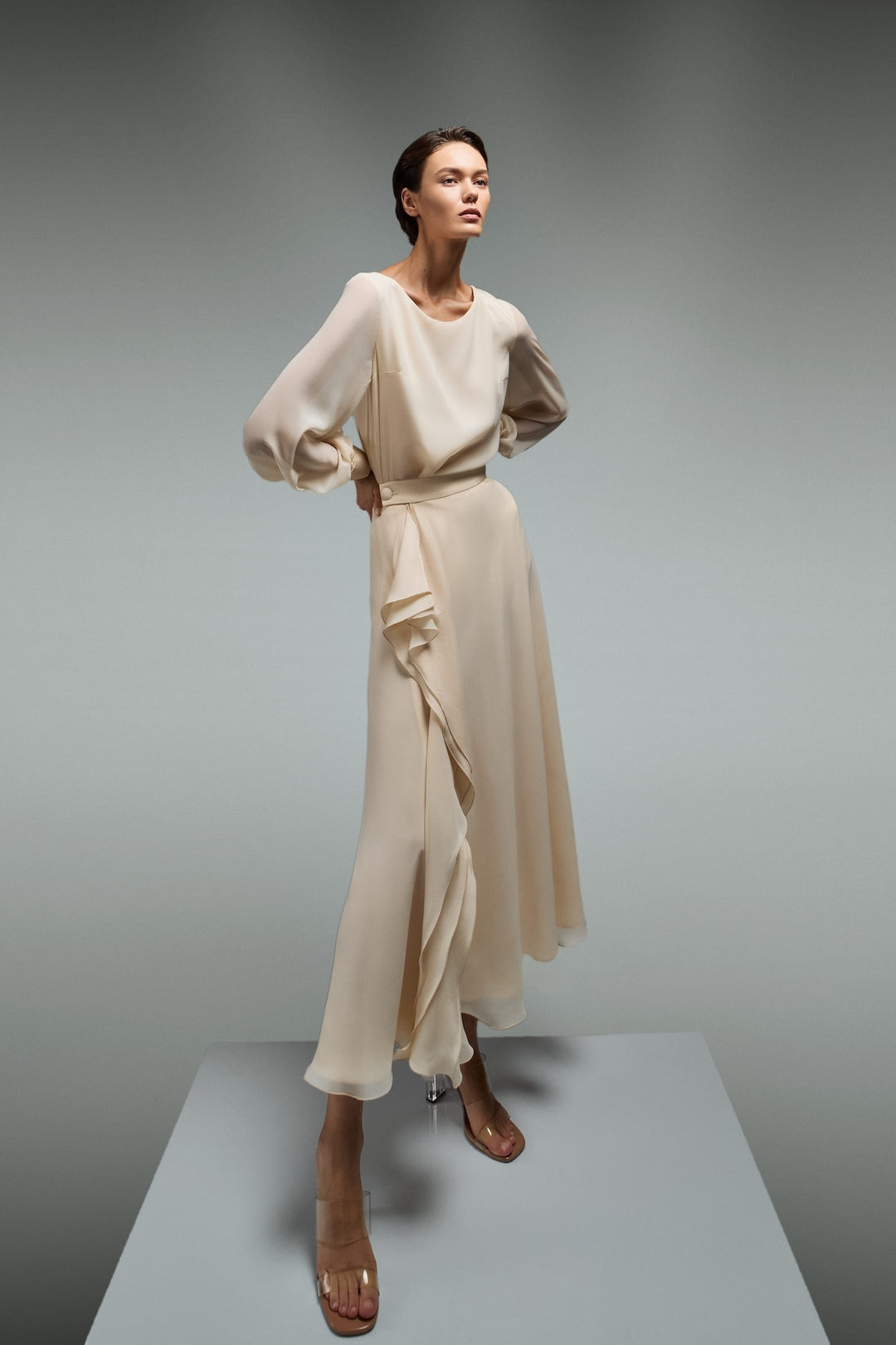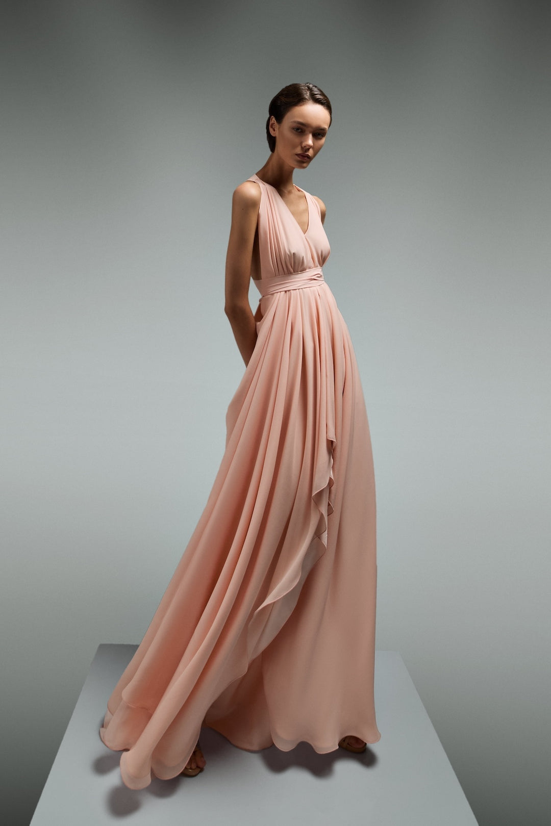 Le cappe di georgette nude sono un capolavoro di architettura del tessuto, che si ricompone sul corpo, guidato dai piping di raso ai bordi.