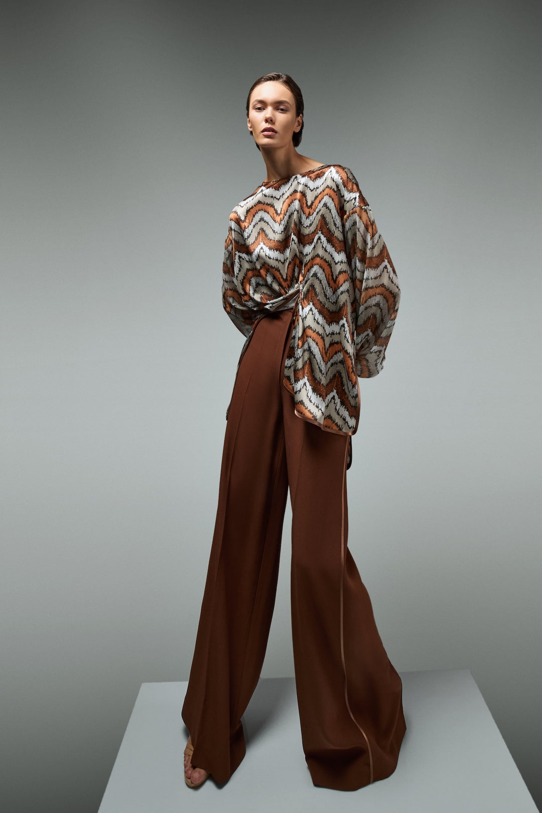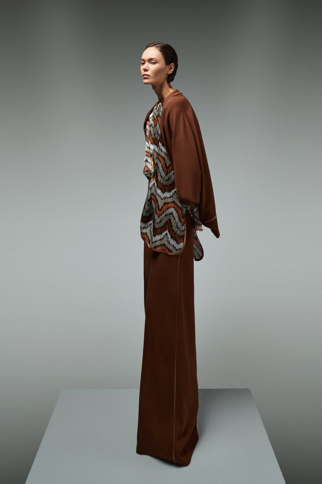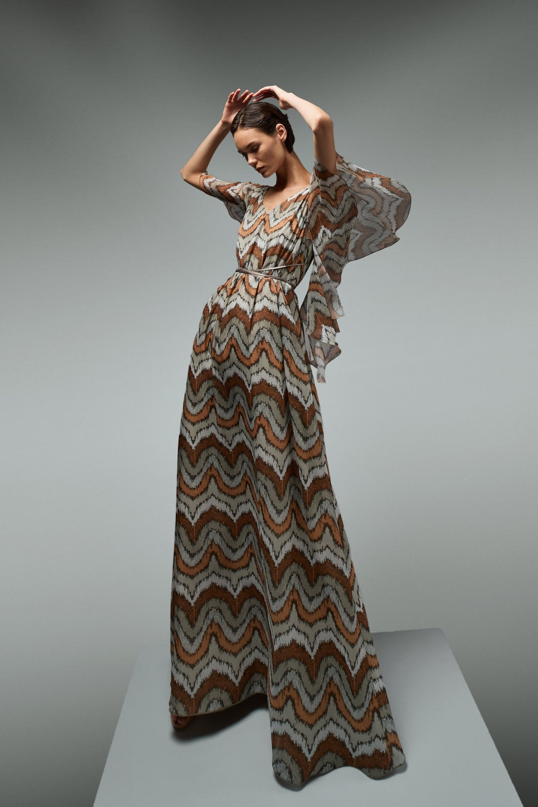 Caftani di georgette animalier sposano blu, marroni, sabbia, segnando il punto vita con cinturini in raso di seta e lasciando aperta la linea delle spalle, con maniche riprese sull’avanbraccio.