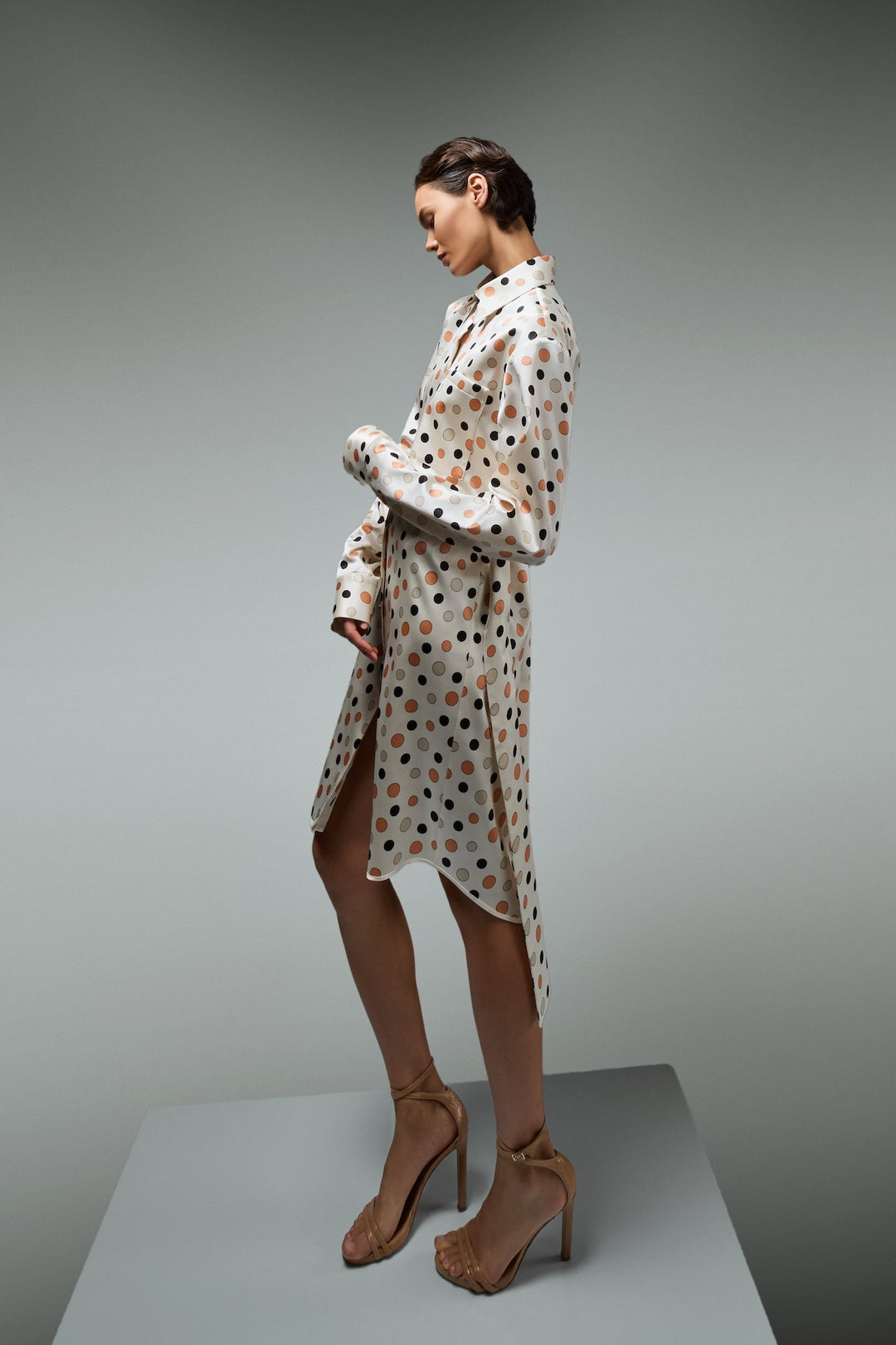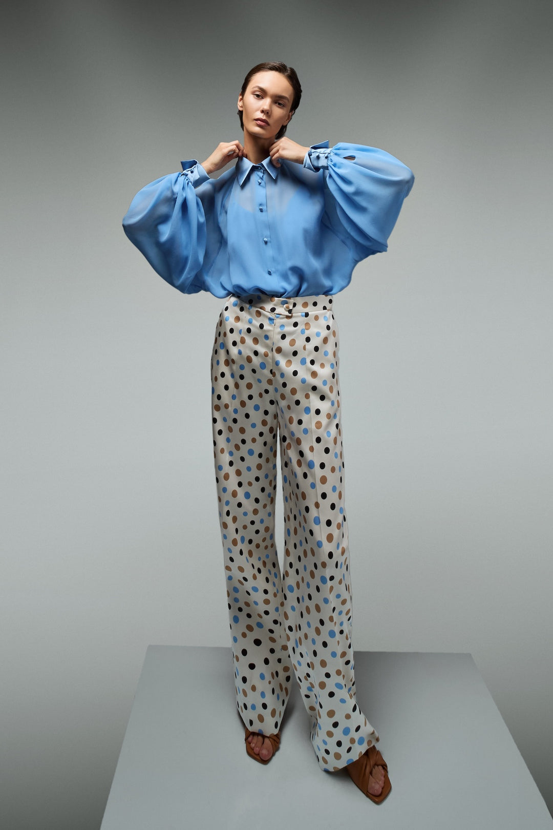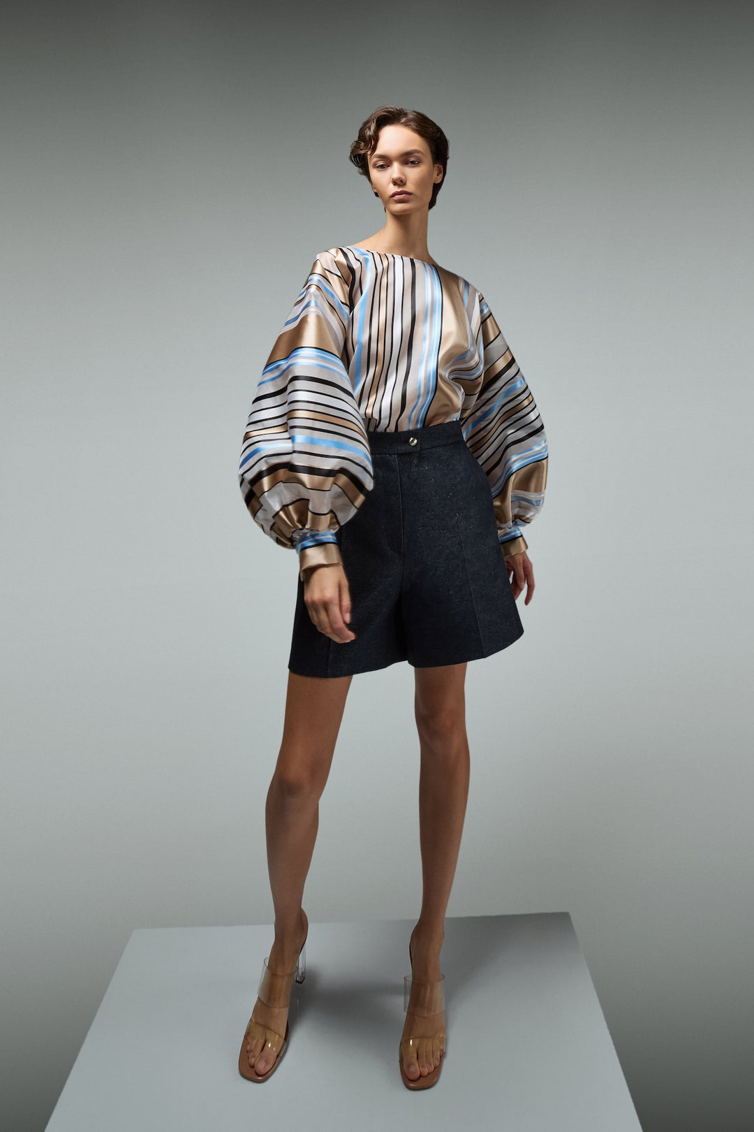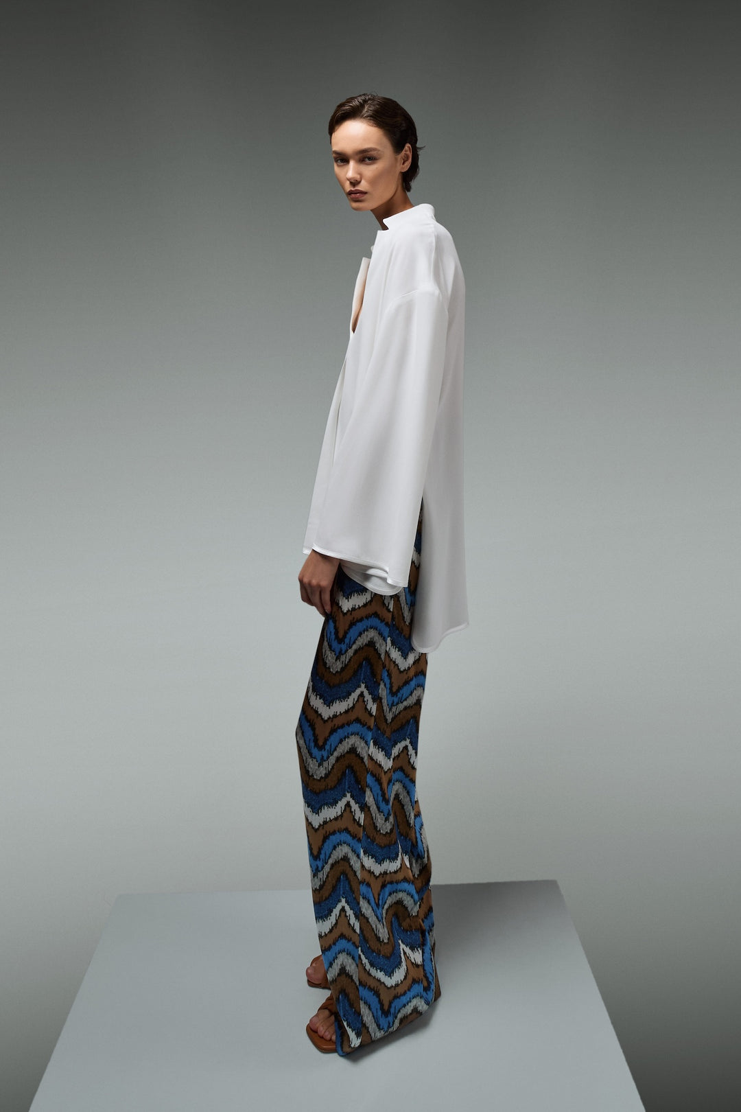 Caftani di georgette animalier sposano blu, marroni, sabbia, segnando il punto vita con cinturini in raso di seta e lasciando aperta la linea delle spalle, con maniche riprese sull’avanbraccio.