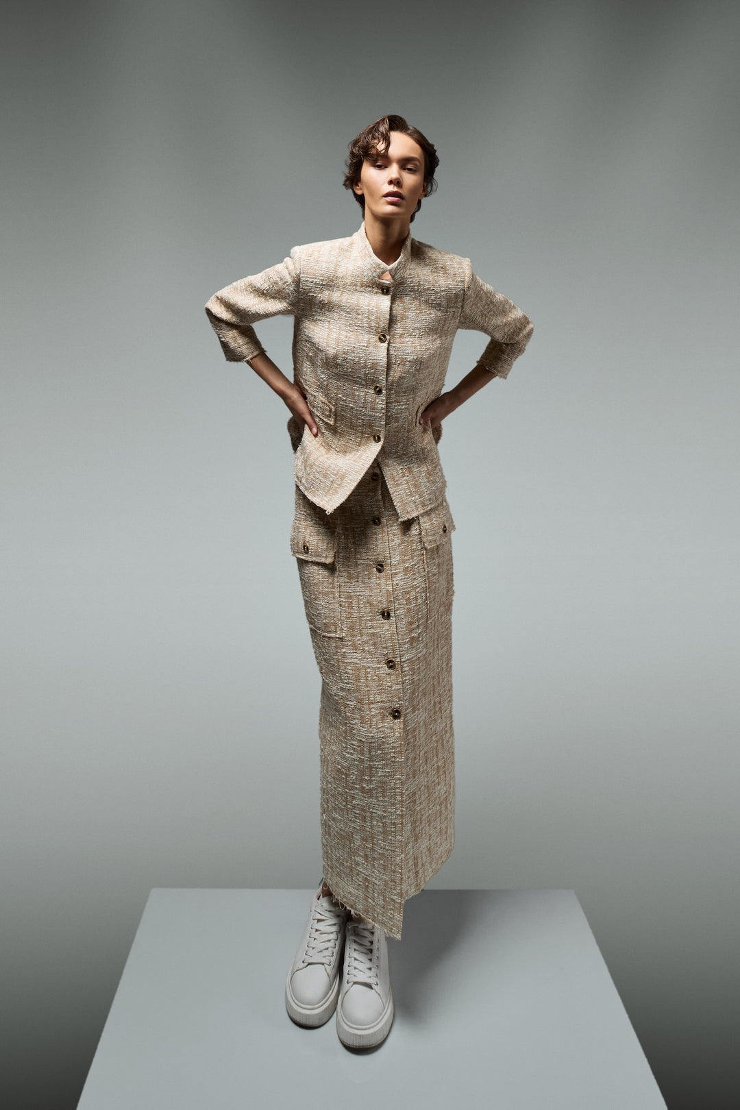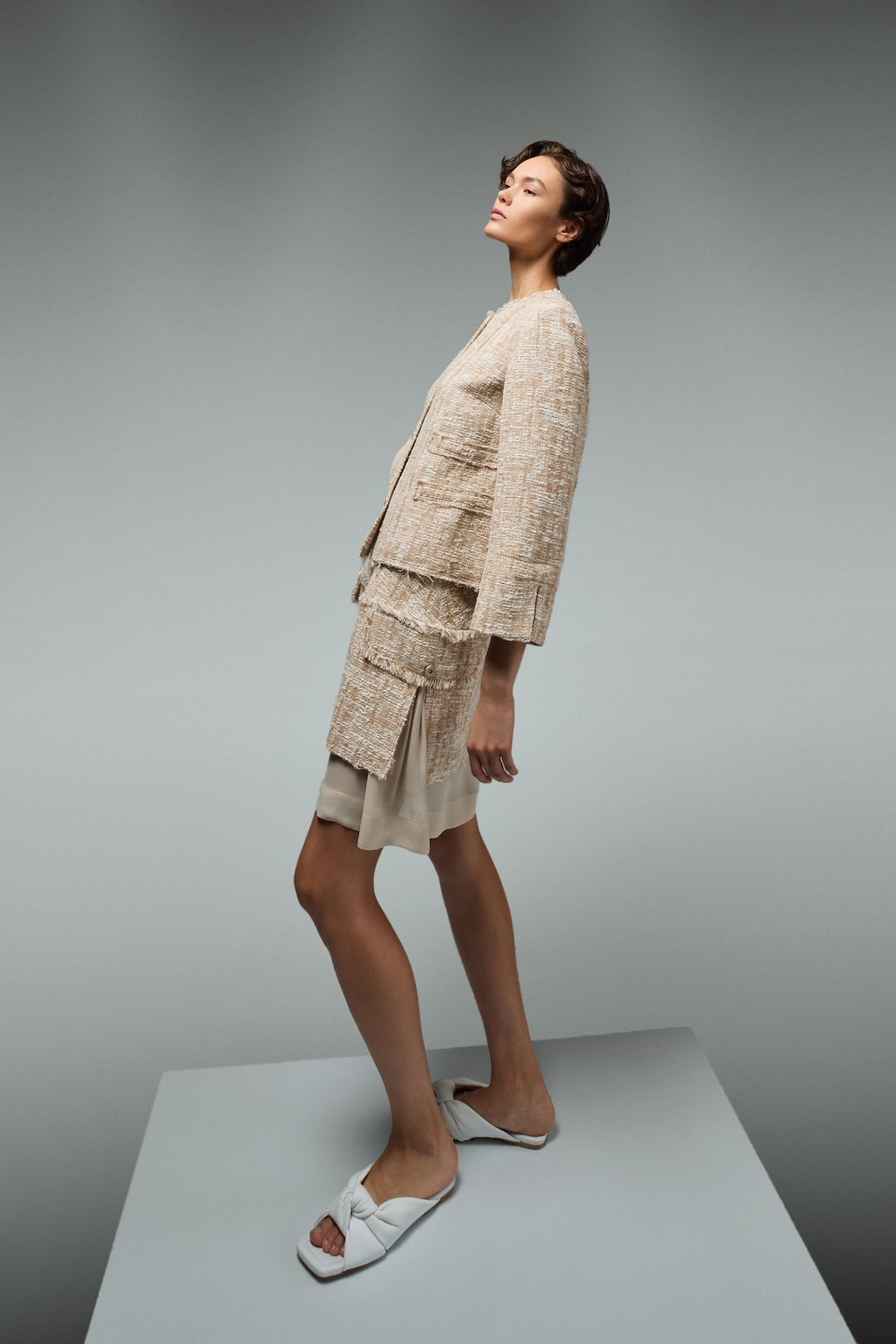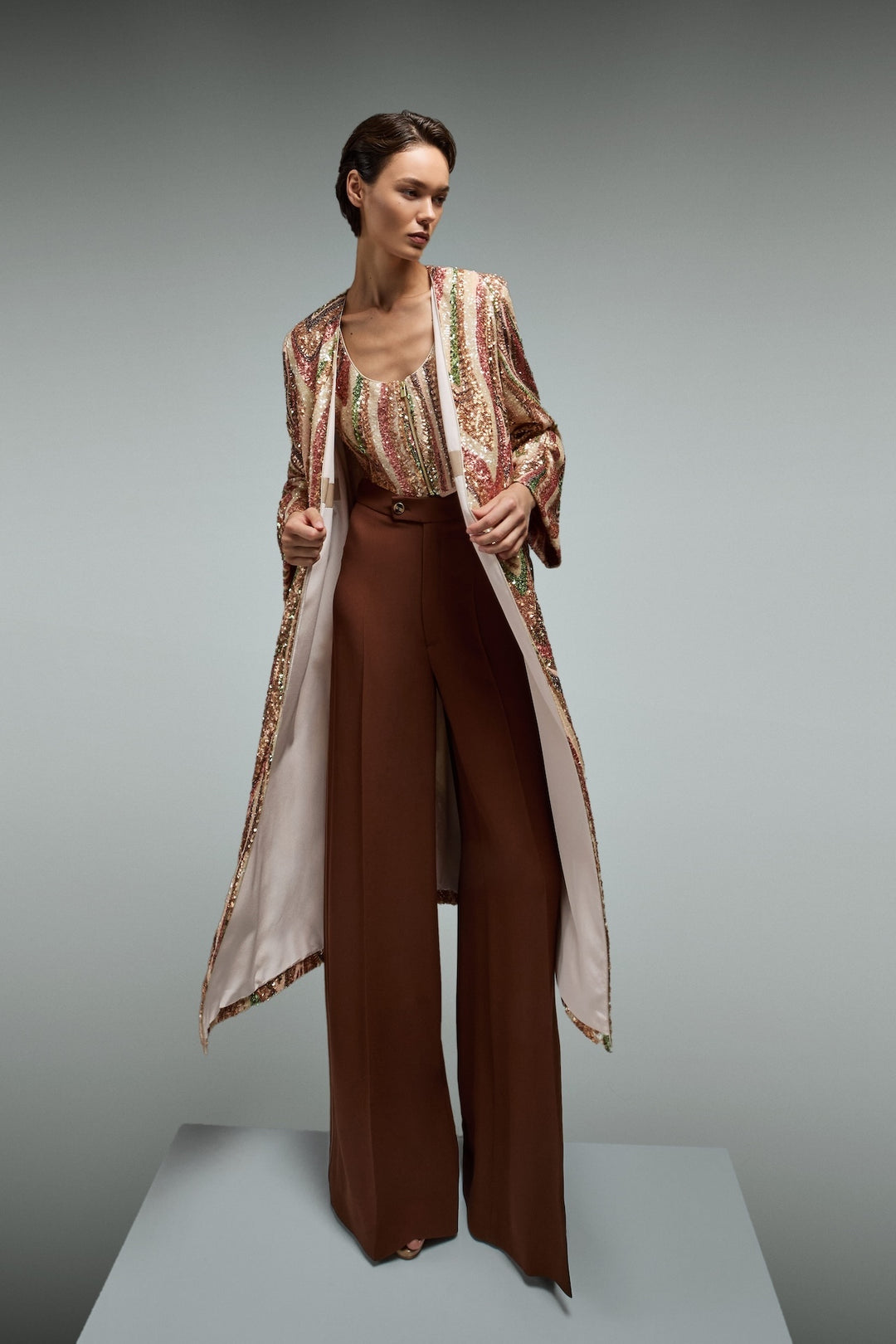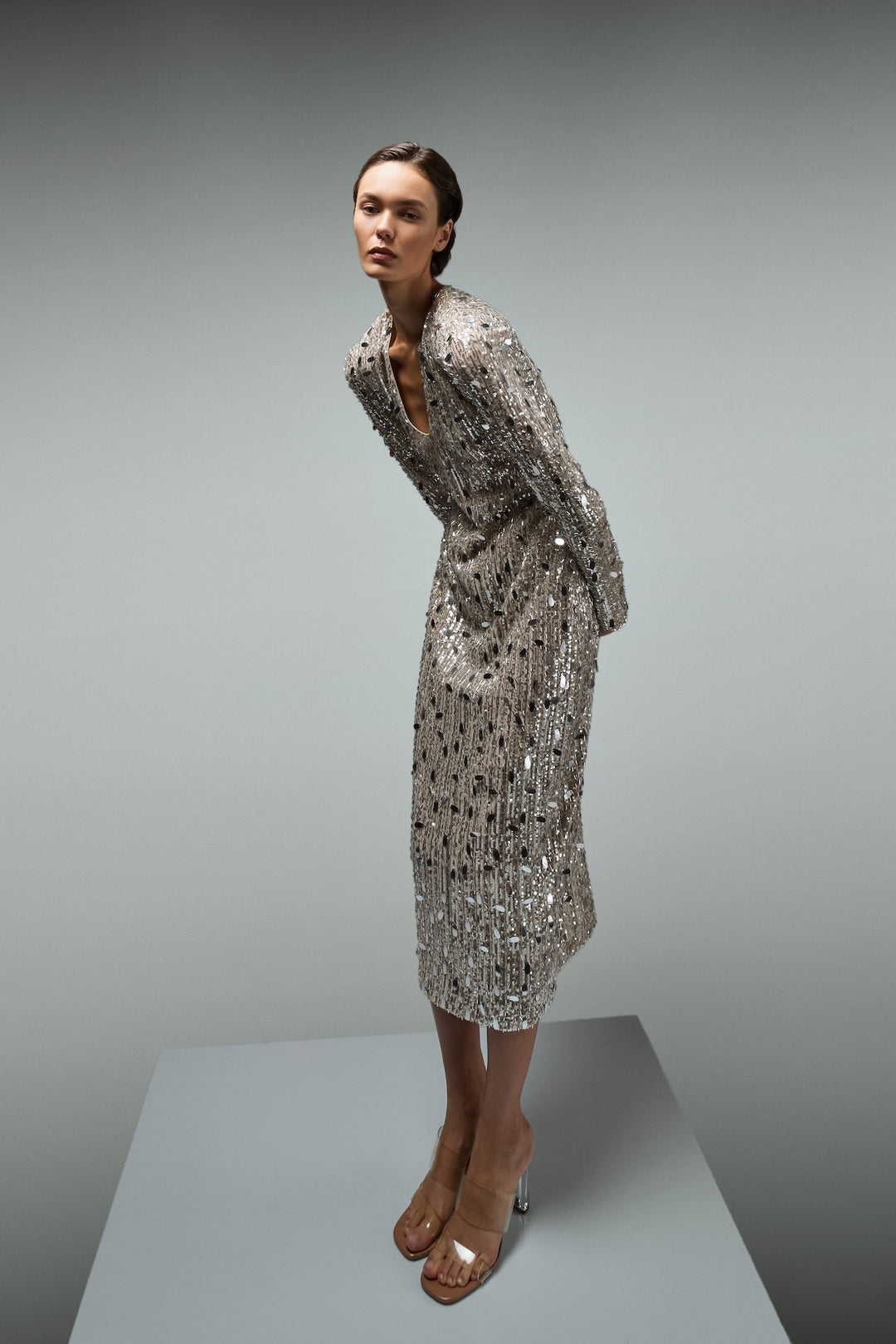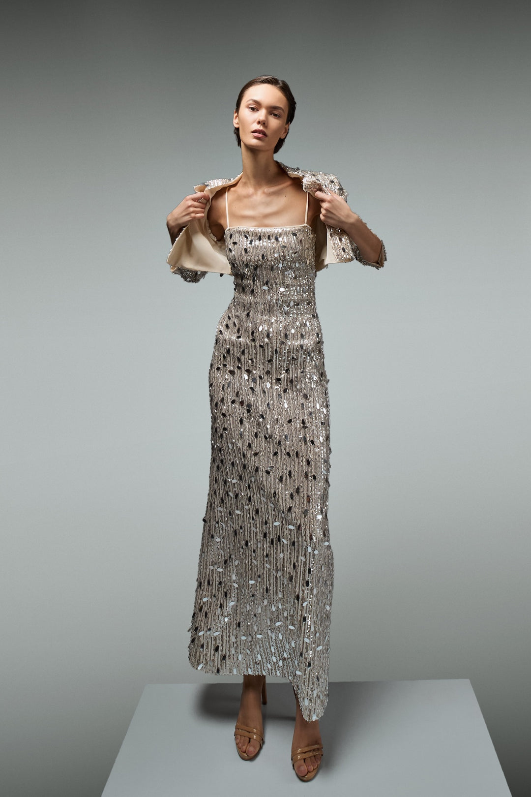 Sempre le paillettes, minuscole e potenti, giocano con i bronzo mixati al verde giada sulle gonne midi, gli spencer sartoriali, le piccole giacche da torero modulate sullo stile flapper.