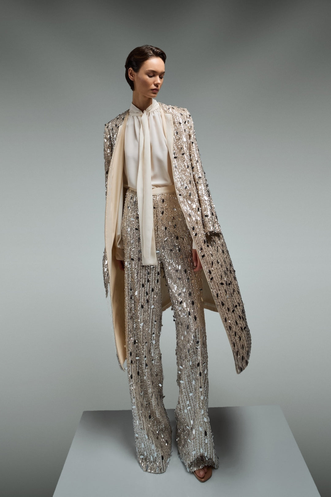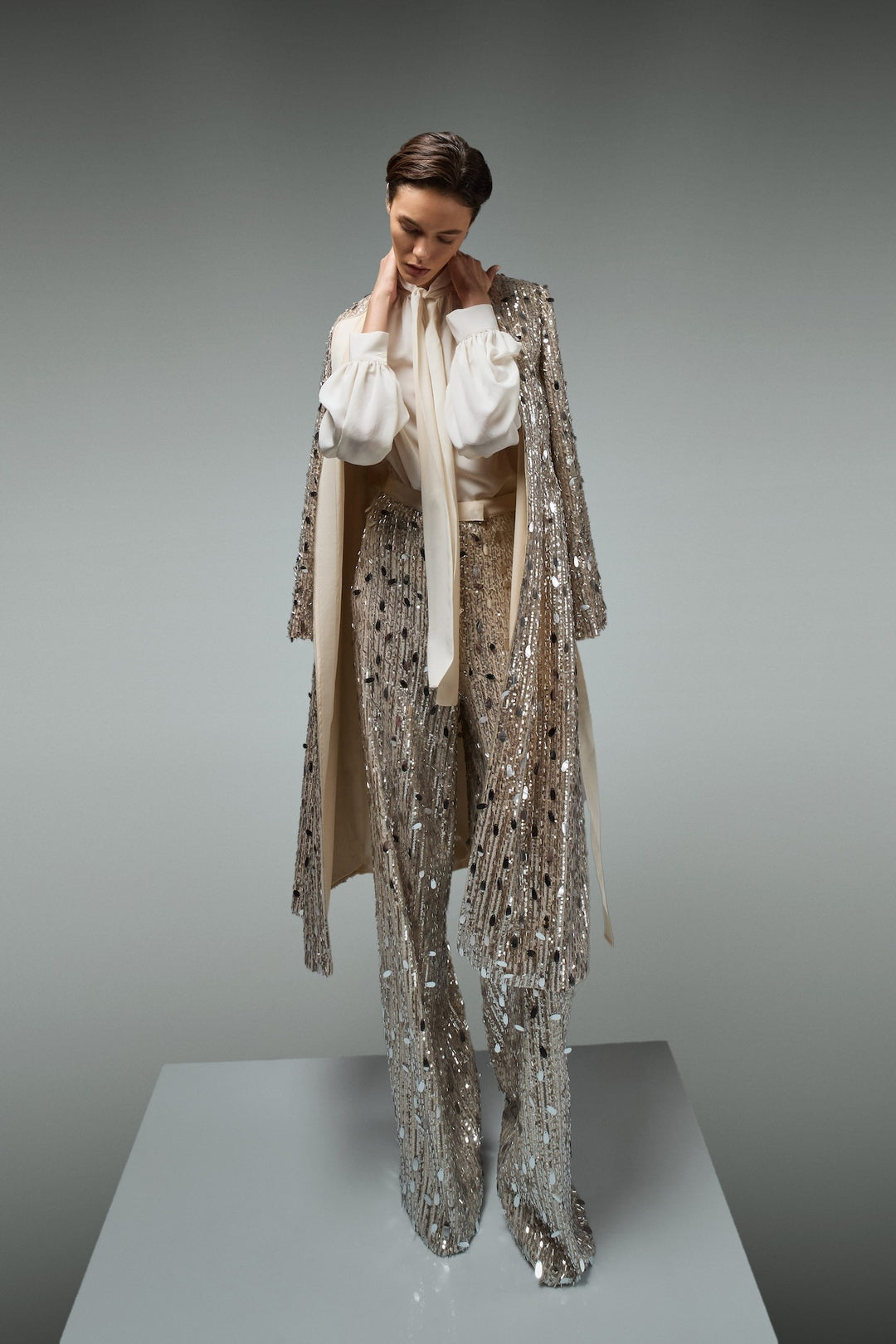 E’ come se su ogni abito si accendesse la luce soffusa del sogno, un po’ come quando Marion Cotillard entra da Chez Maxime, in Midnight in Paris e tutto è rivestito da un’aura di magia: qui la regia va alle micropaillettes applicate su tulle, nei lunghi blazer dove le sequin gold ospitano piccoli specchietti che si colorano di luci diverse.