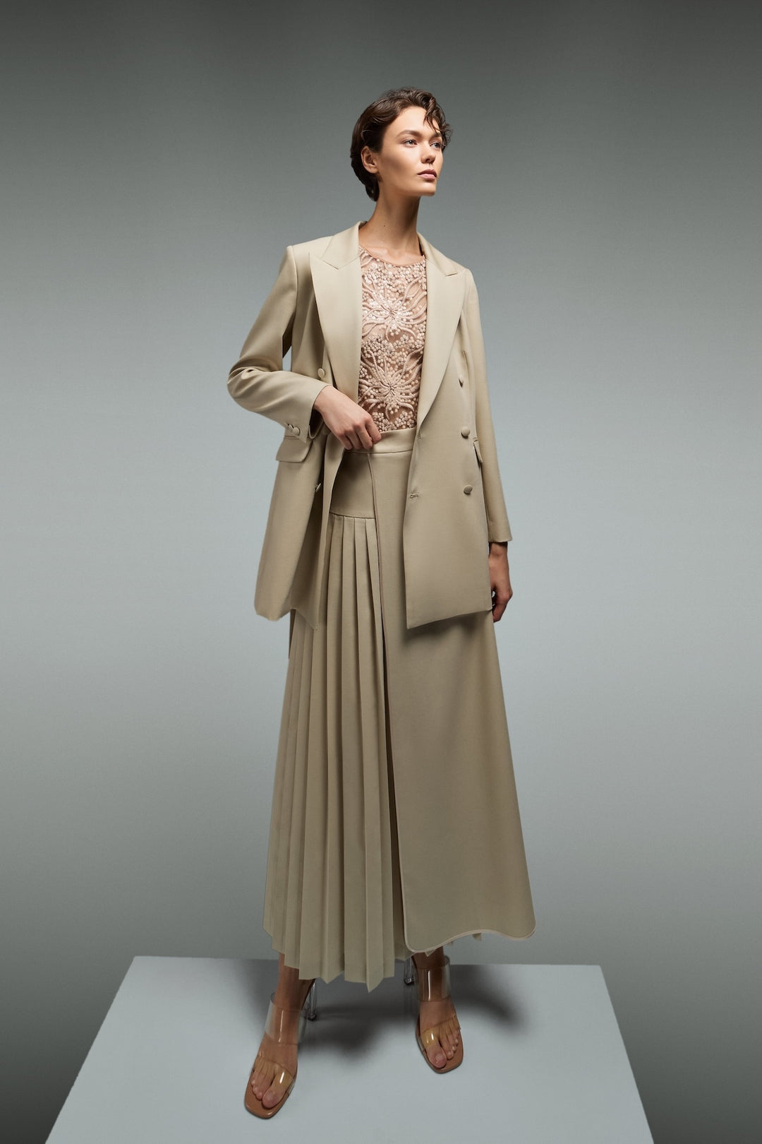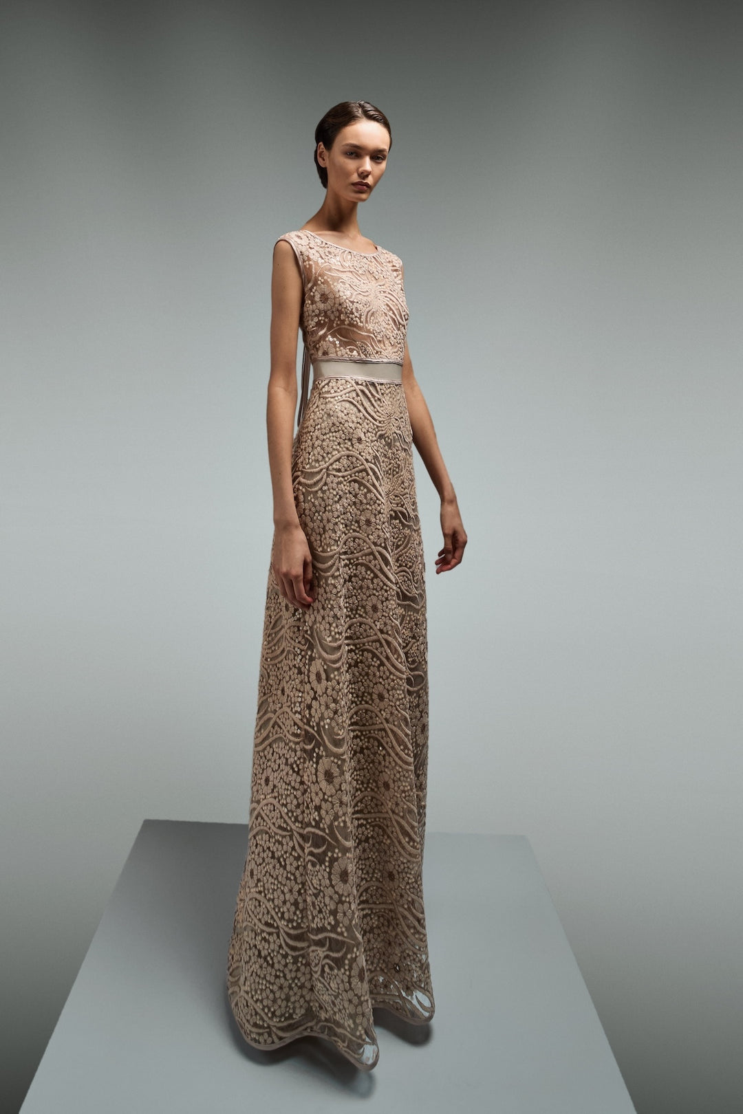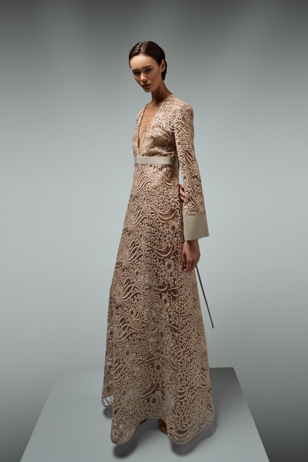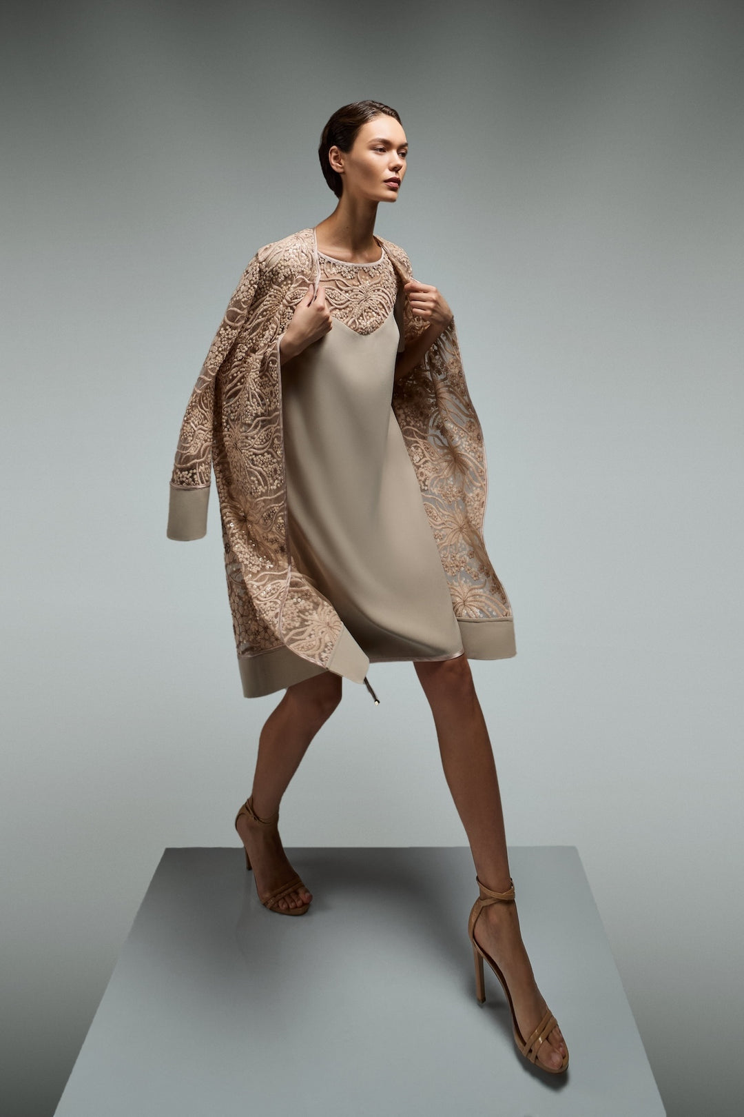 Le alchimie si giocano sulla leggerezza: plastron di tulle ricamato in paillettes ton sur ton, sugli abiti in crèpe color mura di Gubbio.