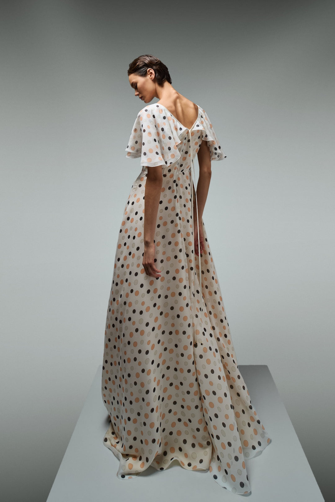 La sensualità è aulica, delicata. Da diva del muto di inizio secolo, avvolta in trame evanescenti, accarezzata dalle trasparenze e dai toni soffici, nude, che aprono delicatamente la schiena con il tocco della georgette.