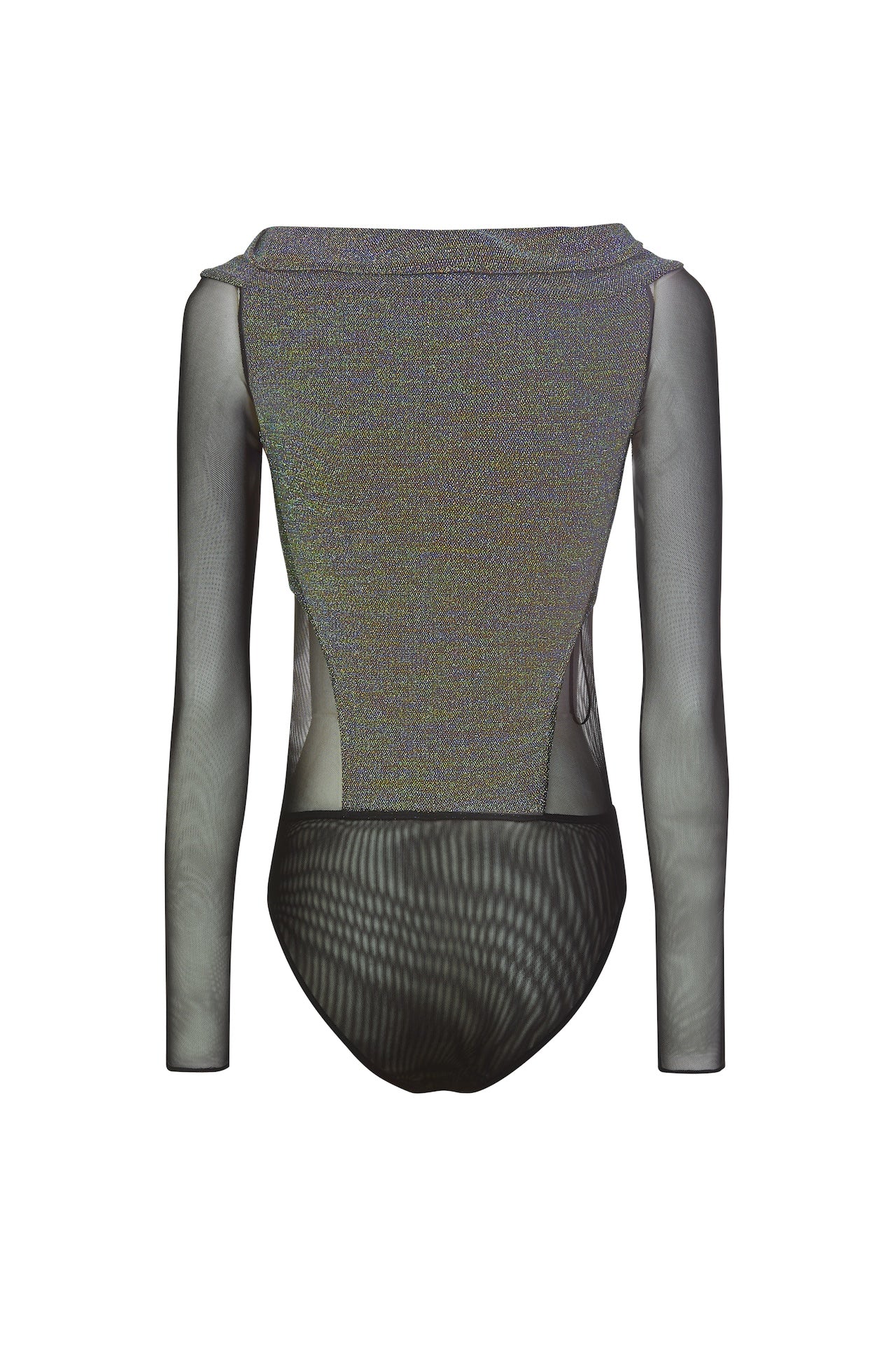 Descrizione:Body in jersey lurex con scollatura a barca, maniche e parte sotto in tulle elasticizzato.