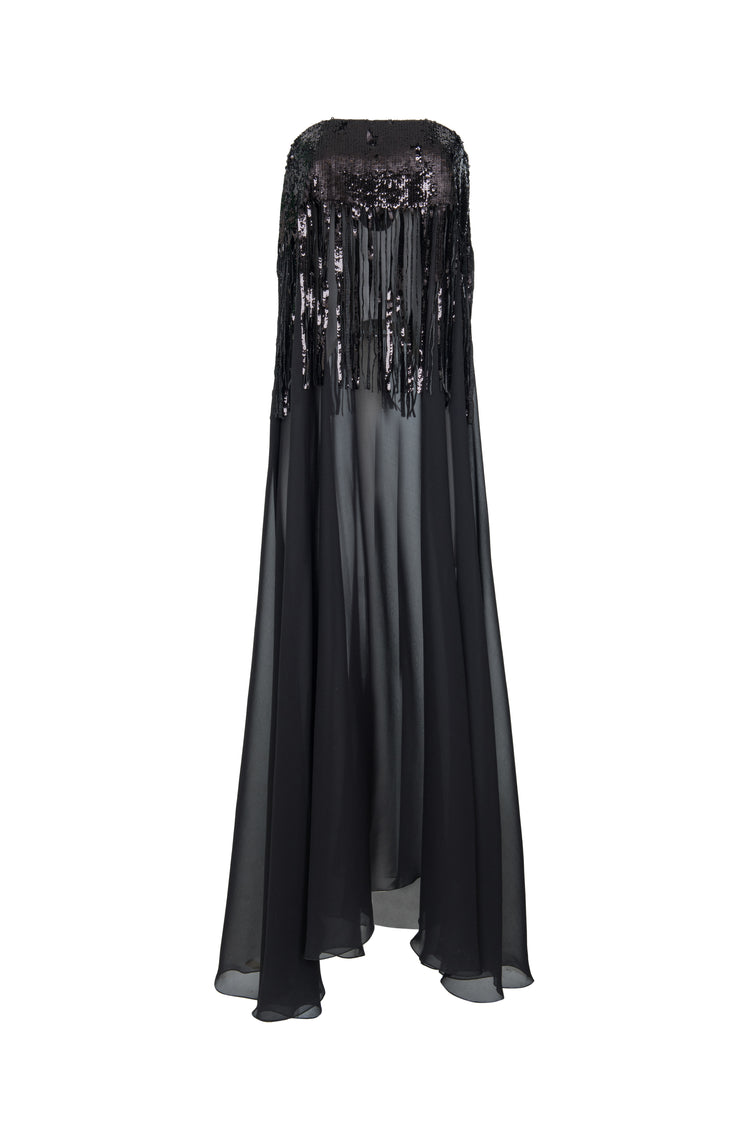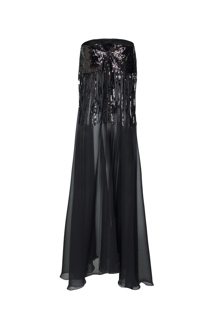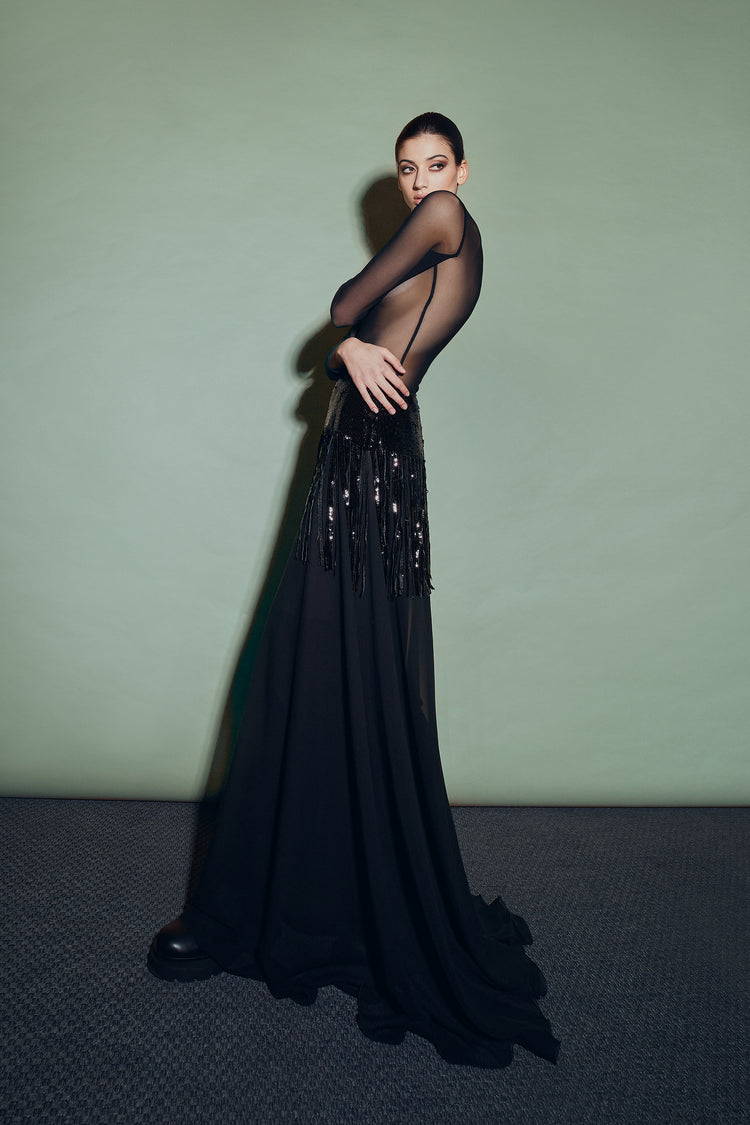 Descrizione: Gonna in georgette in seta, paillettes in vita creano un doppia gonna in sovrapposizione